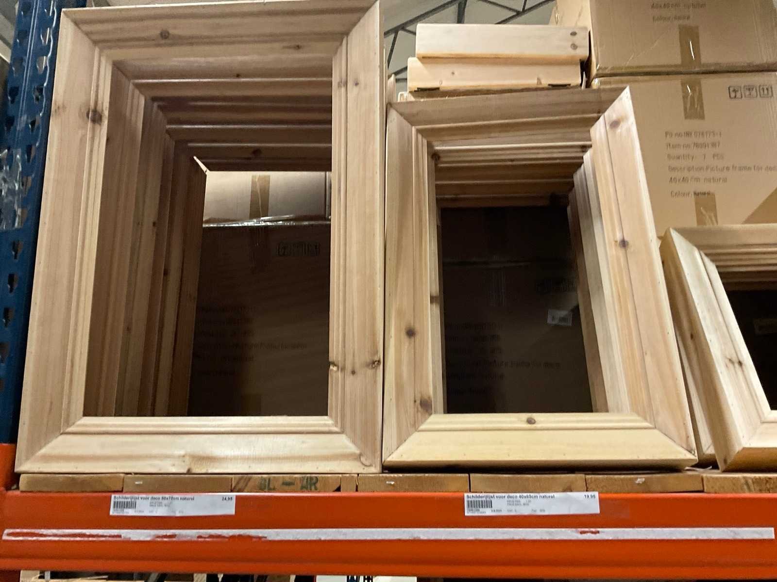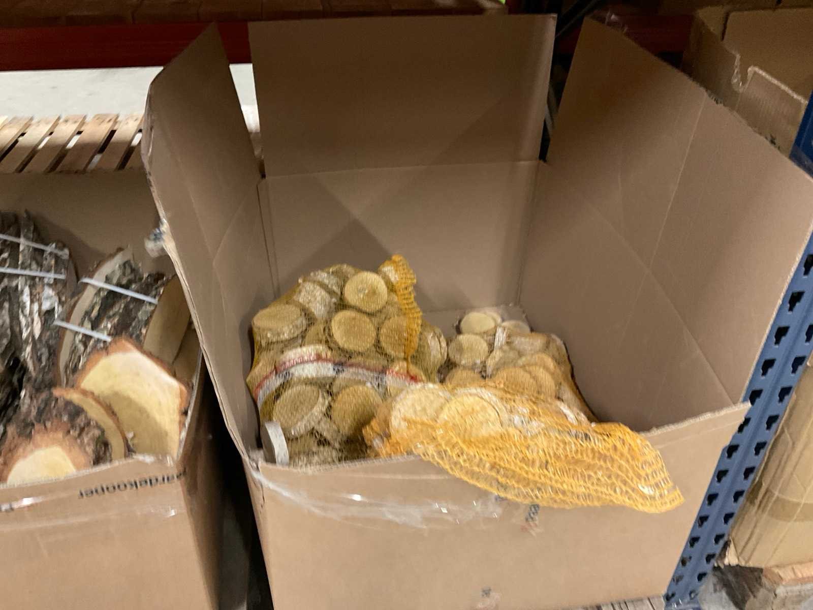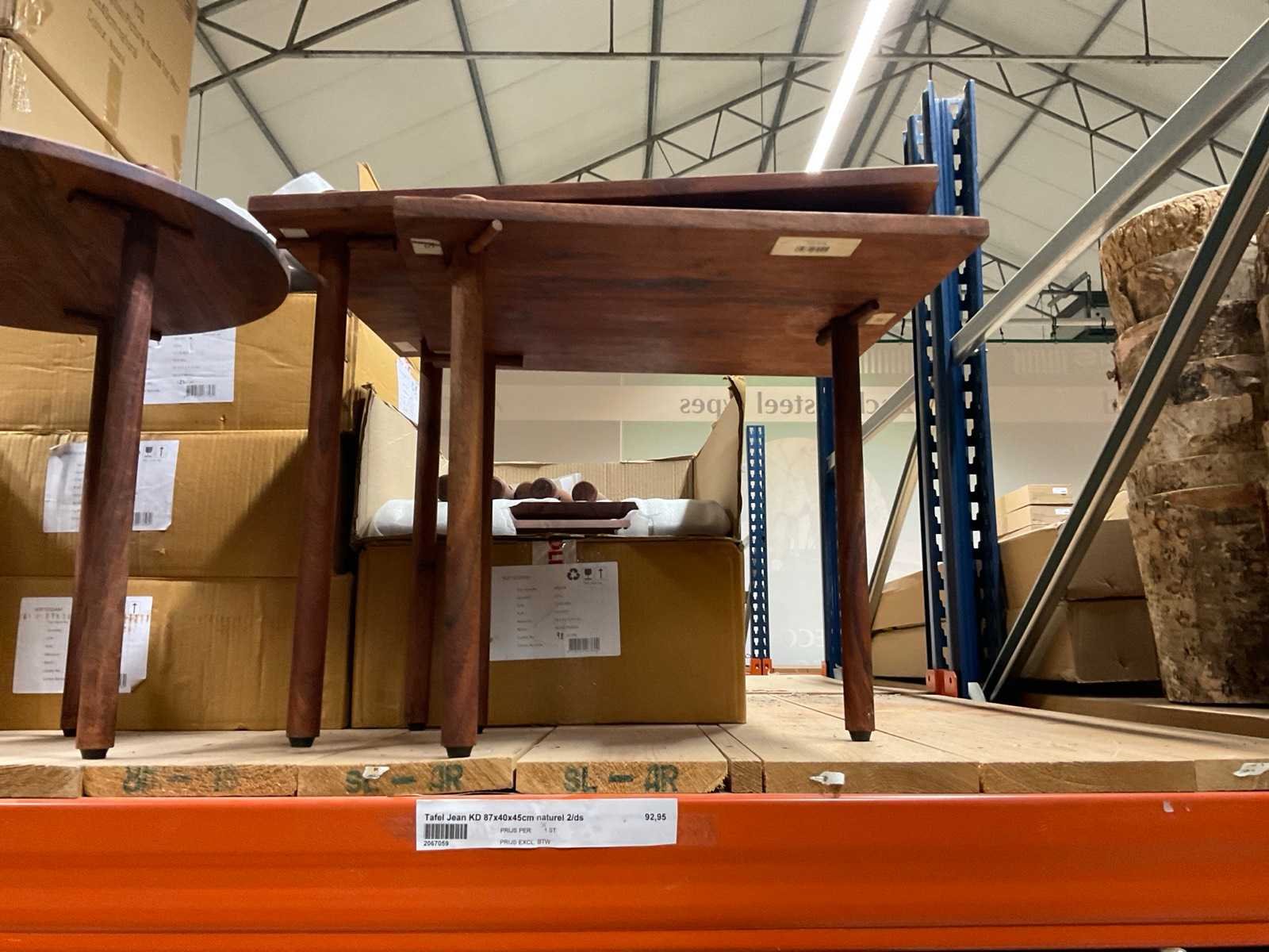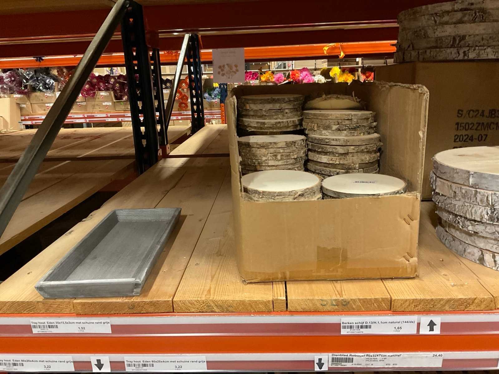 Inhoud van 1 sectie van stelling bestaande uit diverse afmetingen dienbladen, tafeltjesen boomschijven, exclusief stelling.