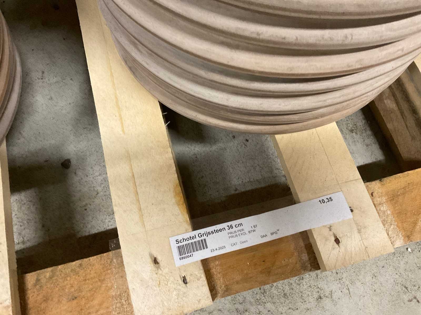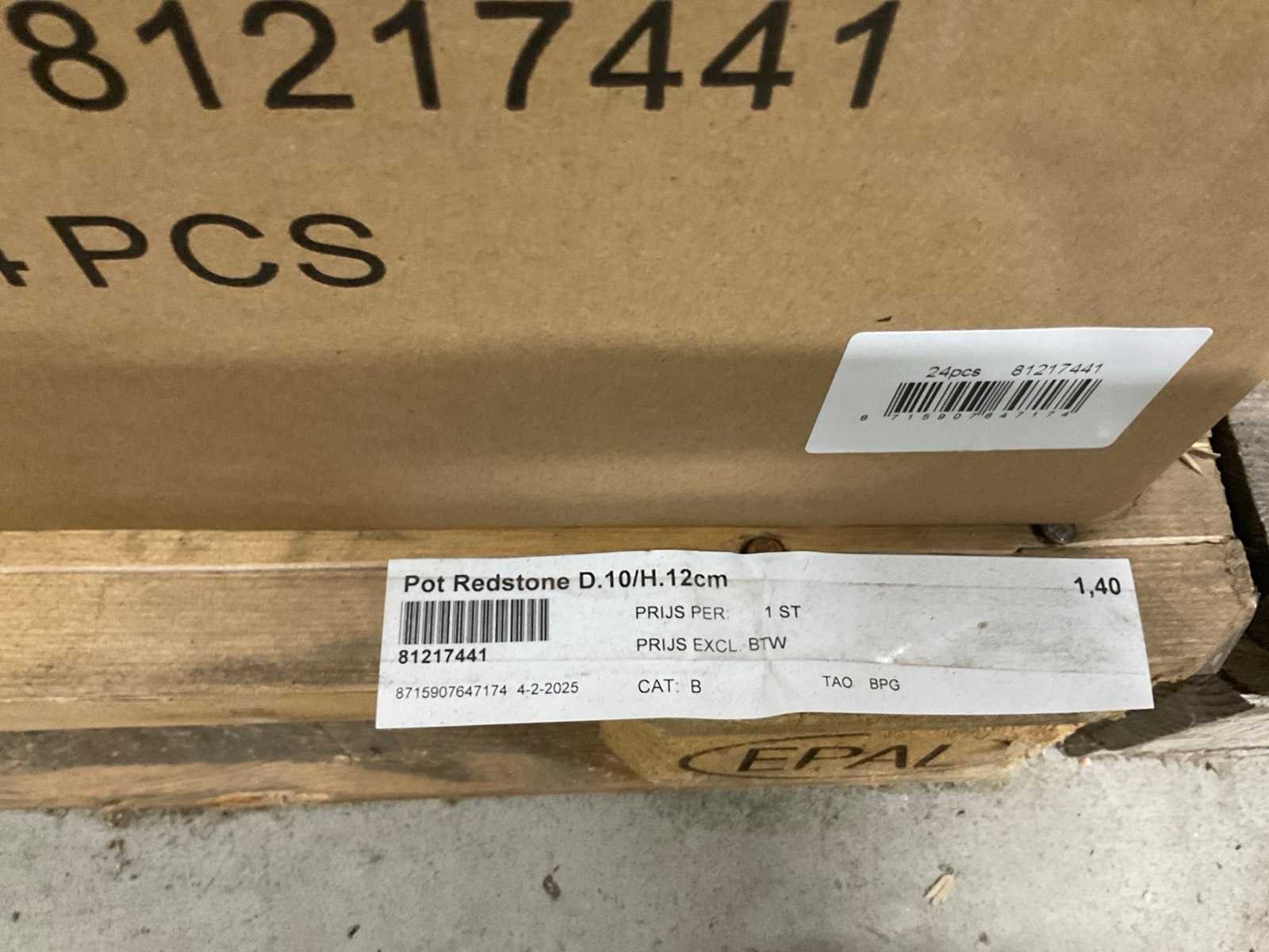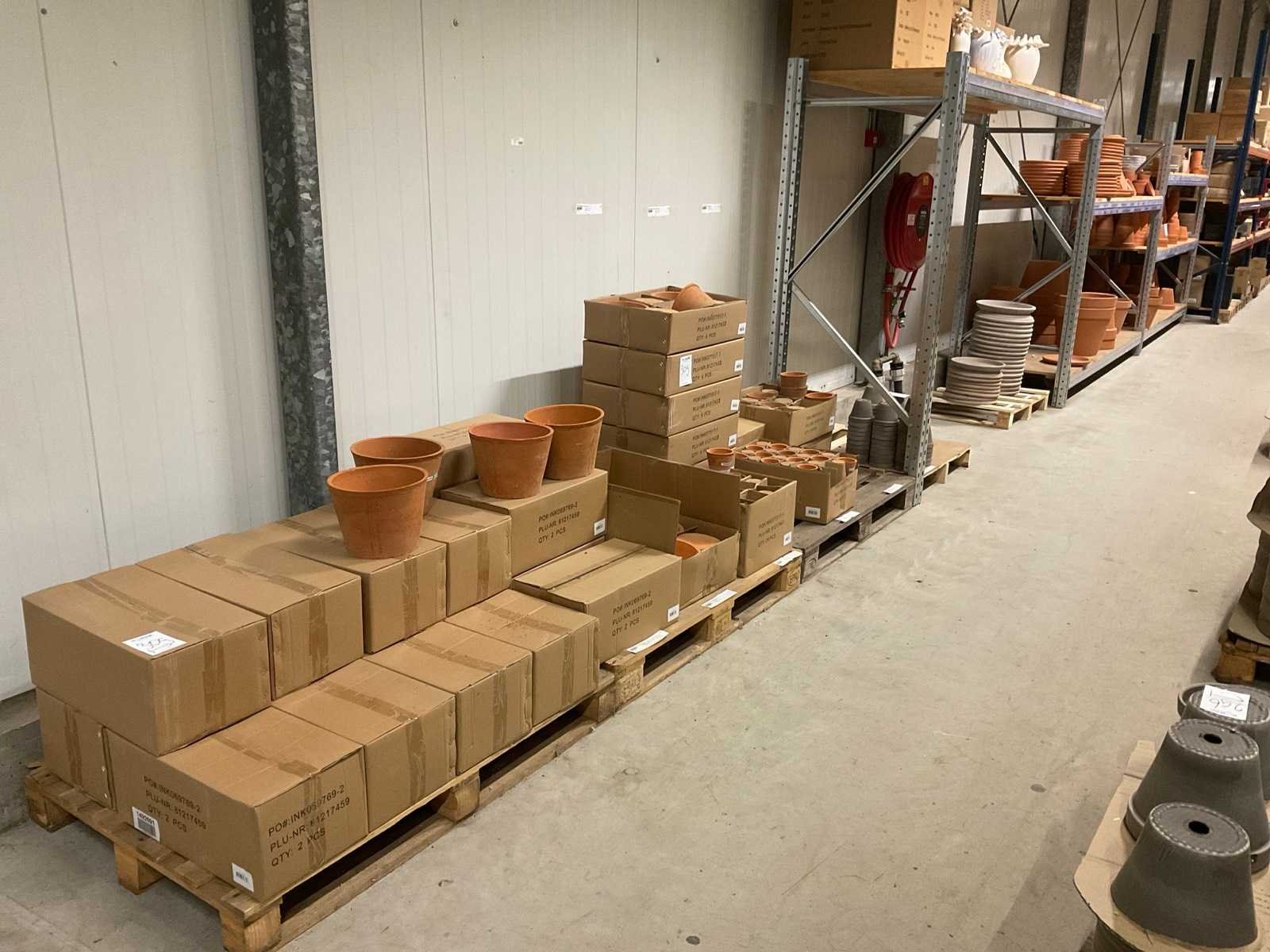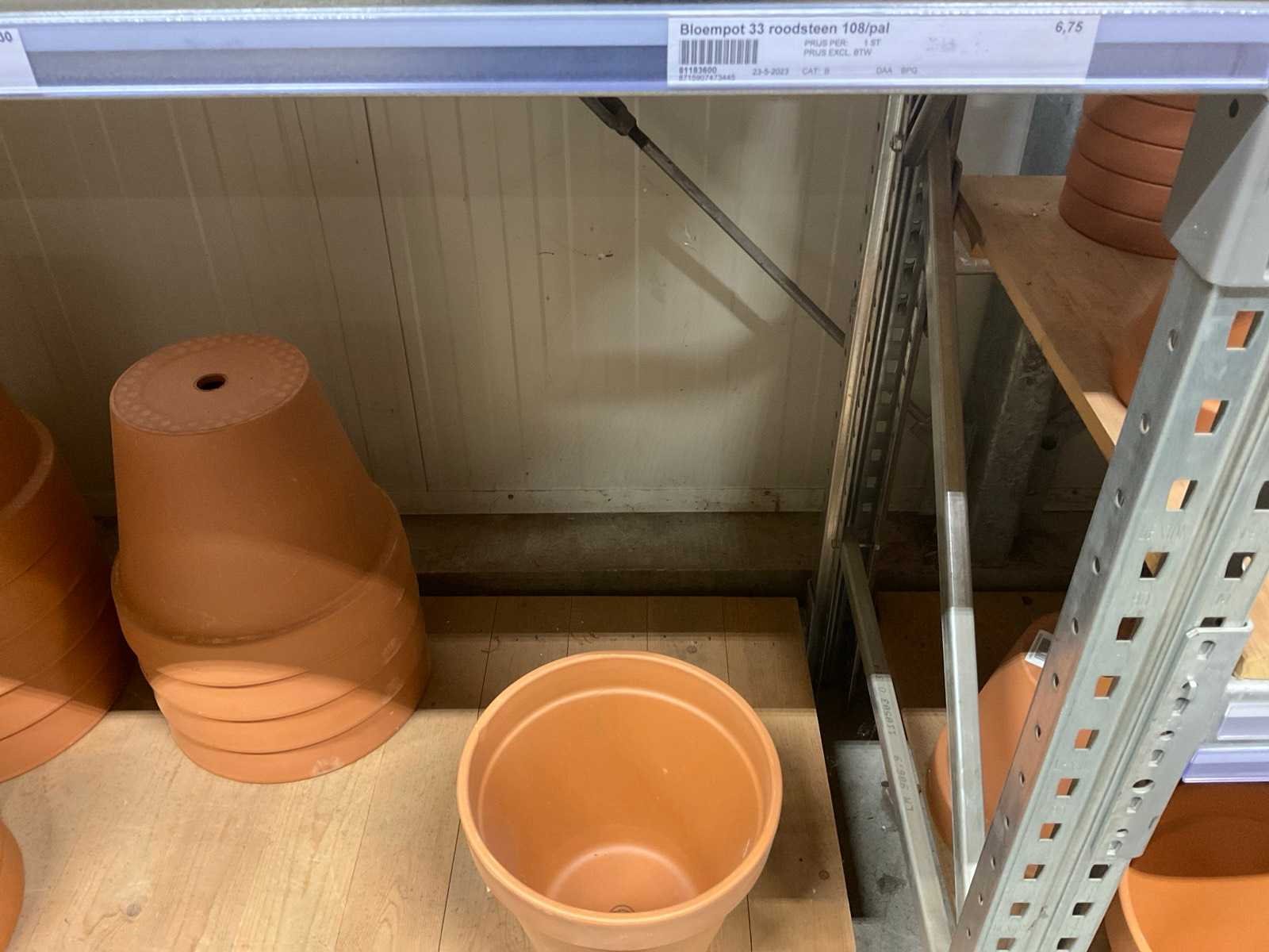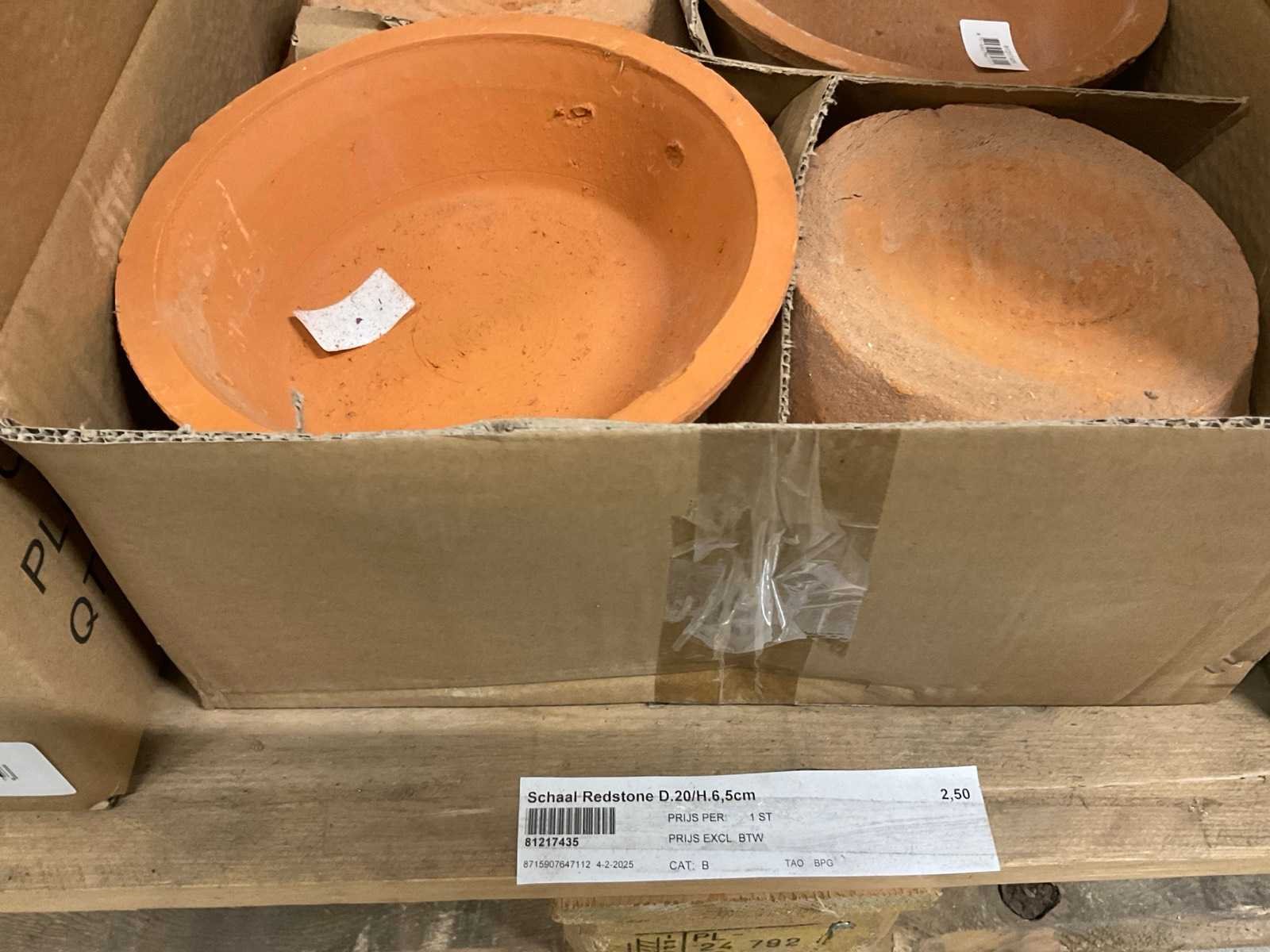 Diverse potten en schalen op en in stelling, in diverse maten en modellen, w.o. Redstone, grijssteen op 5 pallets en in stelling, inclusief pallets, stelling niet inbegrepen, vazen bovenop horen bij kavel 278.