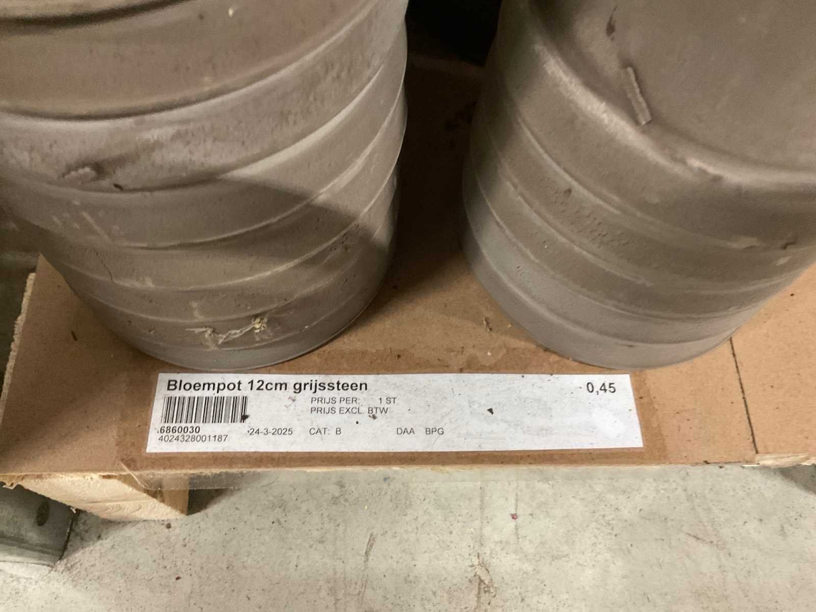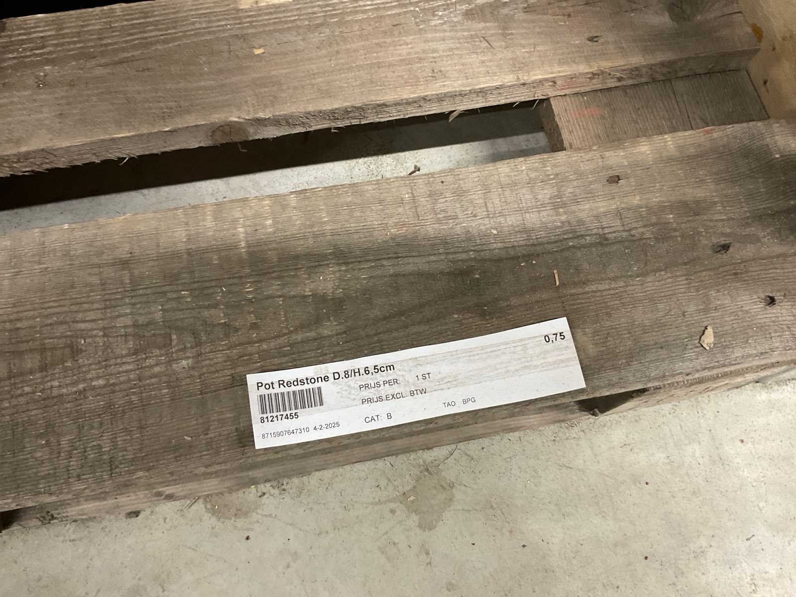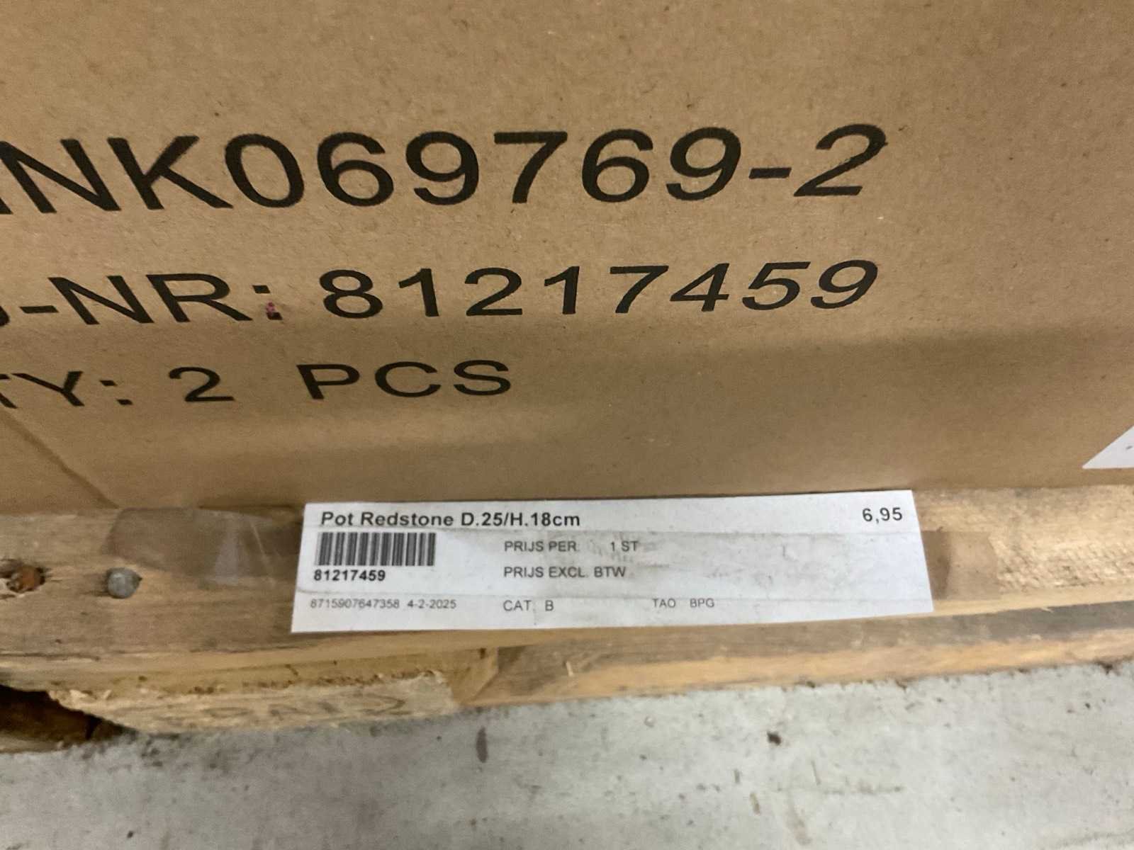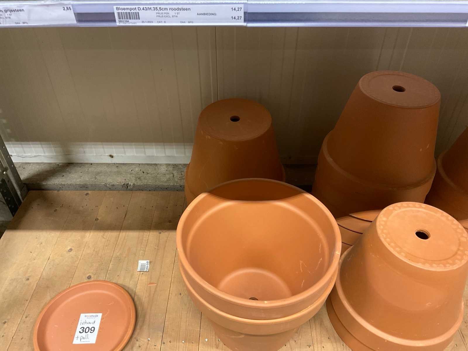 Diverse potten en schalen op en in stelling, in diverse maten en modellen, w.o. Redstone, grijssteen op 5 pallets en in stelling, inclusief pallets, stelling niet inbegrepen, vazen bovenop horen bij kavel 278.