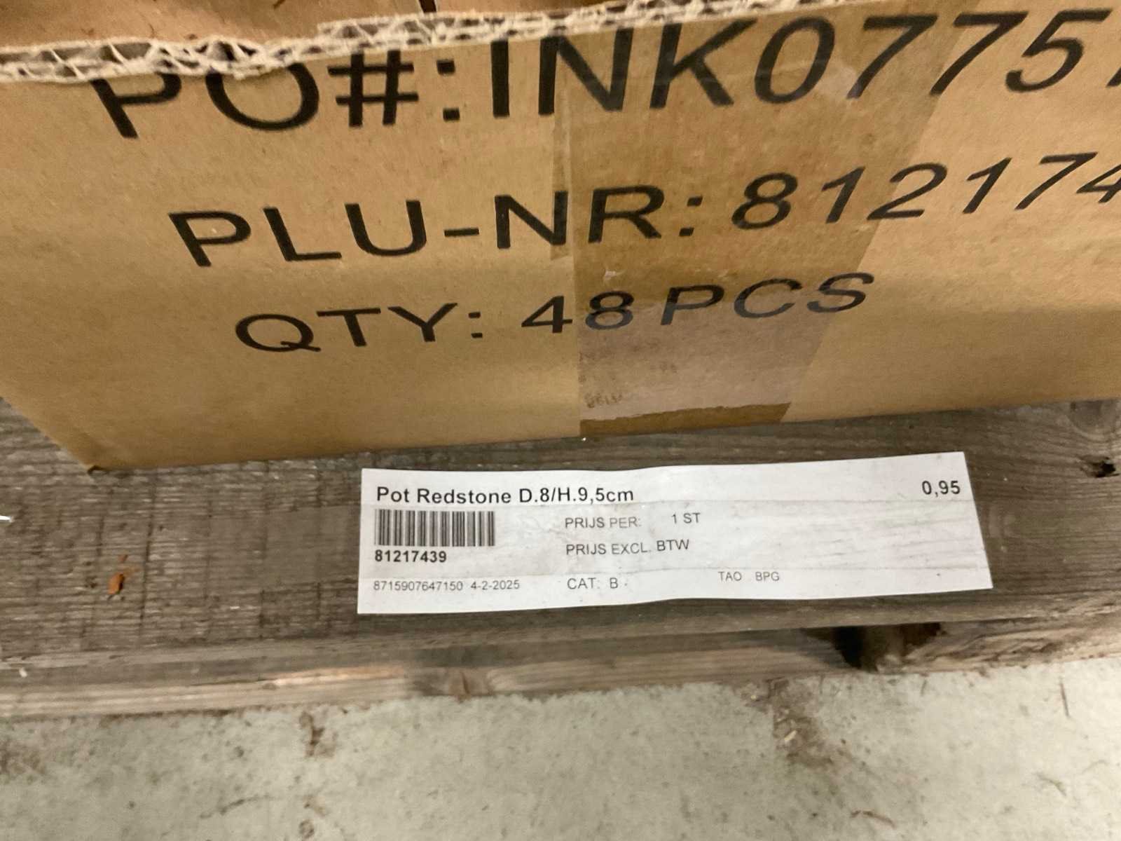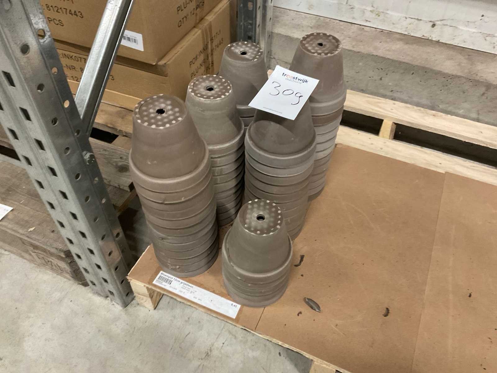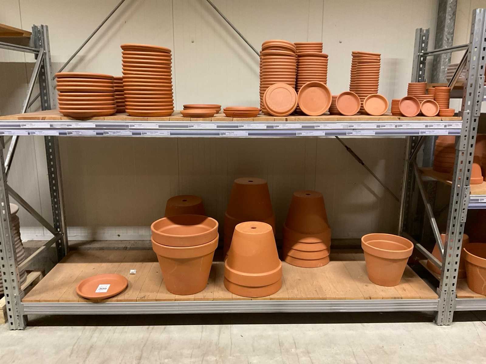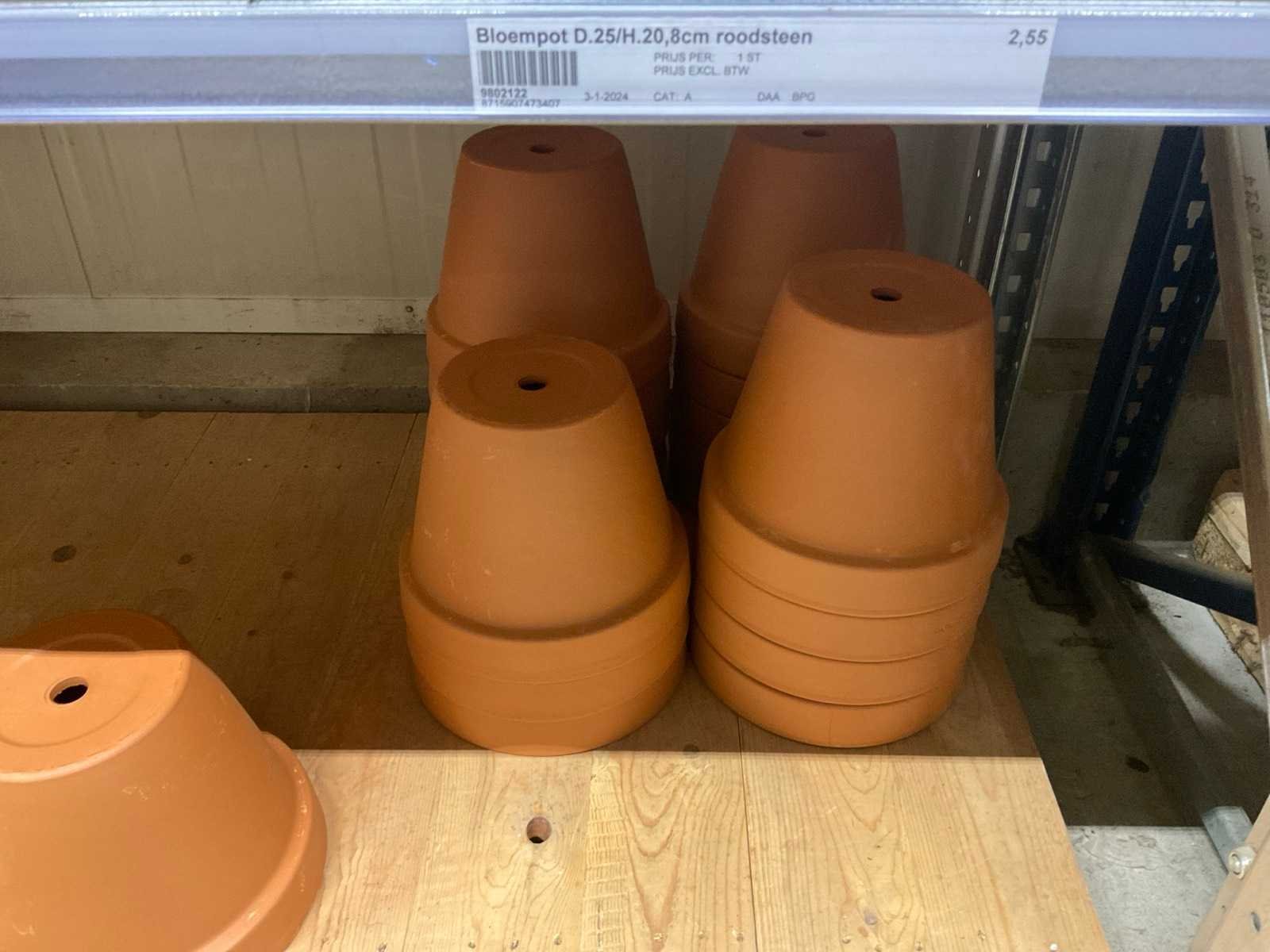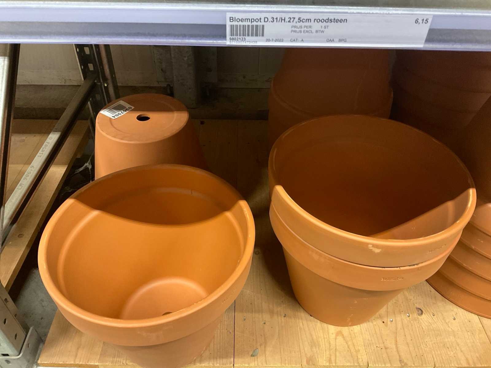 Diverse potten en schalen op en in stelling, in diverse maten en modellen, w.o. Redstone, grijssteen op 5 pallets en in stelling, inclusief pallets, stelling niet inbegrepen, vazen bovenop horen bij kavel 278.