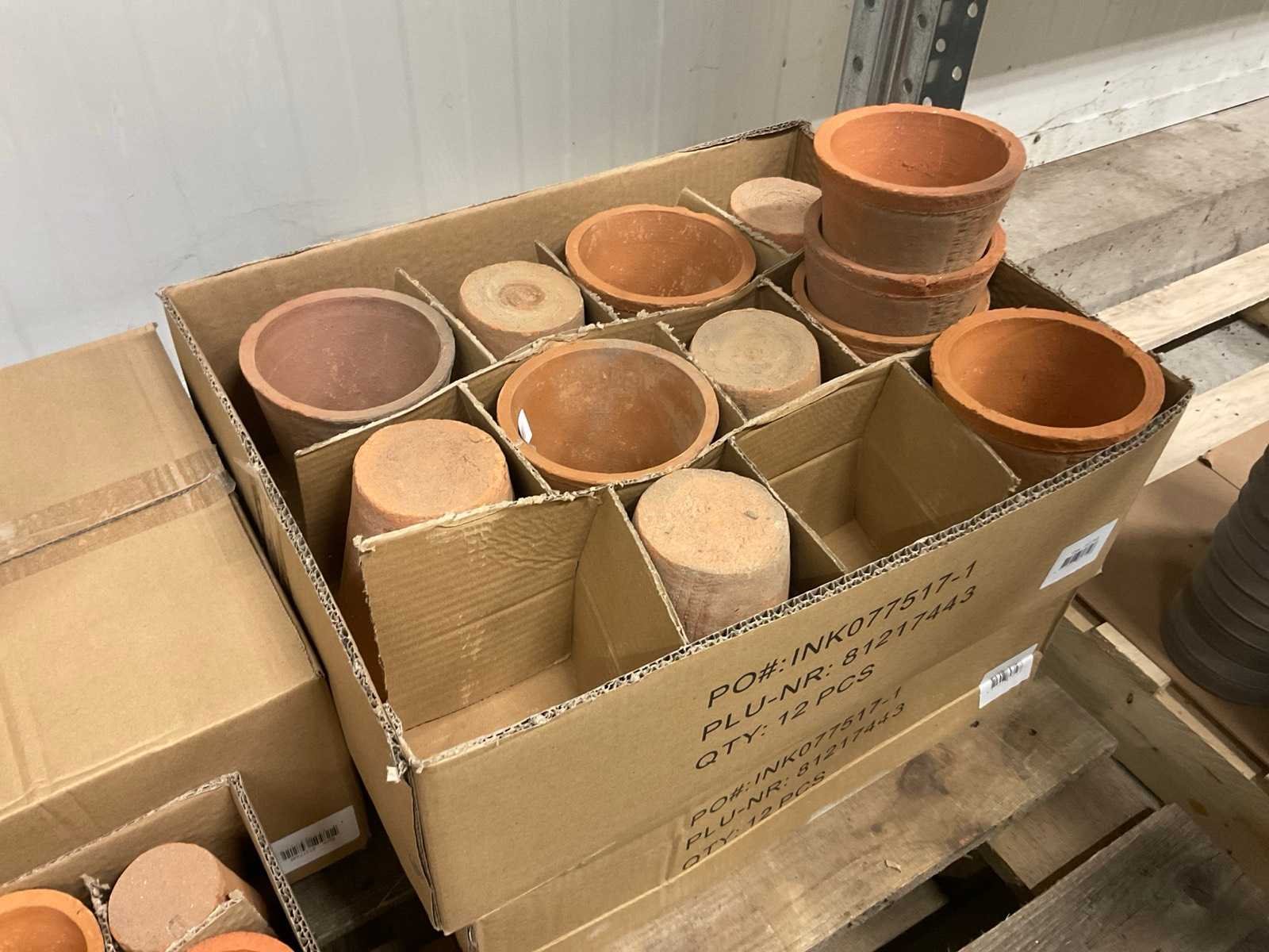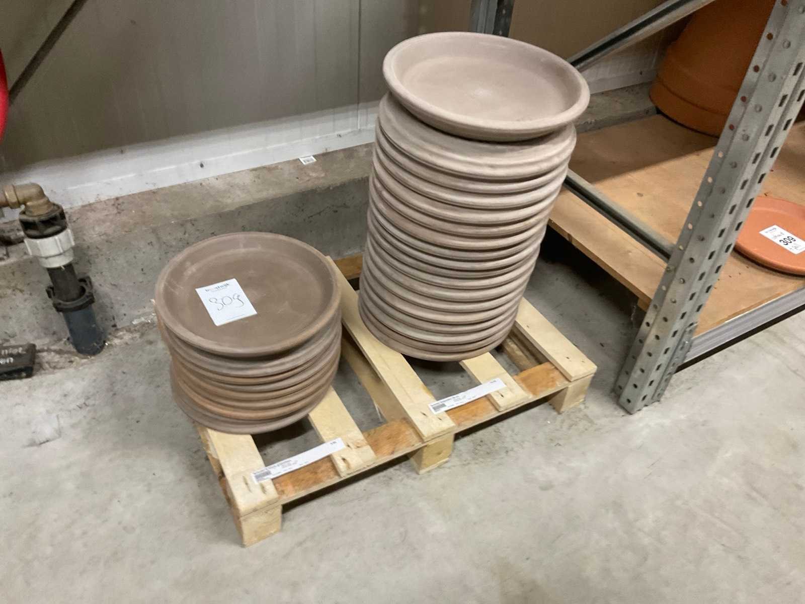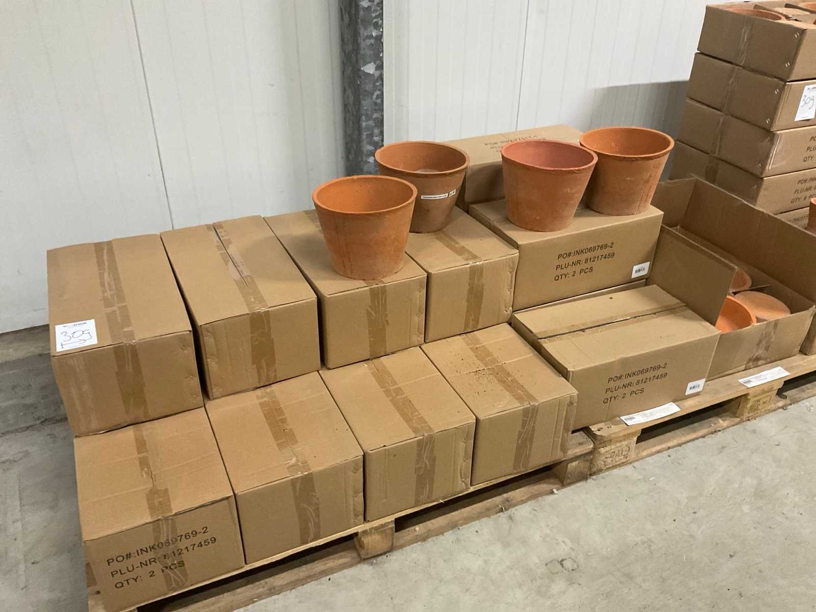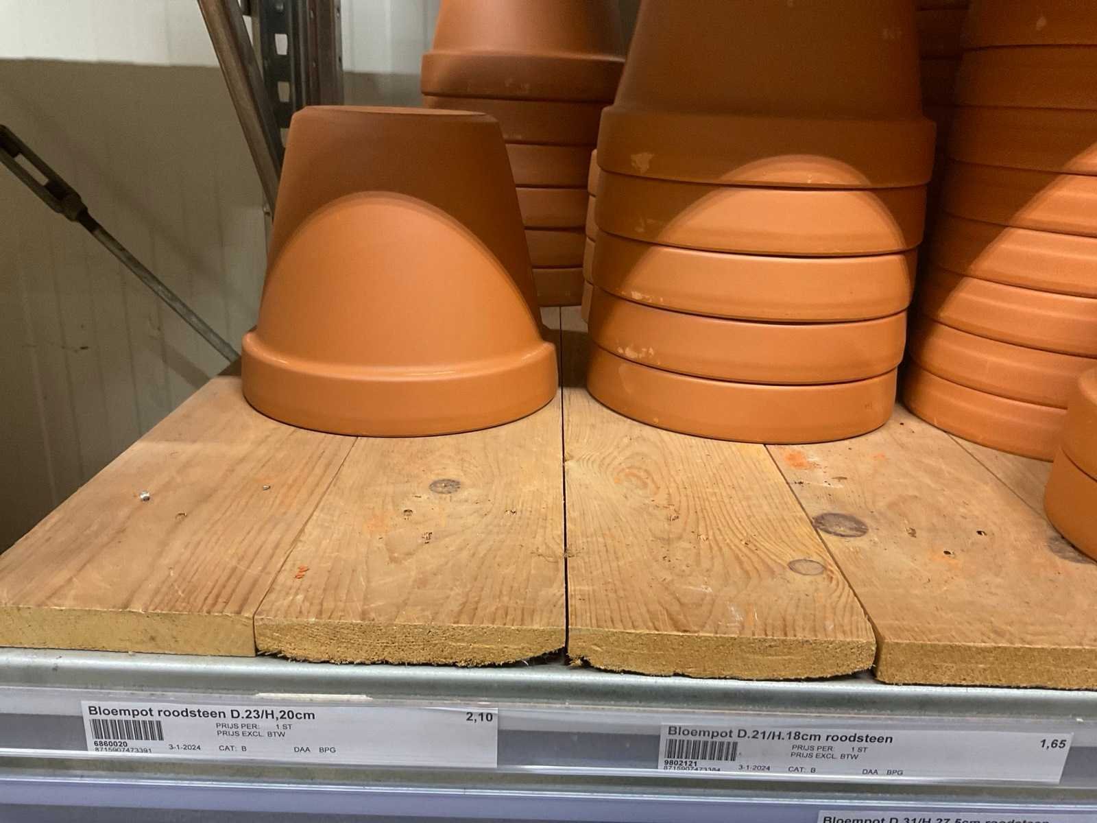 Diverse potten en schalen op en in stelling, in diverse maten en modellen, w.o. Redstone, grijssteen op 5 pallets en in stelling, inclusief pallets, stelling niet inbegrepen, vazen bovenop horen bij kavel 278.
