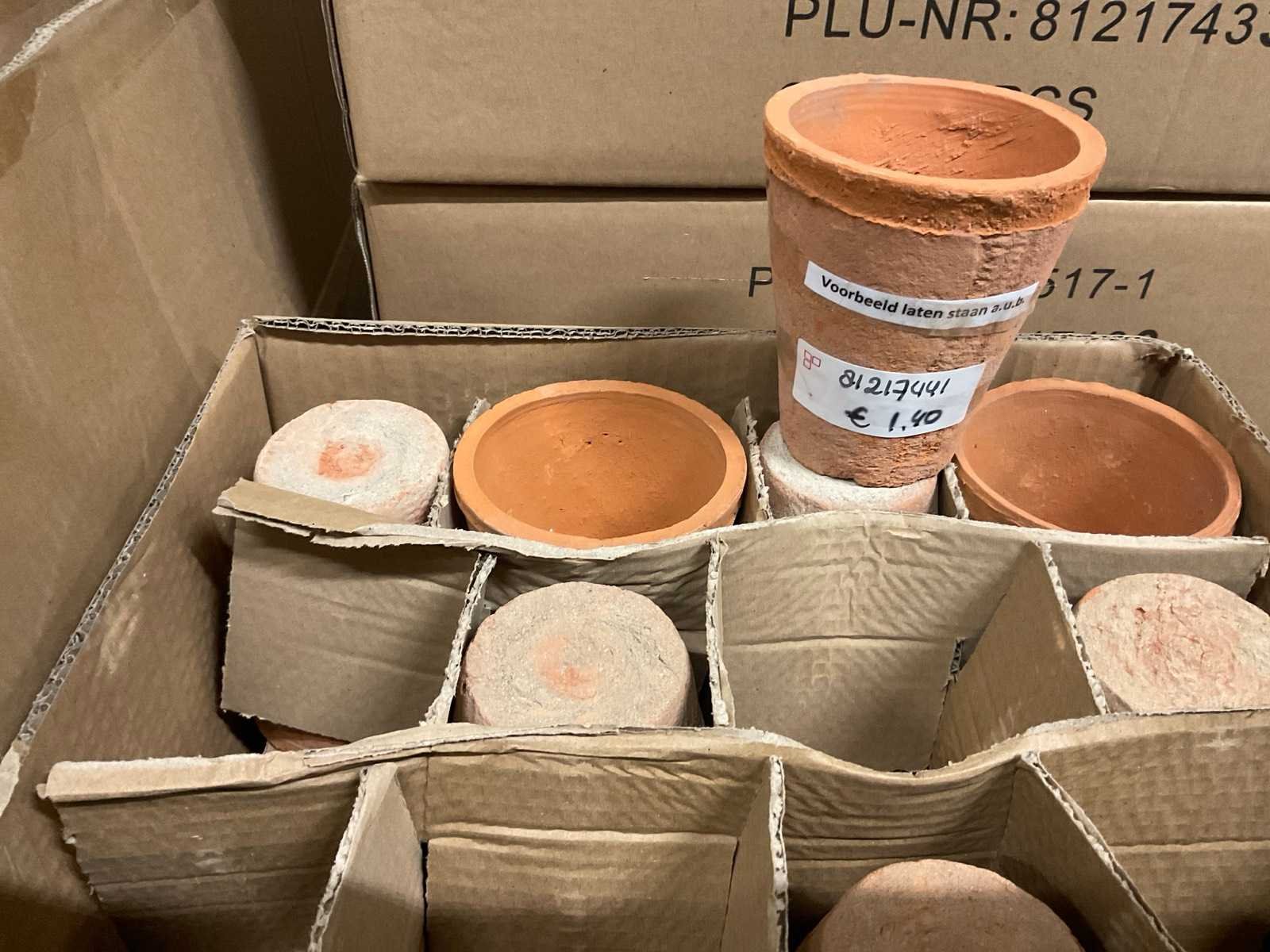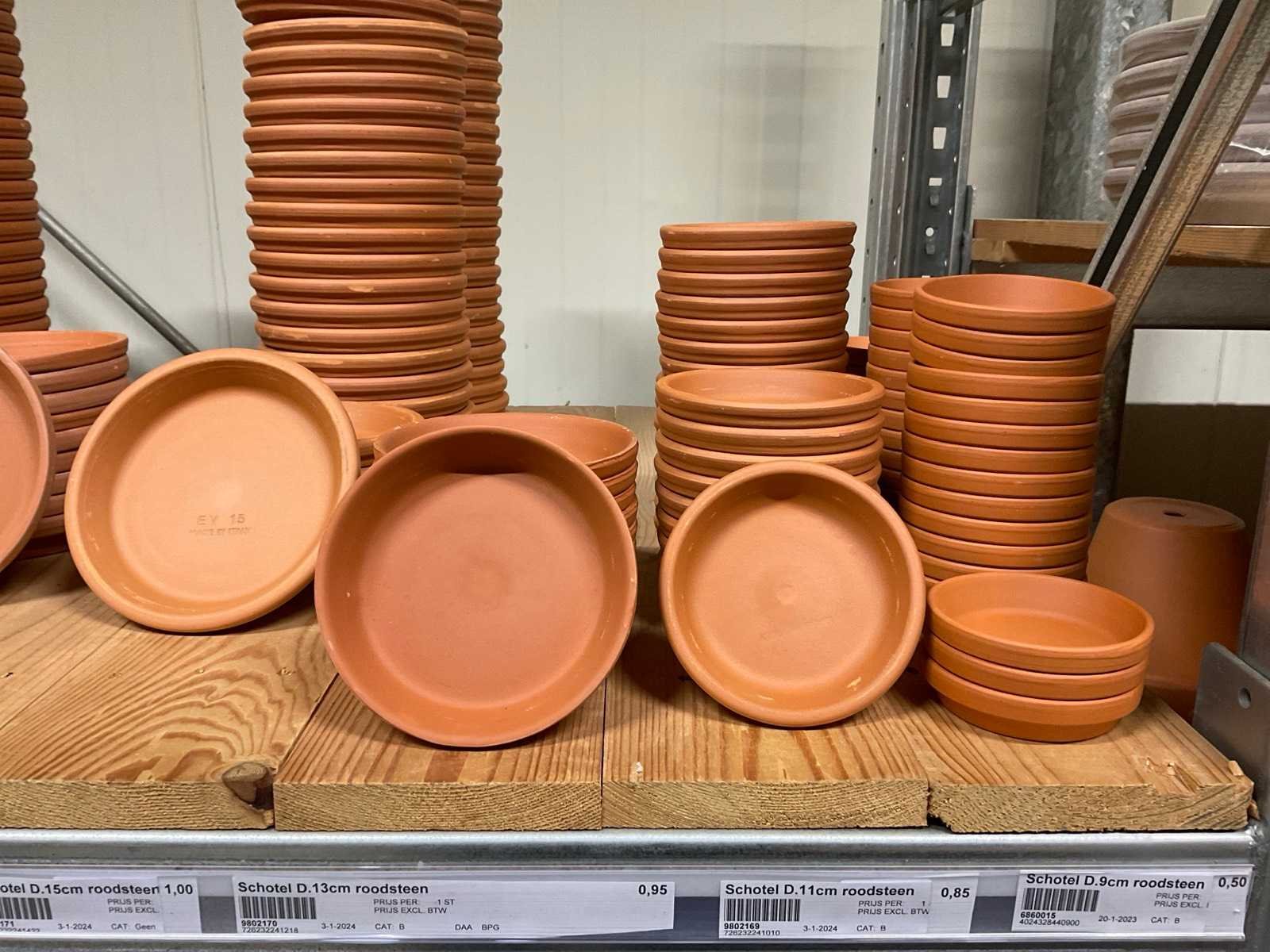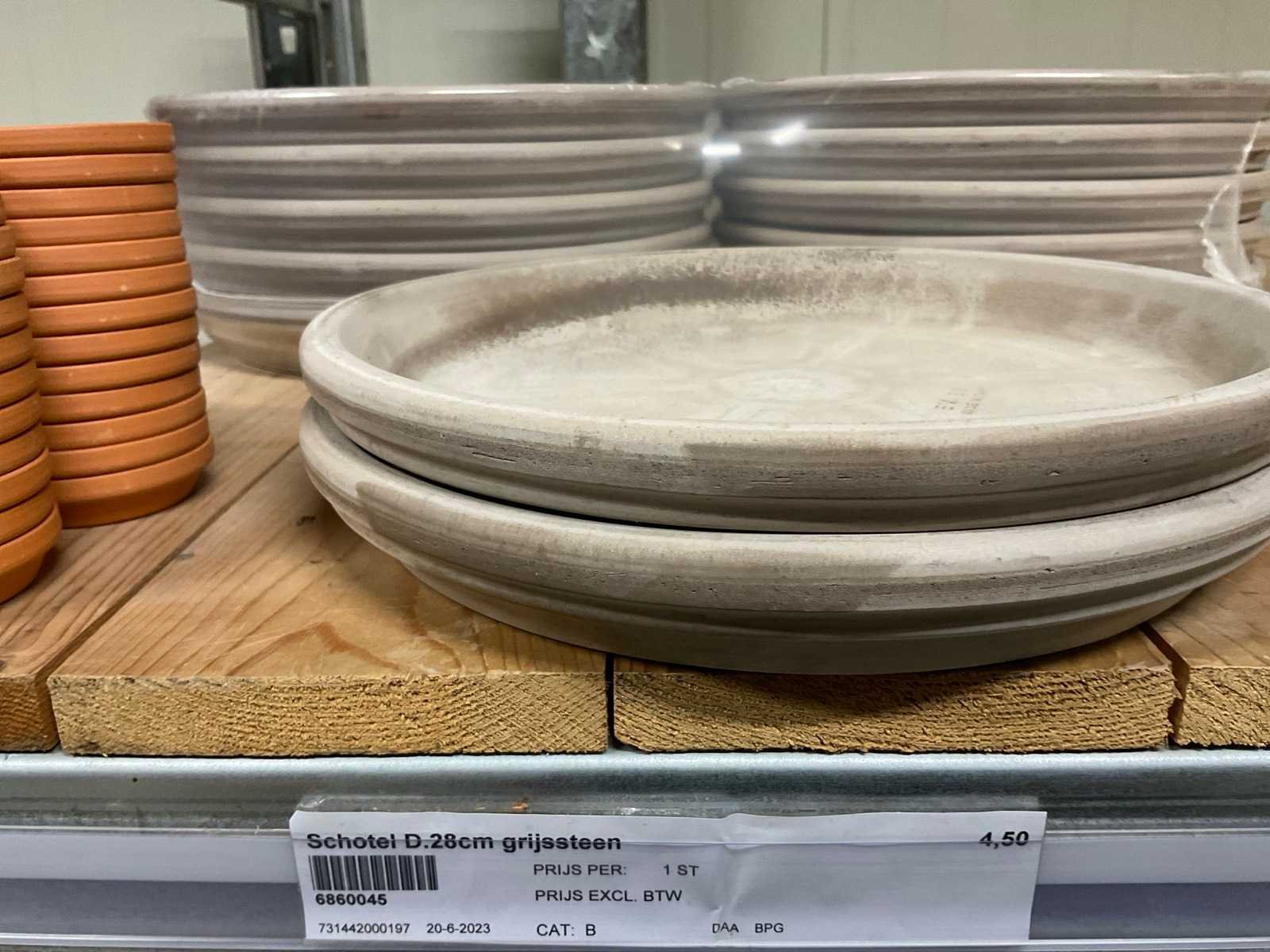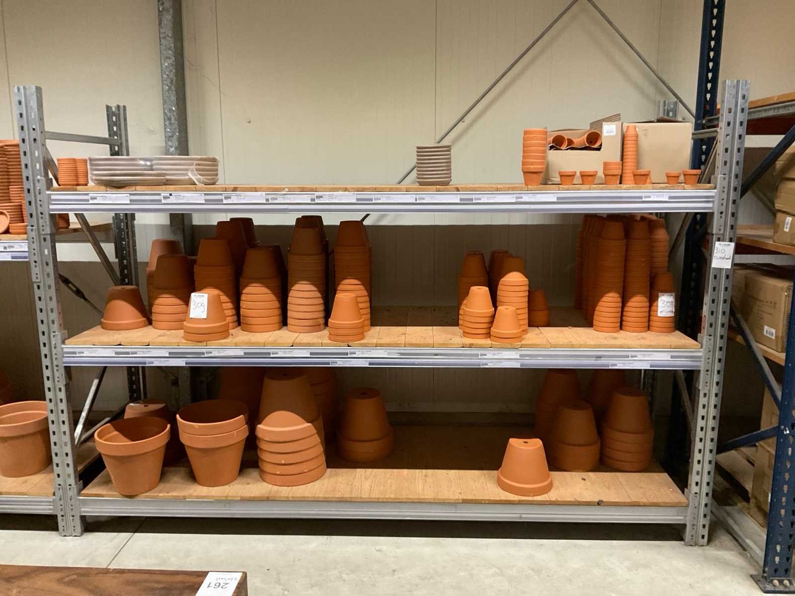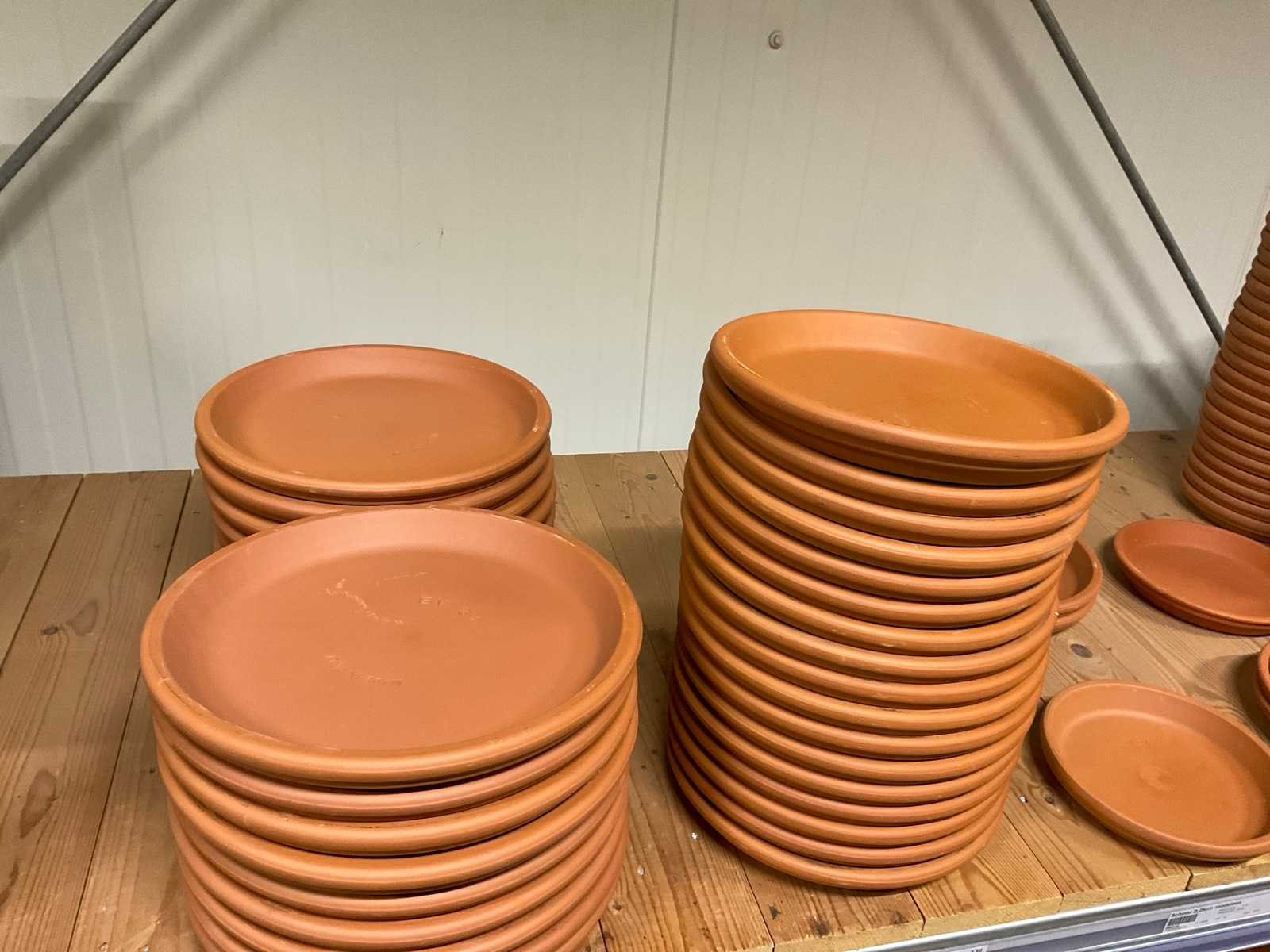 Diverse potten en schalen op en in stelling, in diverse maten en modellen, w.o. Redstone, grijssteen op 5 pallets en in stelling, inclusief pallets, stelling niet inbegrepen, vazen bovenop horen bij kavel 278.