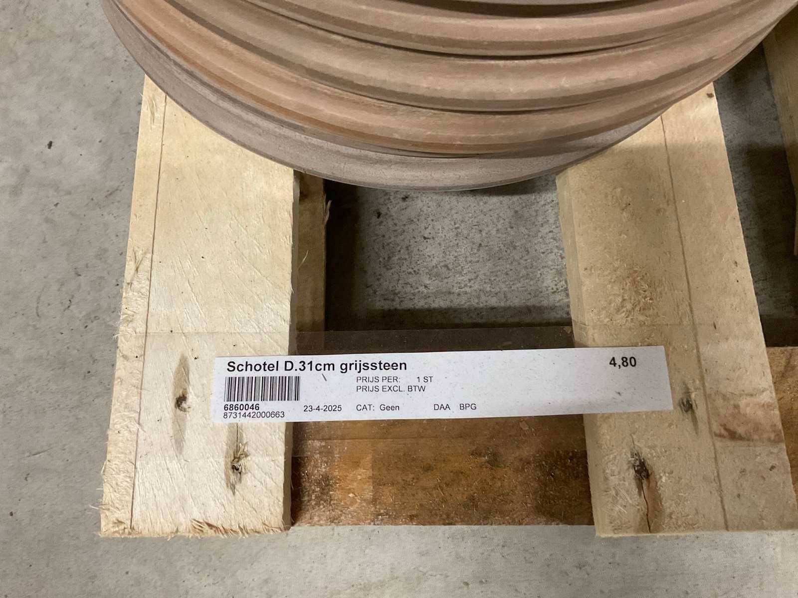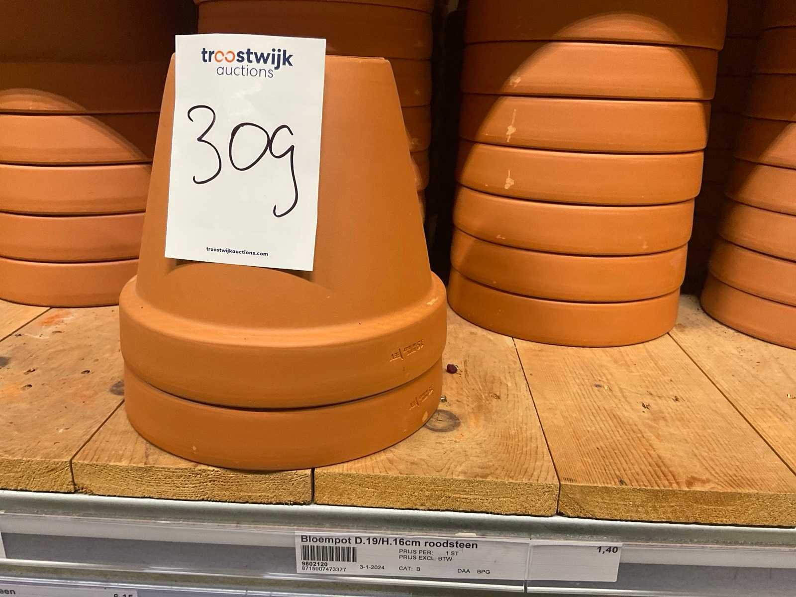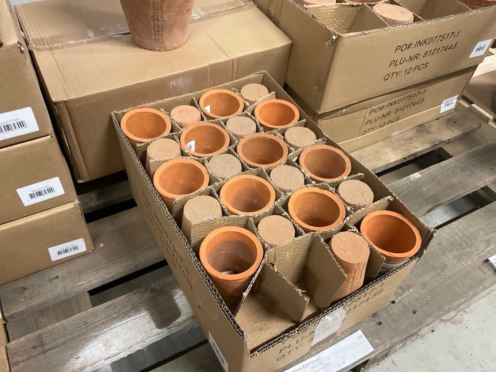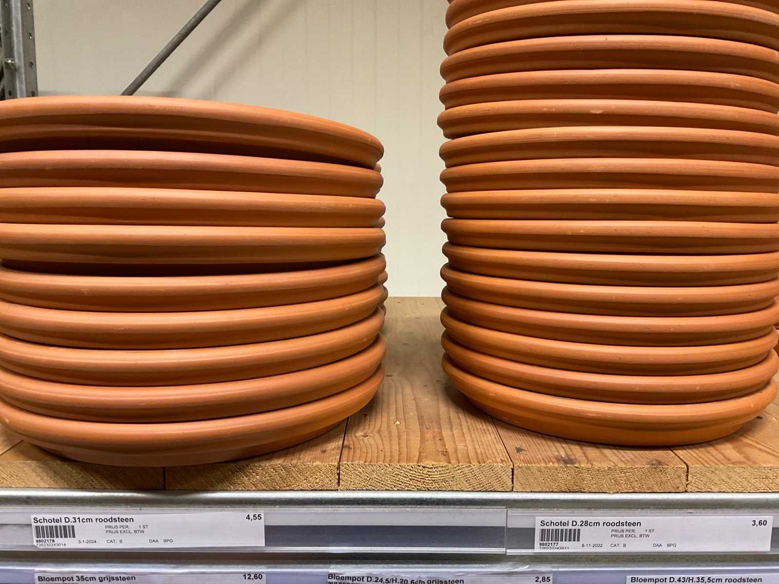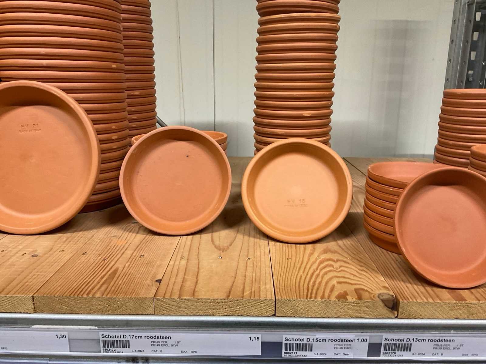 Diverse potten en schalen op en in stelling, in diverse maten en modellen, w.o. Redstone, grijssteen op 5 pallets en in stelling, inclusief pallets, stelling niet inbegrepen, vazen bovenop horen bij kavel 278.