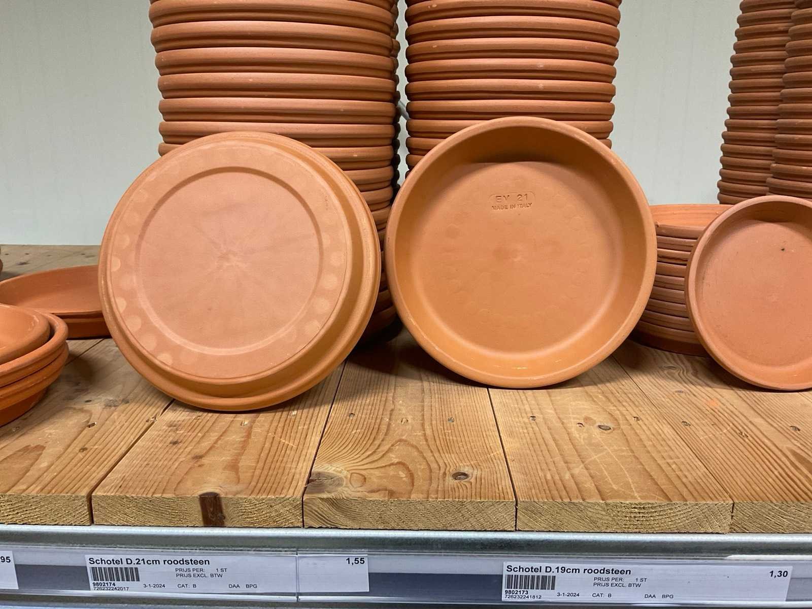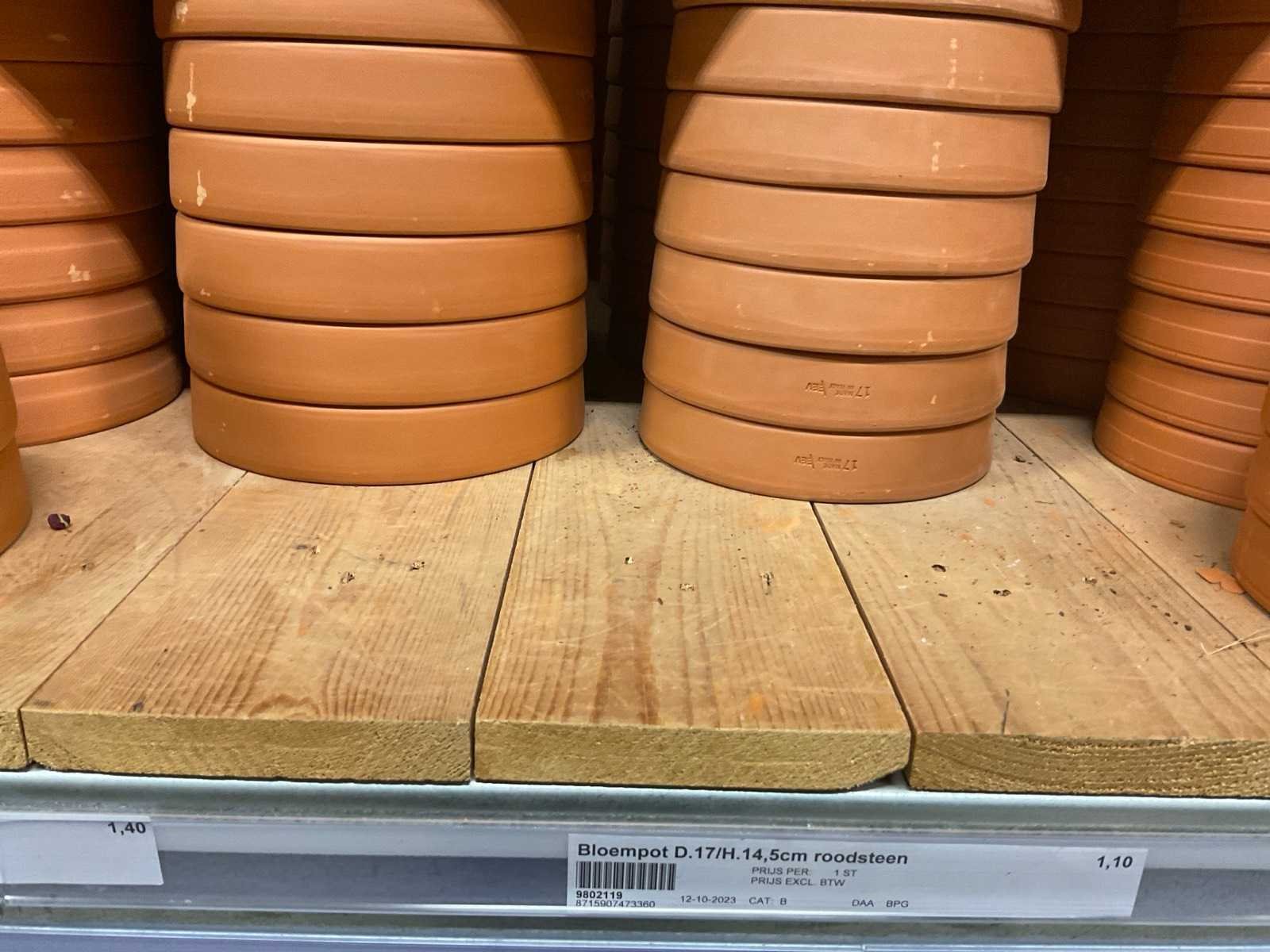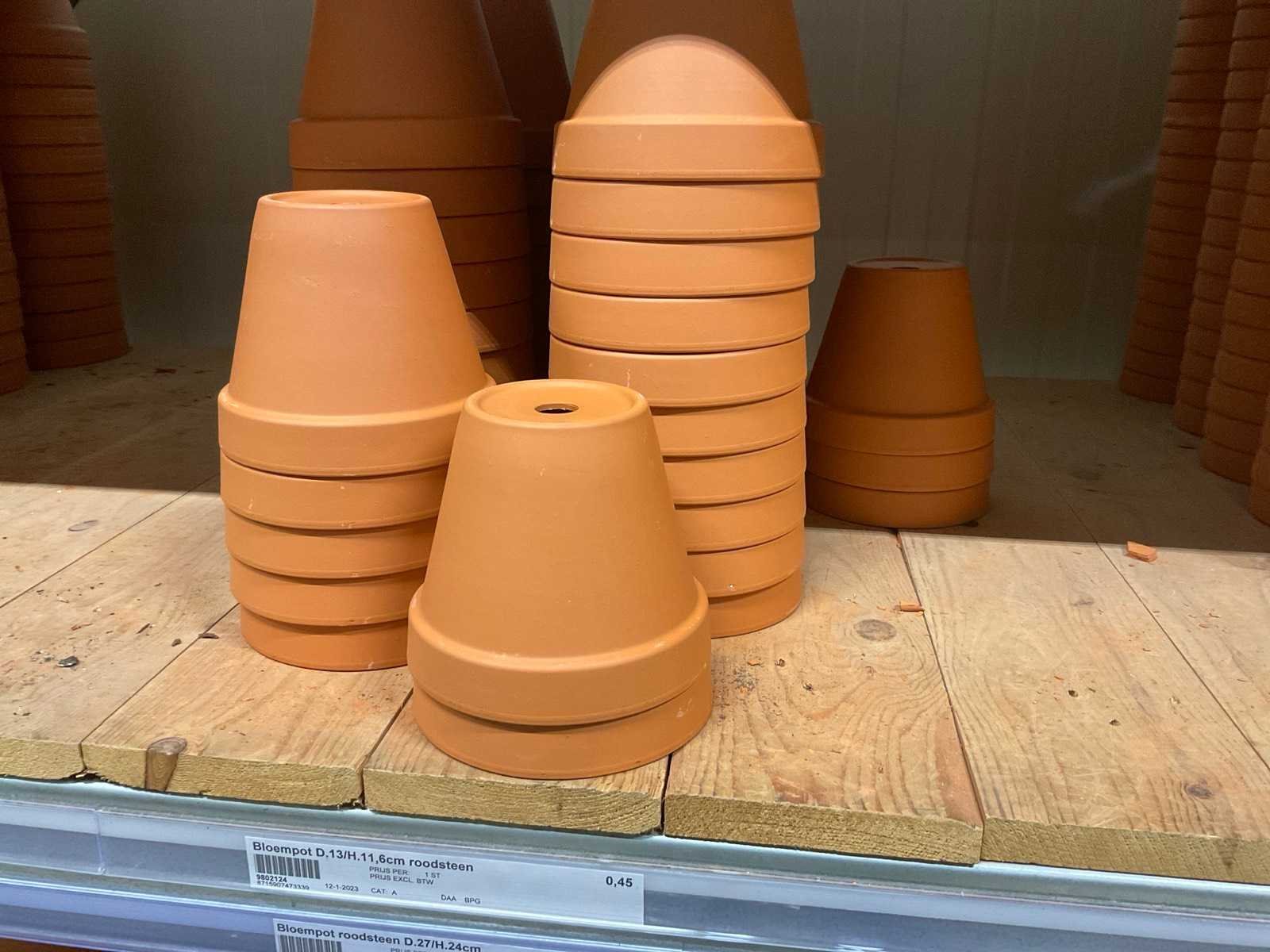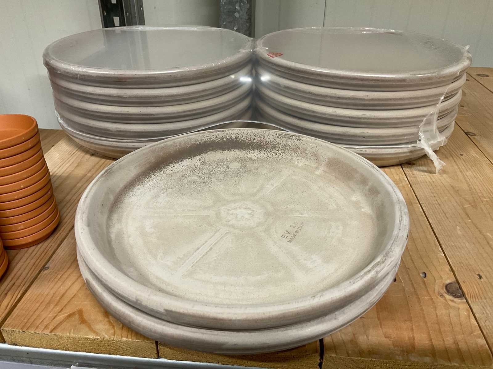 Diverse potten en schalen op en in stelling, in diverse maten en modellen, w.o. Redstone, grijssteen op 5 pallets en in stelling, inclusief pallets, stelling niet inbegrepen, vazen bovenop horen bij kavel 278.