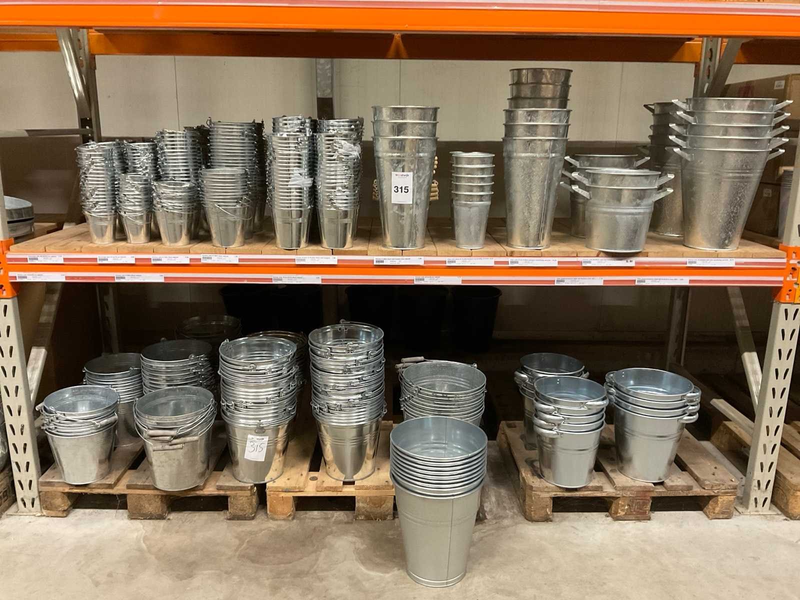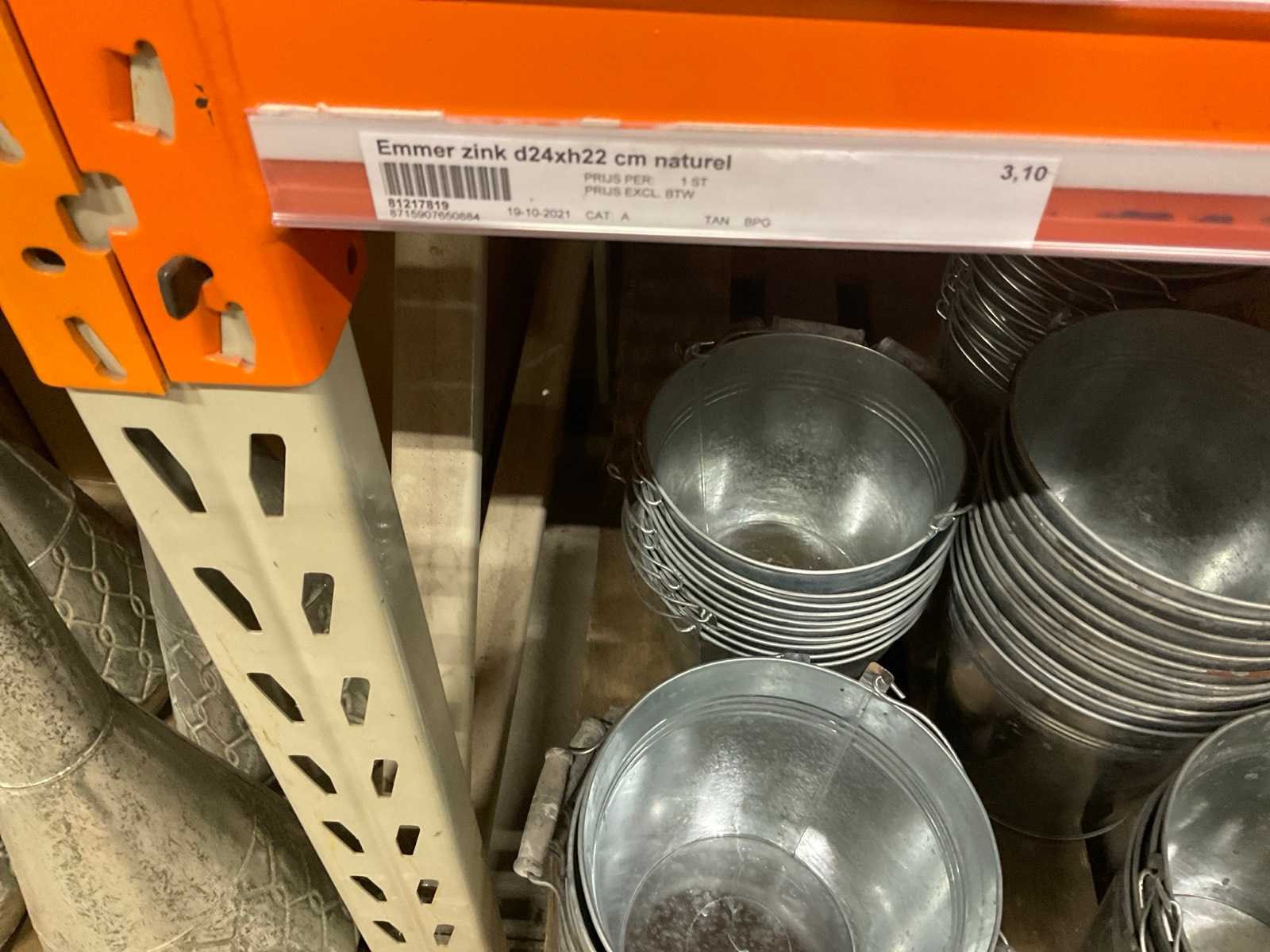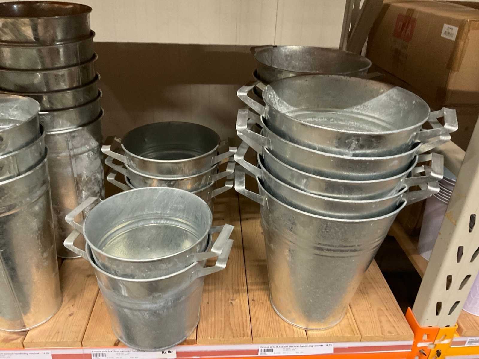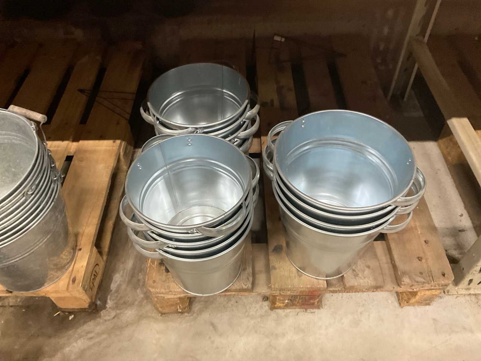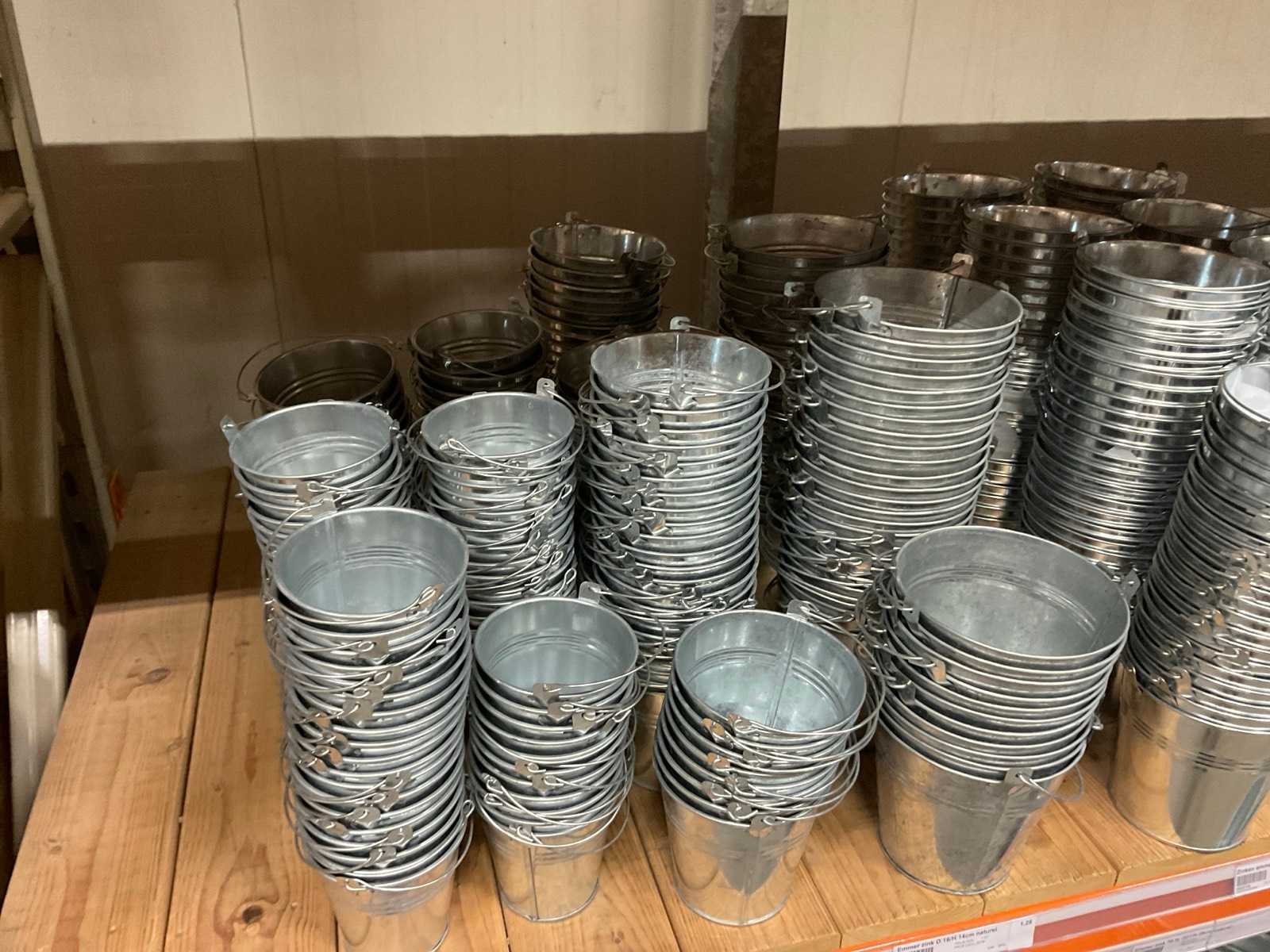 Zinken emmers in 1 stellingsectie, diverse maten, met hengels, oren of zonder, inclusief pallets, stelling niet inbegrepen. Product type: Metalen