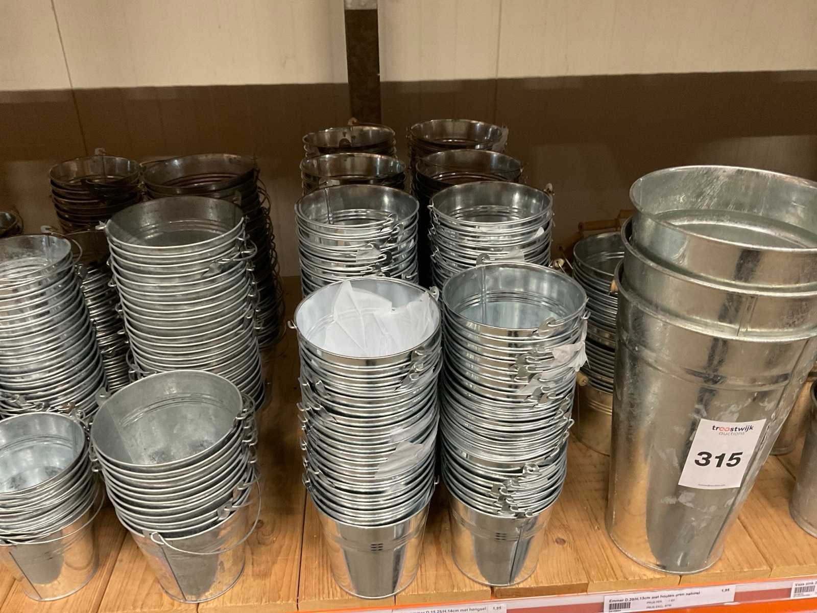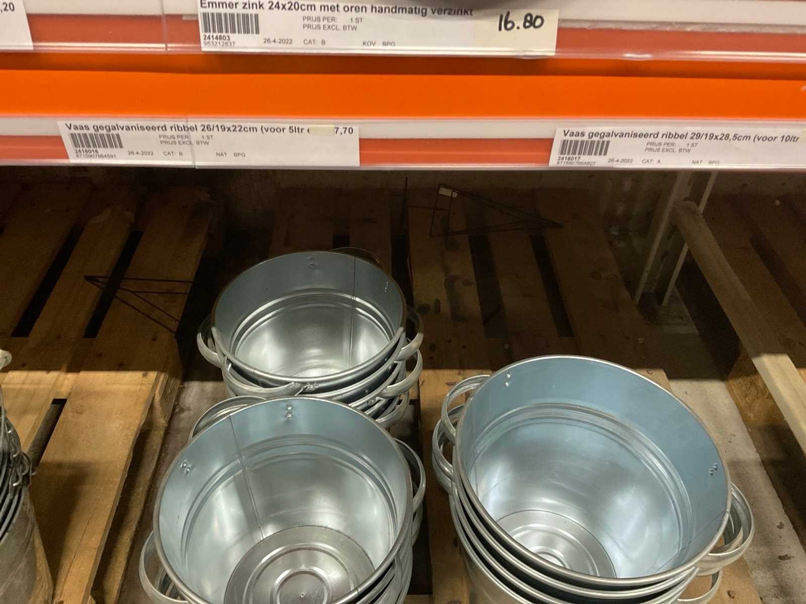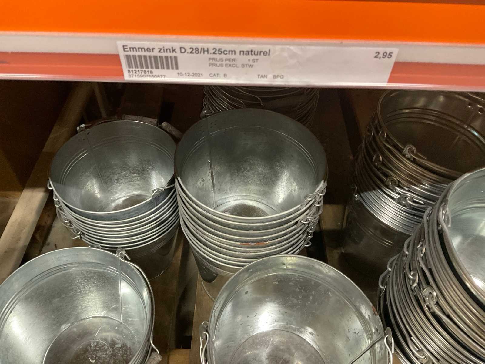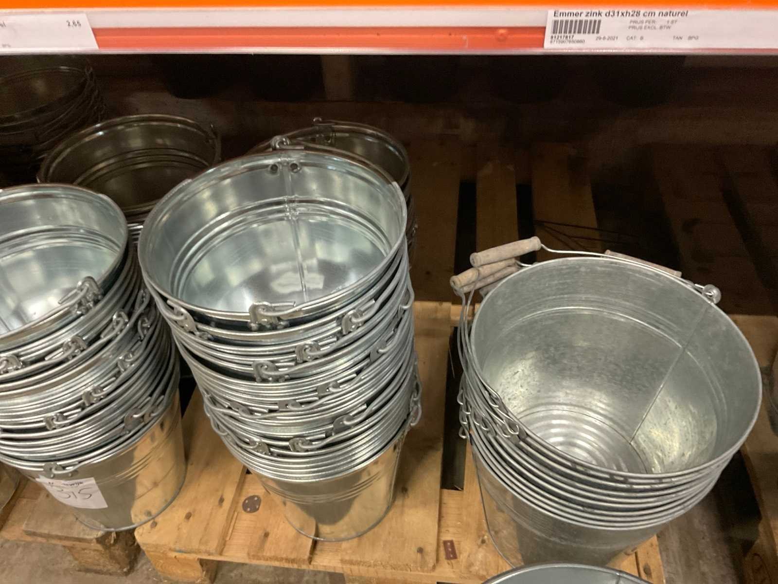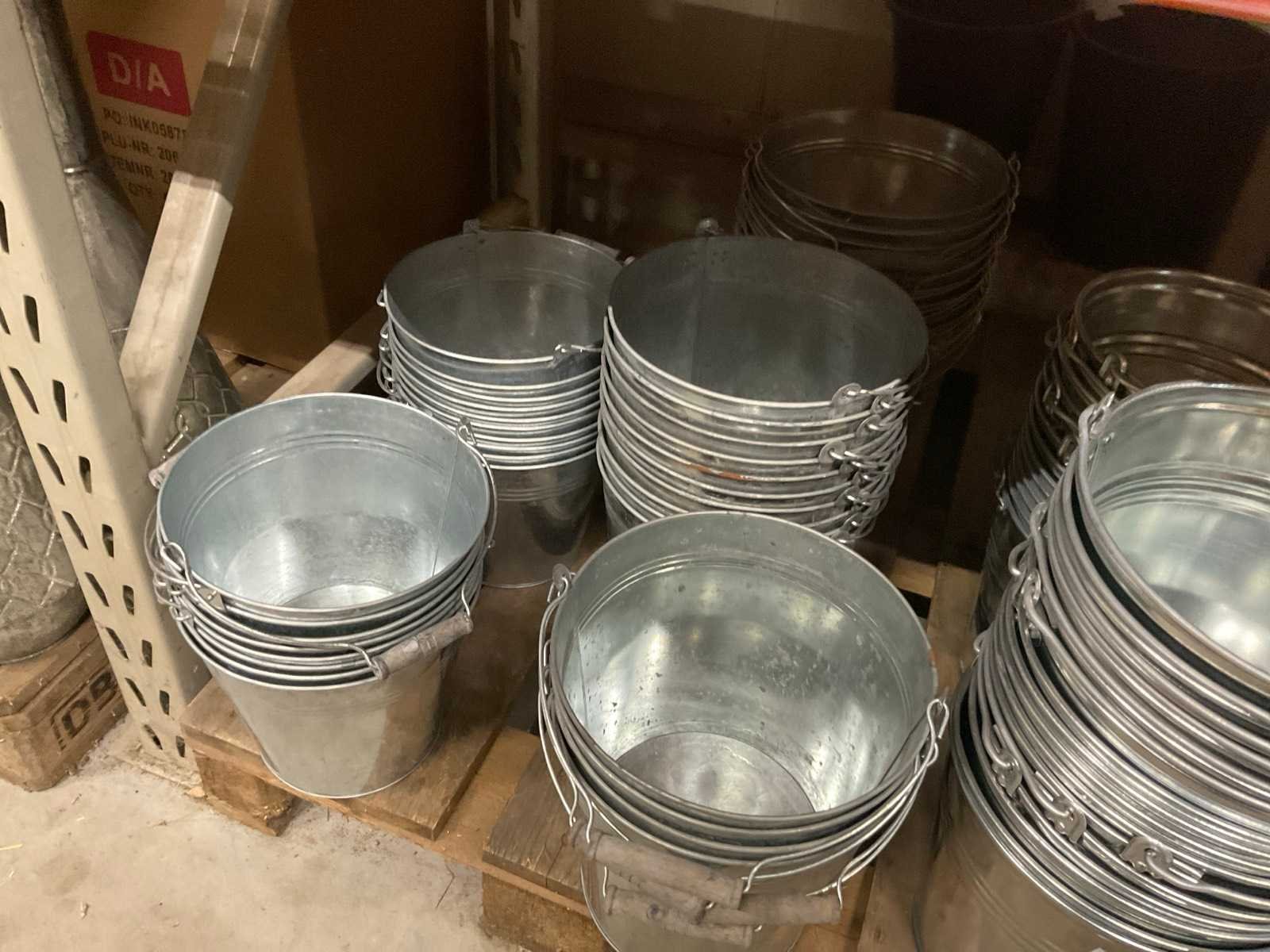 Zinken emmers in 1 stellingsectie, diverse maten, met hengels, oren of zonder, inclusief pallets, stelling niet inbegrepen. Product type: Metalen