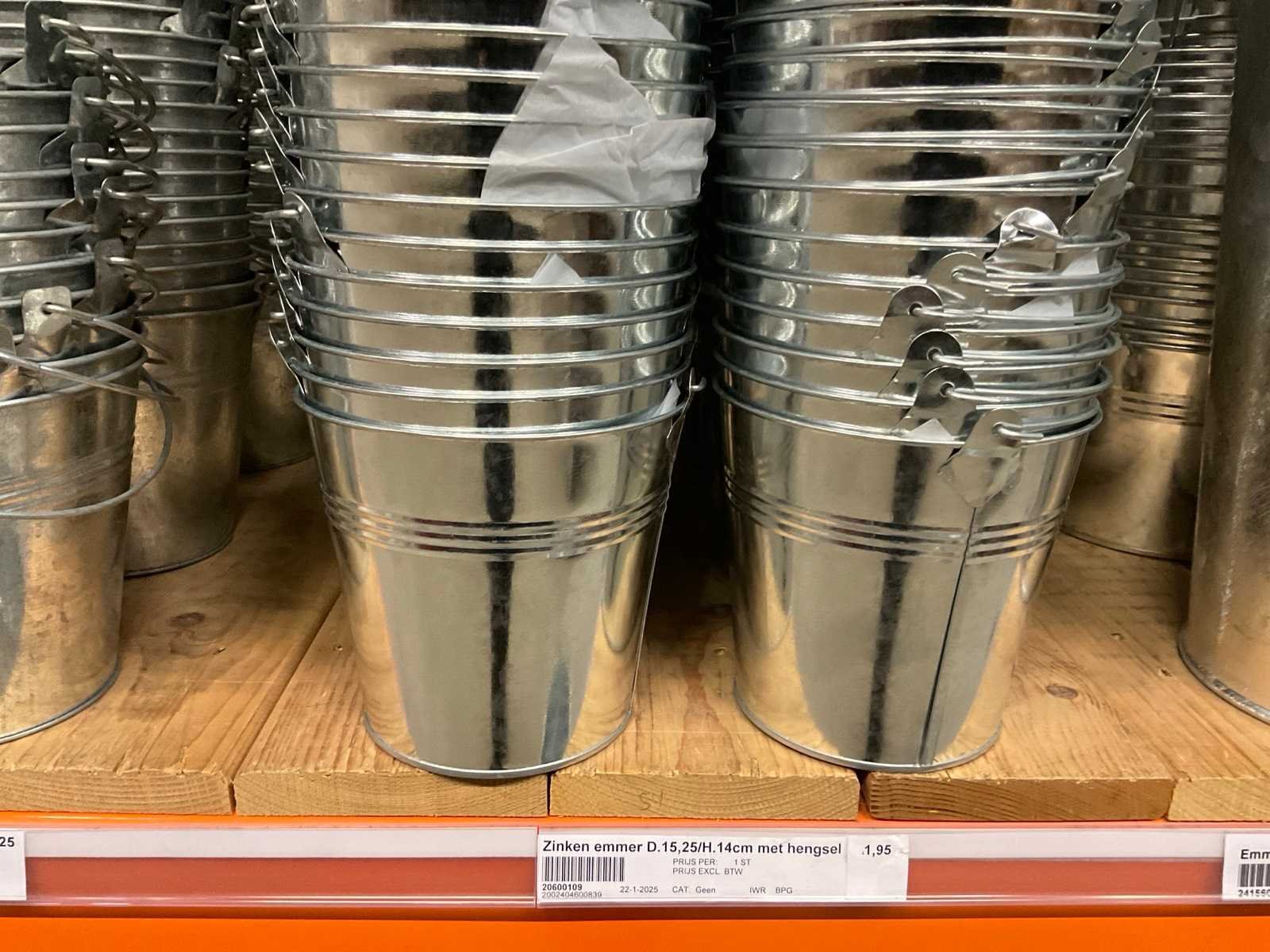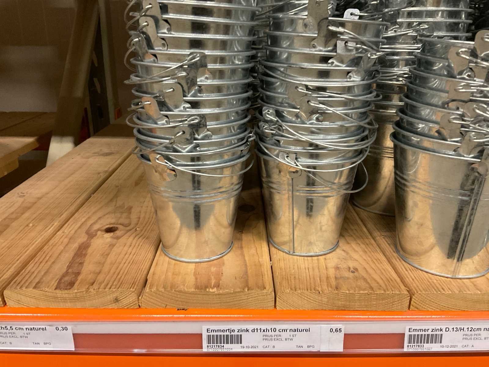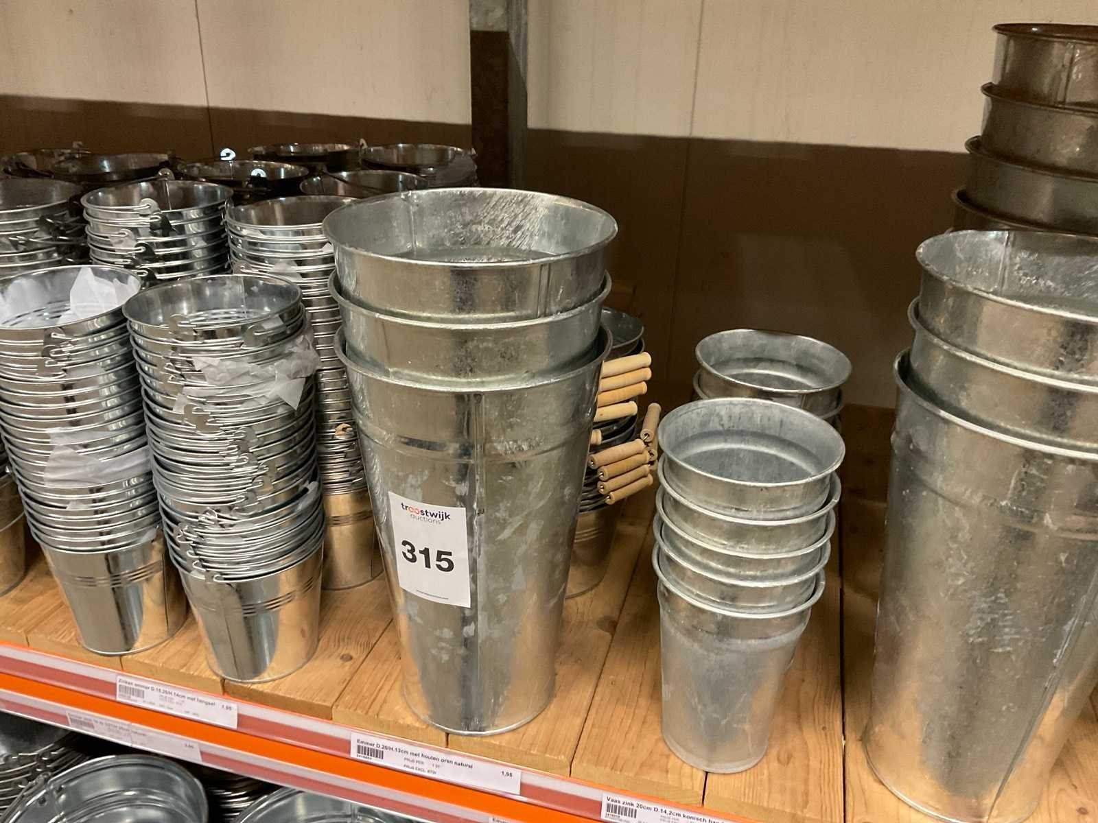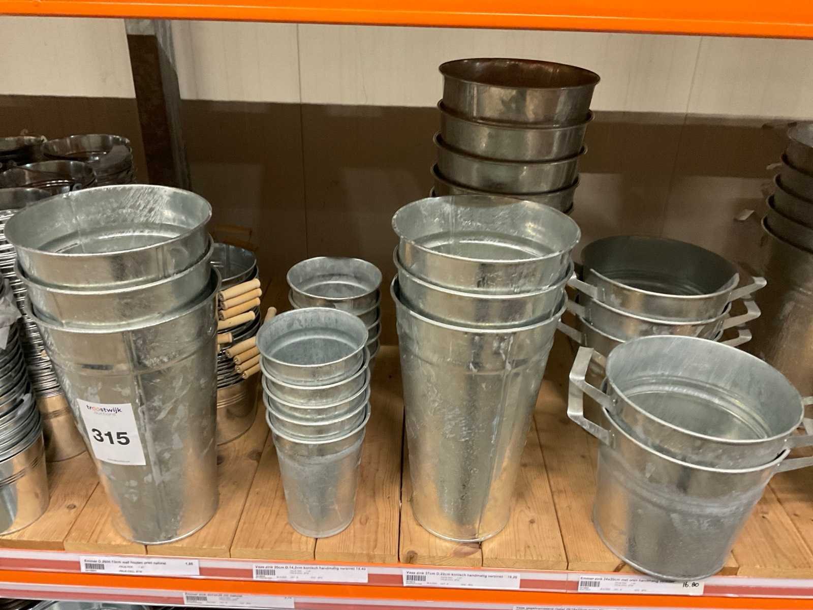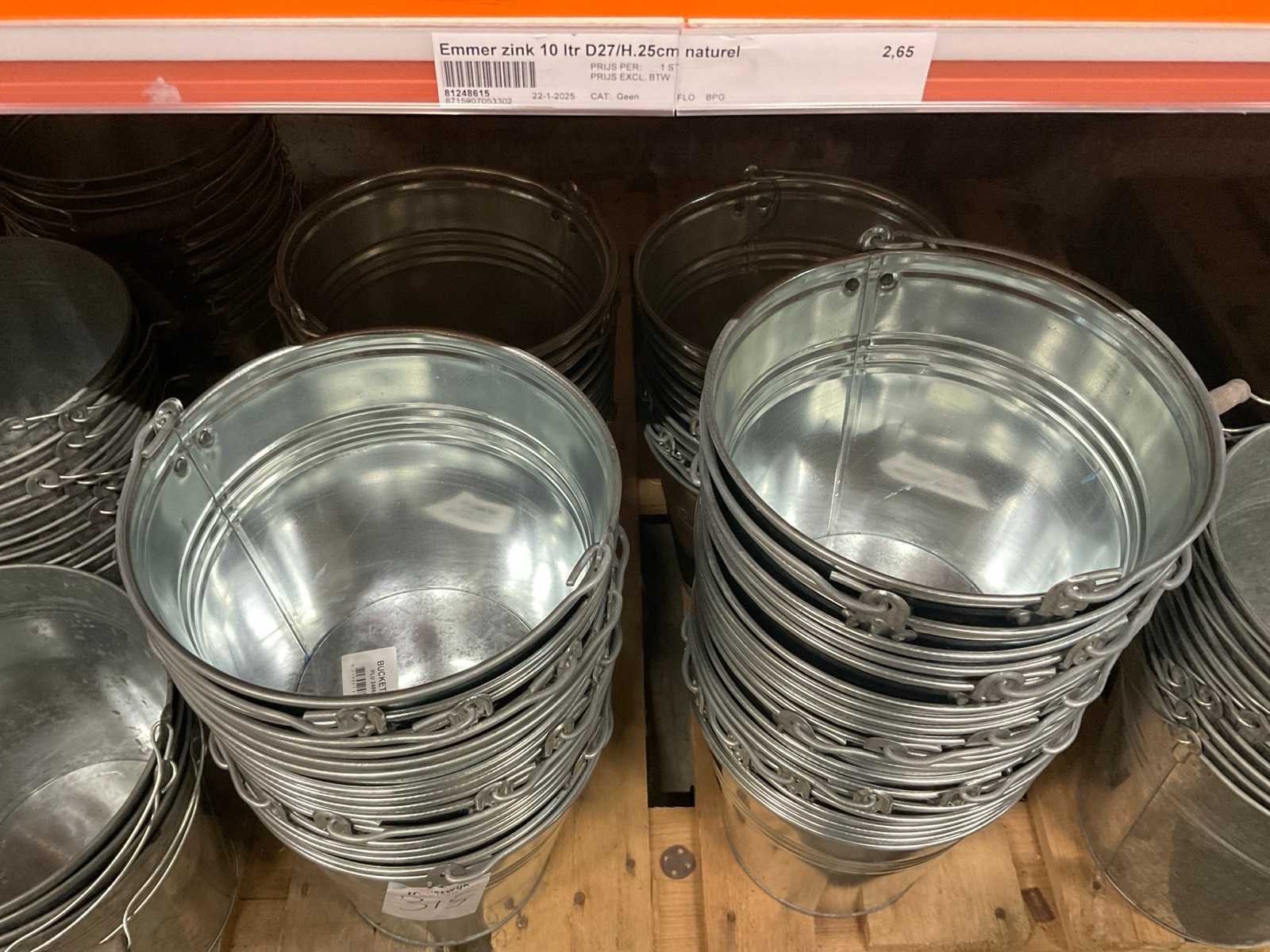 Zinken emmers in 1 stellingsectie, diverse maten, met hengels, oren of zonder, inclusief pallets, stelling niet inbegrepen. Product type: Metalen