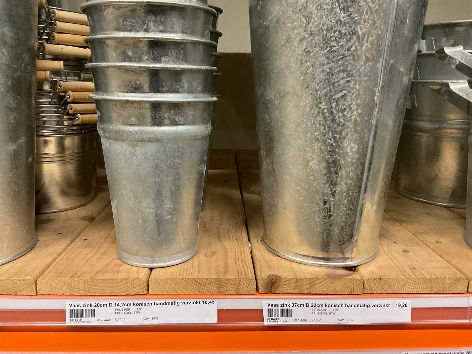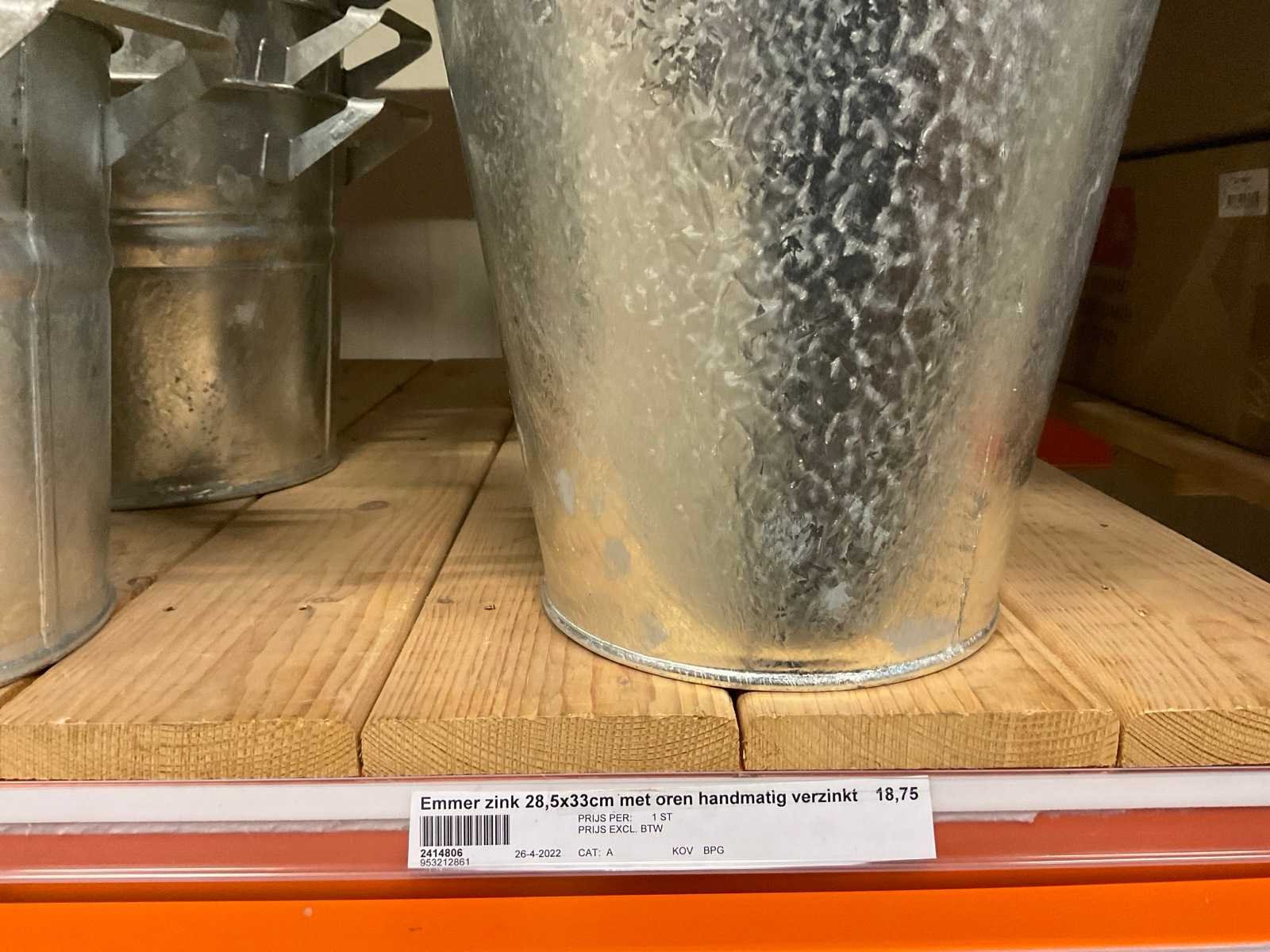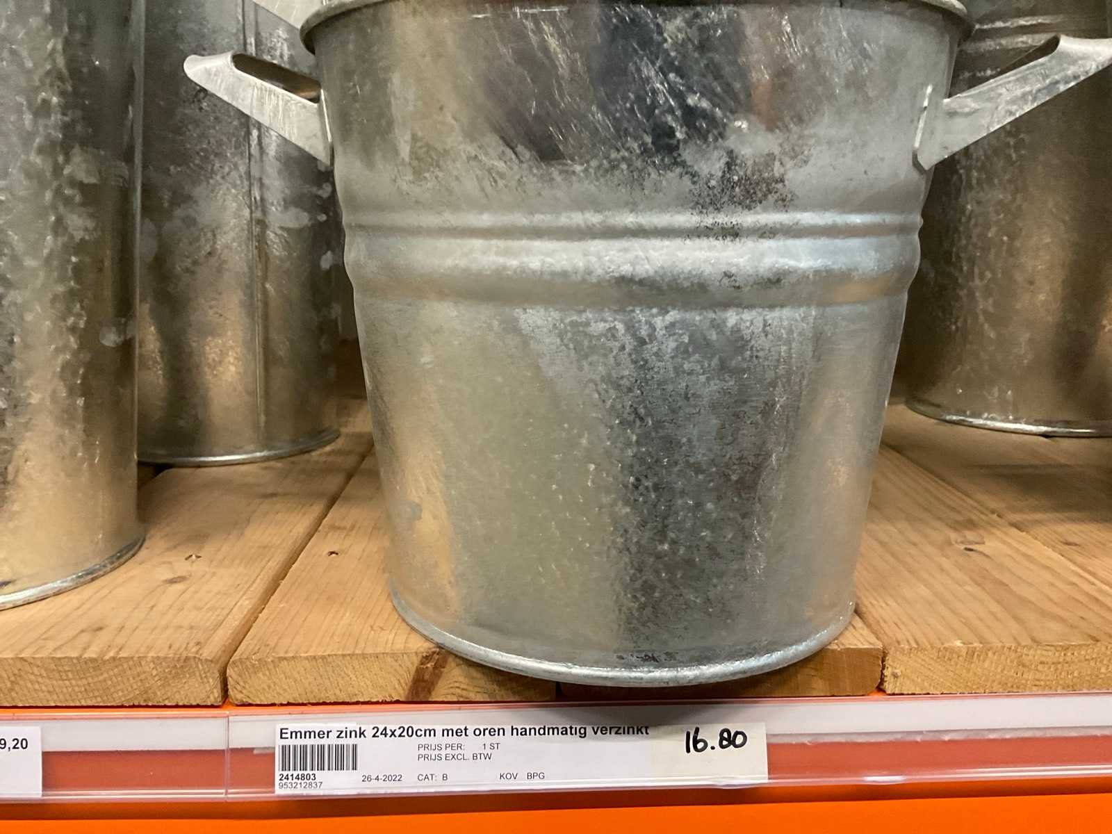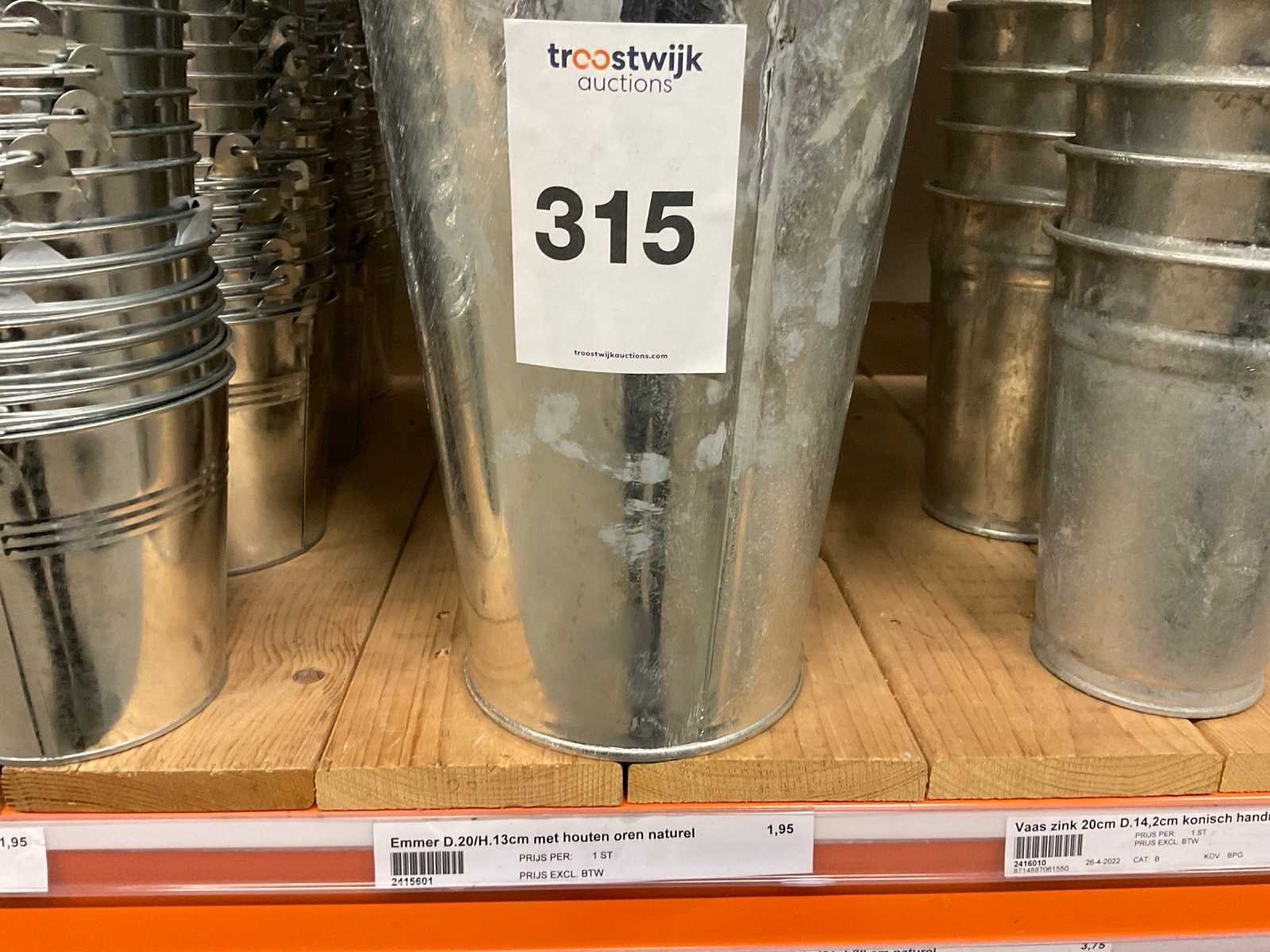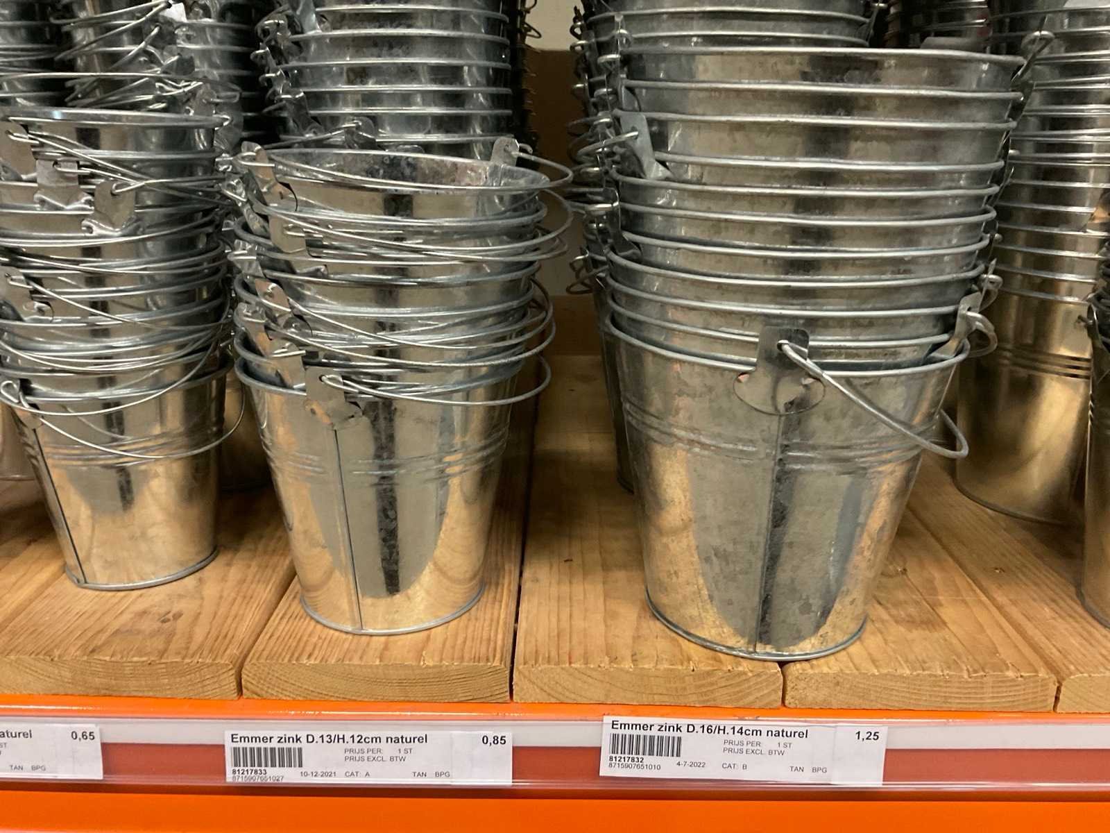 Zinken emmers in 1 stellingsectie, diverse maten, met hengels, oren of zonder, inclusief pallets, stelling niet inbegrepen. Product type: Metalen