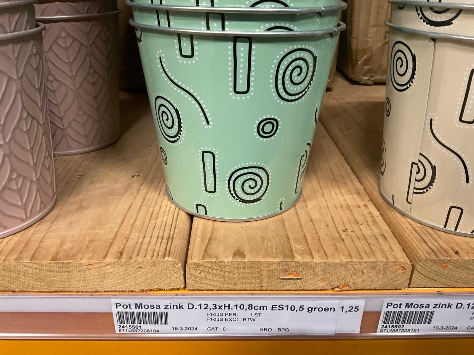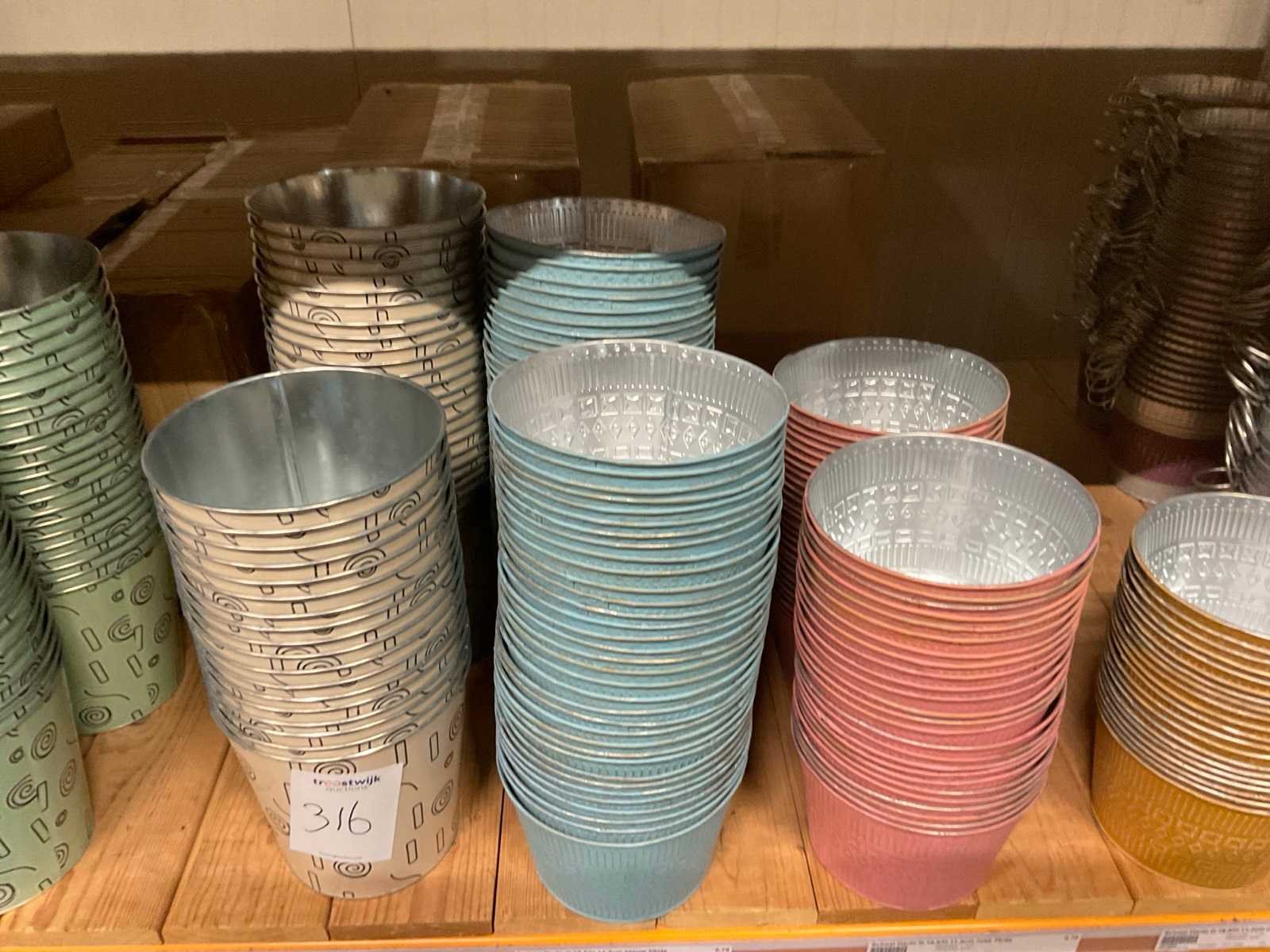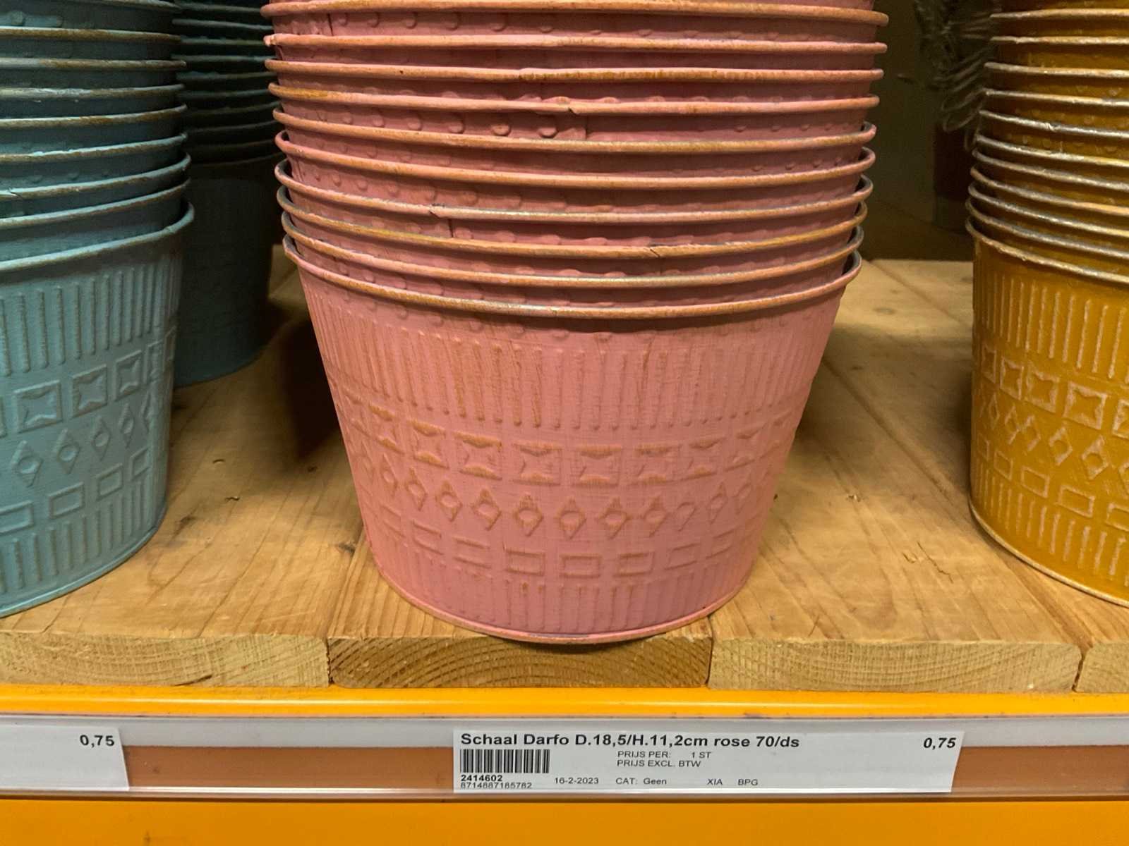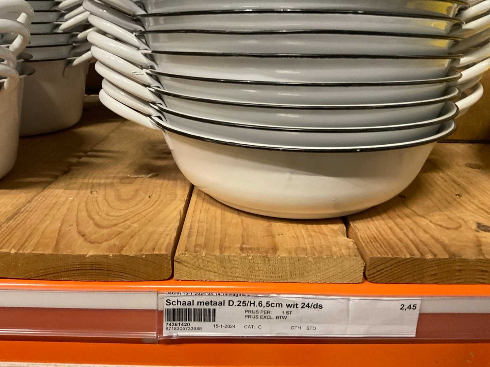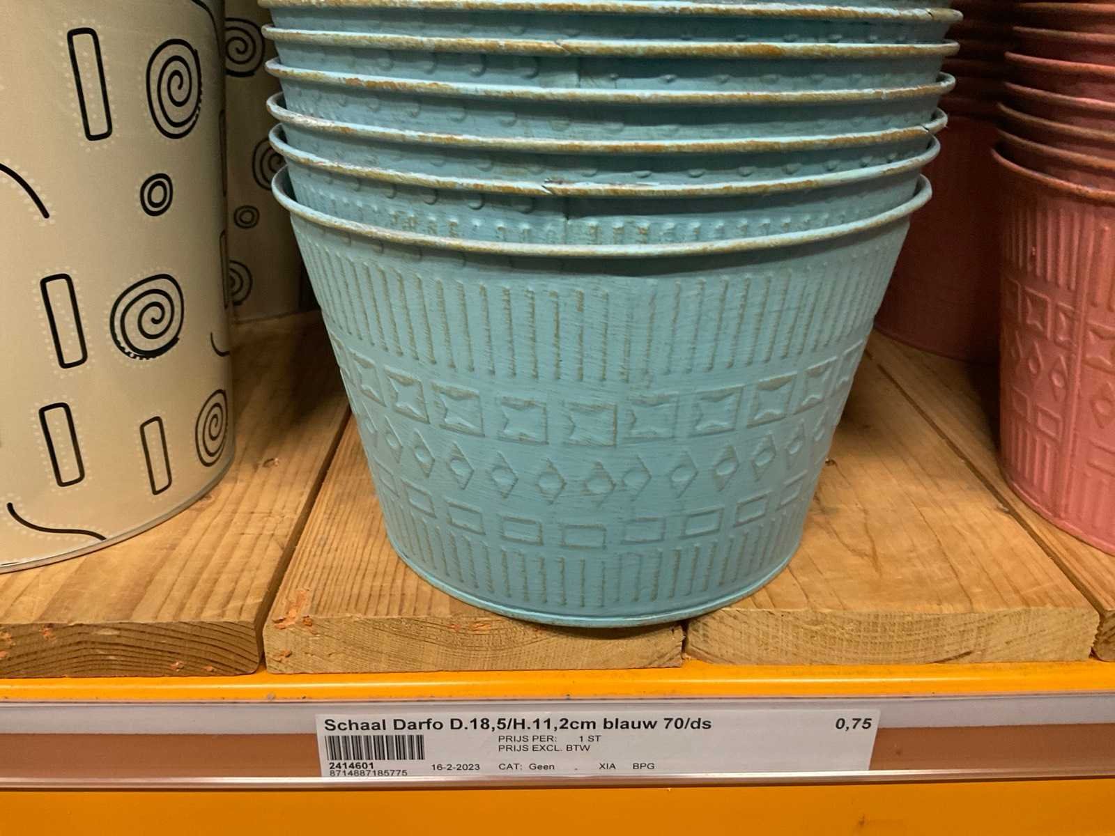 Potten en schalen van metaal in 2 stellingsvakken naast elkaar. Product type: Metalen