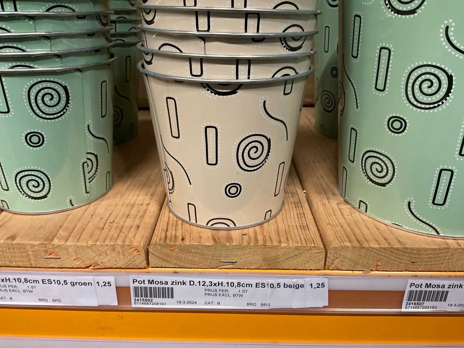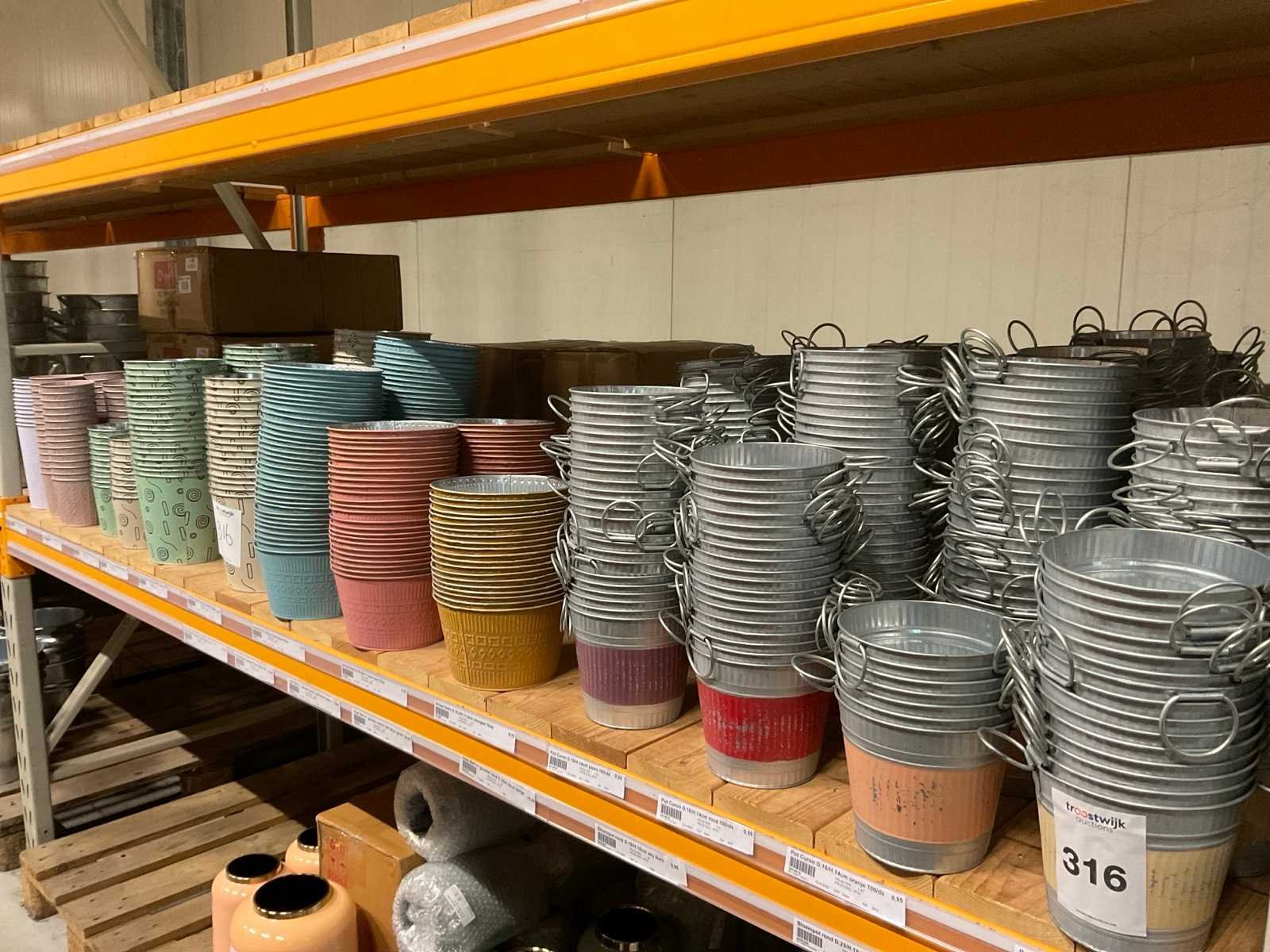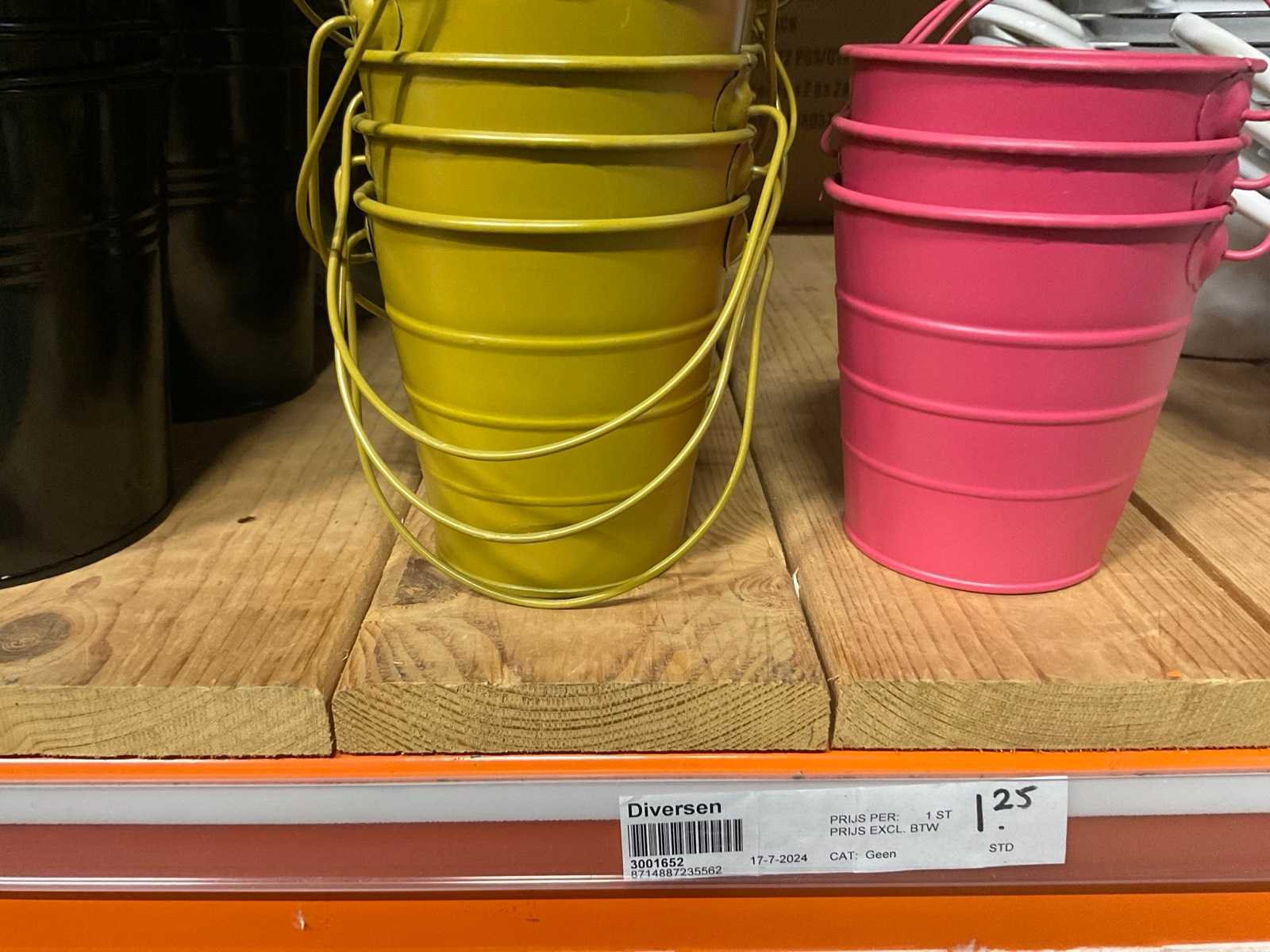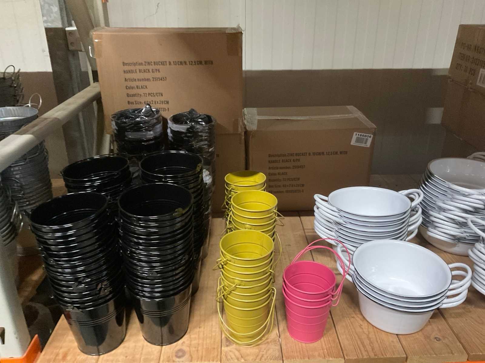Potten en schalen van metaal in 2 stellingsvakken naast elkaar. Product type: Metalen