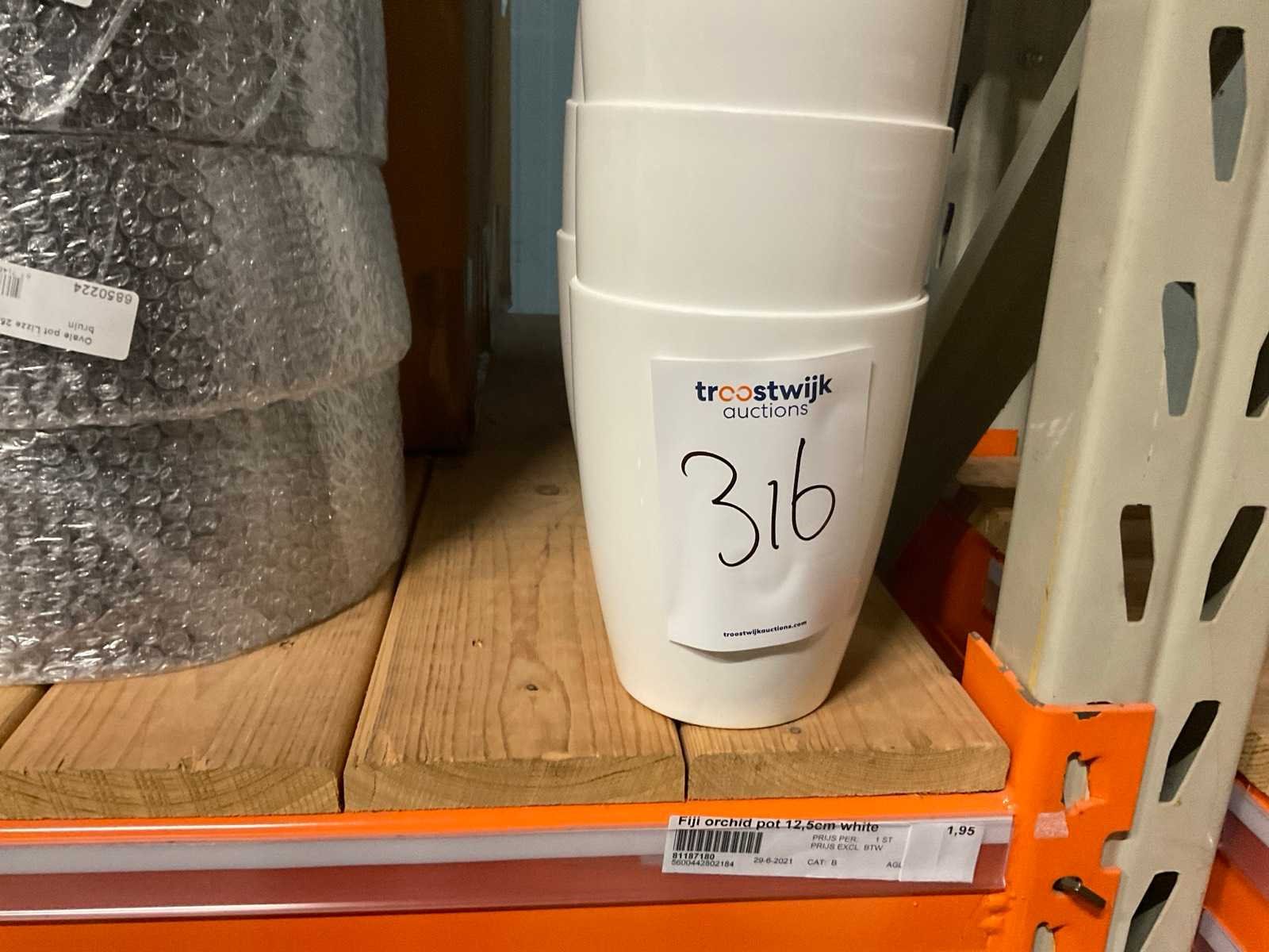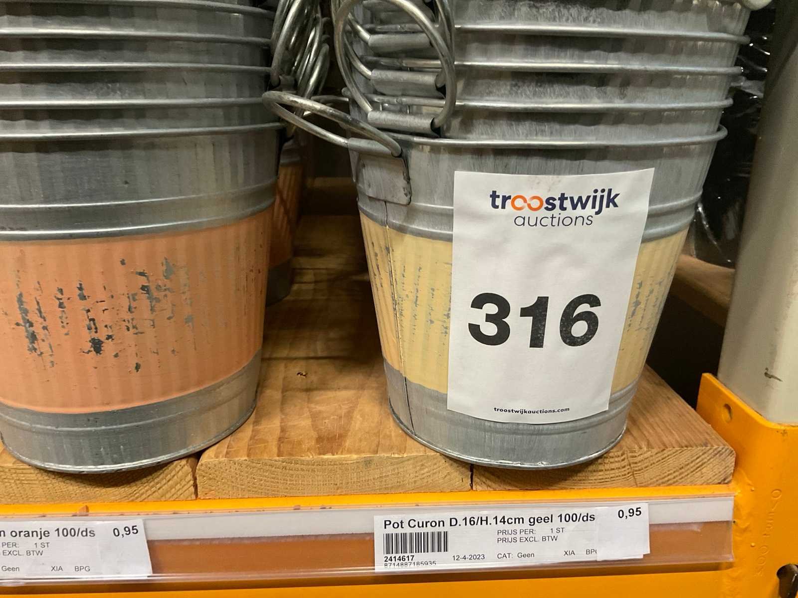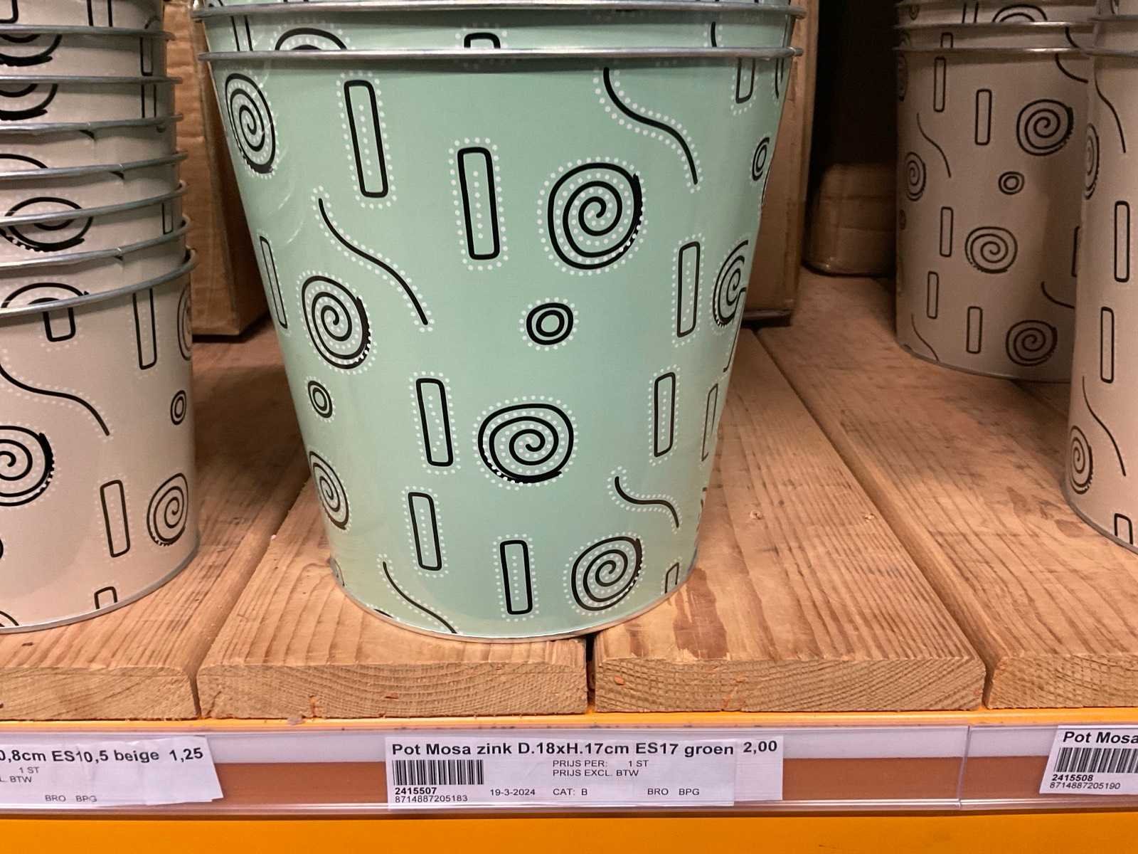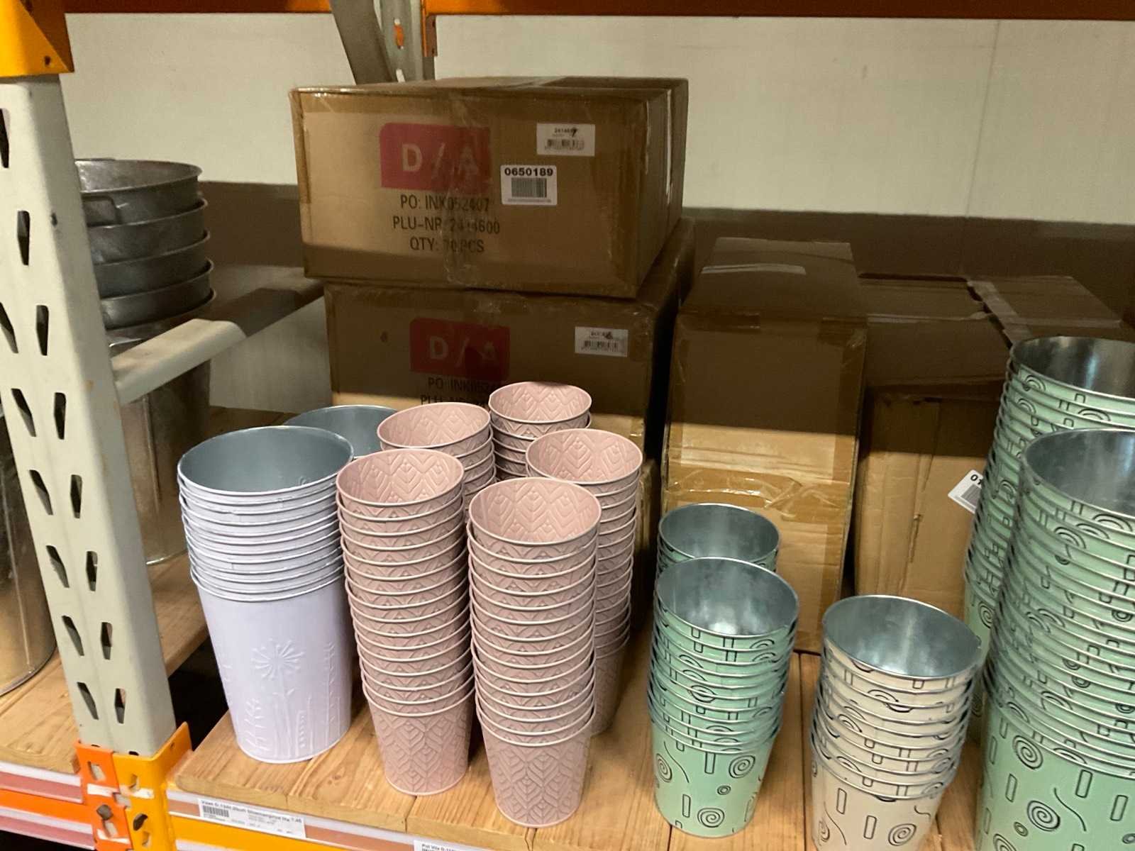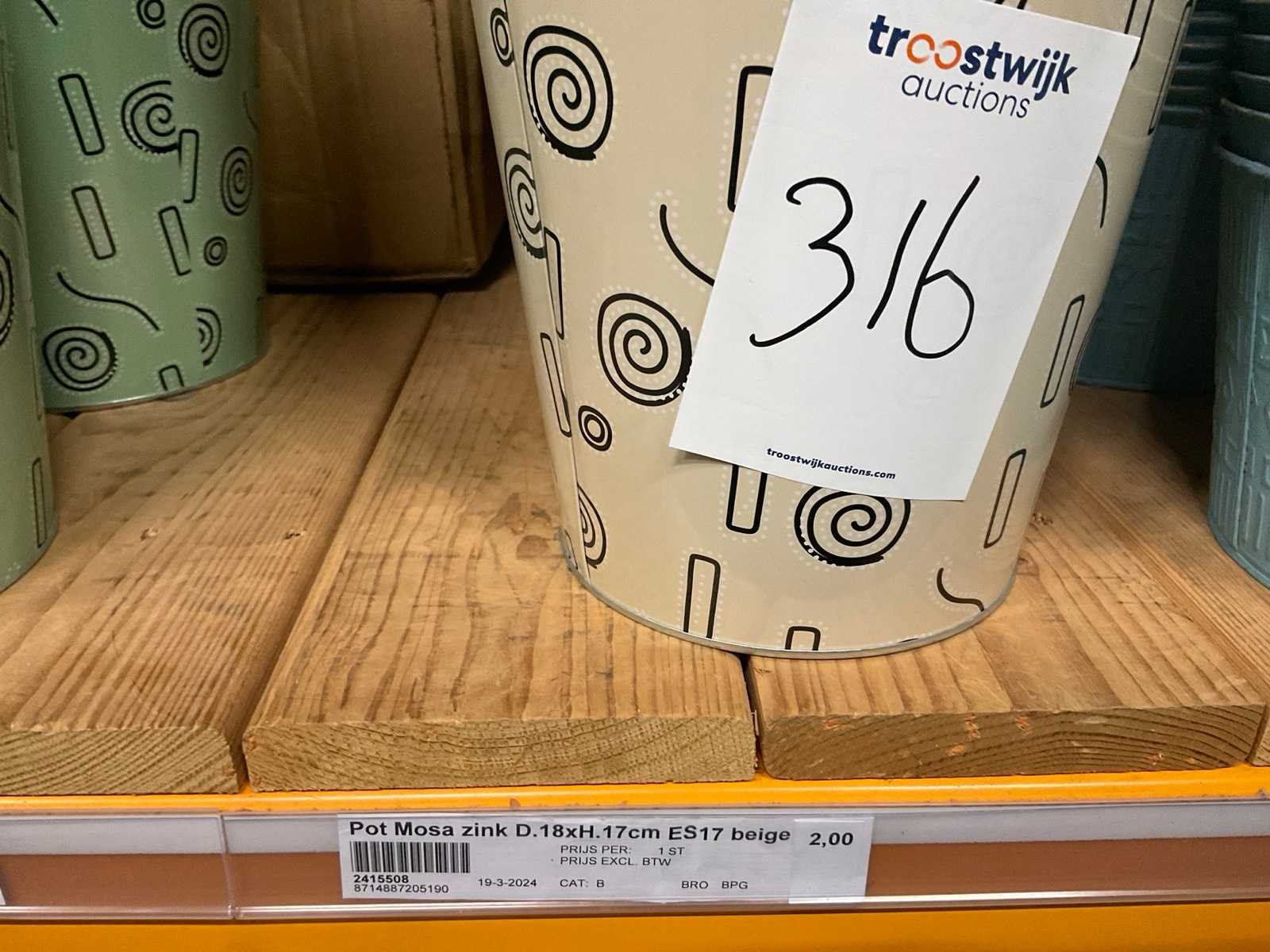 Potten en schalen van metaal in 2 stellingsvakken naast elkaar. Product type: Metalen