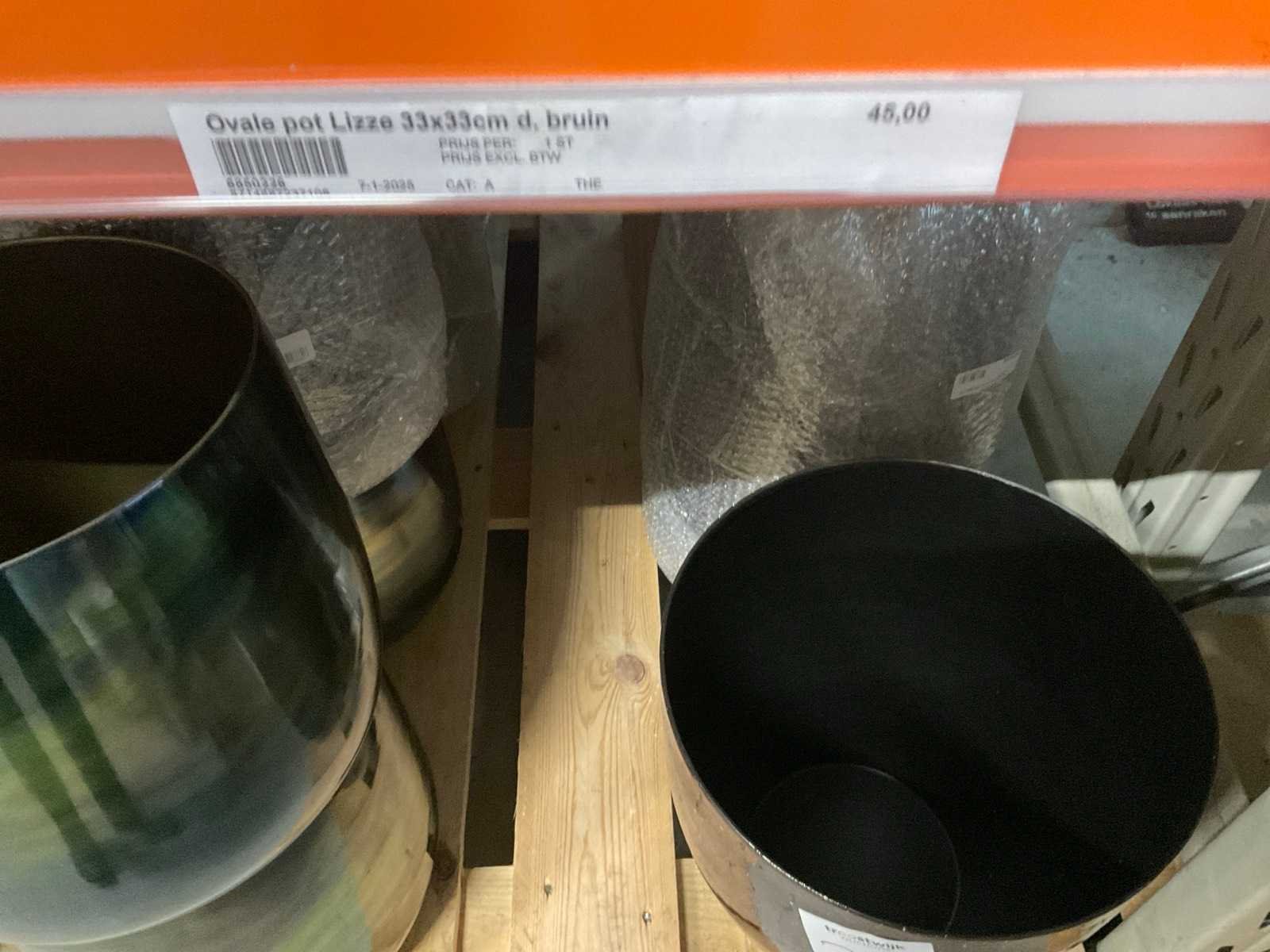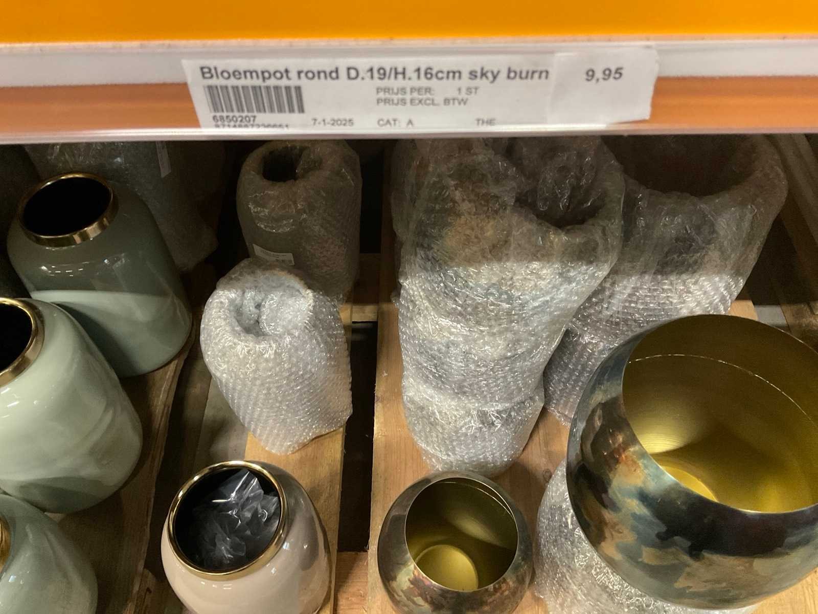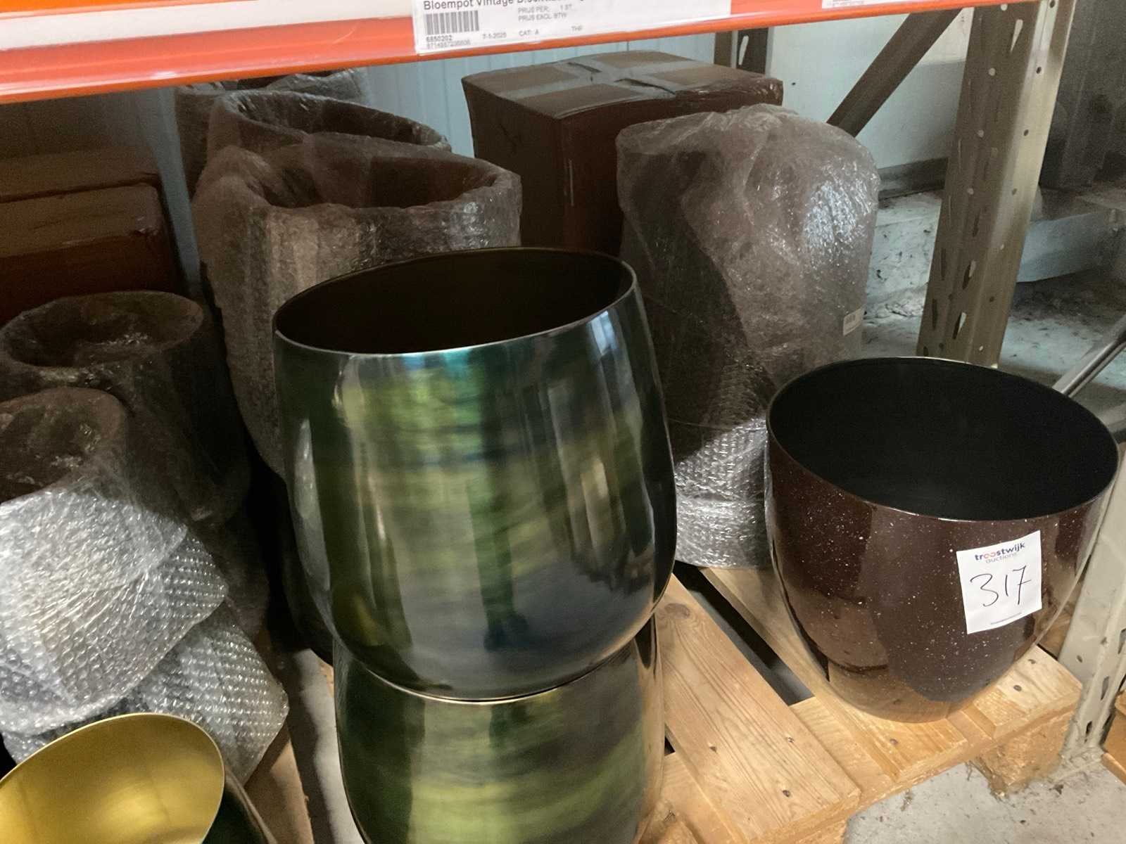 Vazen en potten in 2 stellingsvakken, diverse formaten, stijlen en kleuren, op 5 pallets, inclusief pallets. Product type: Metalen