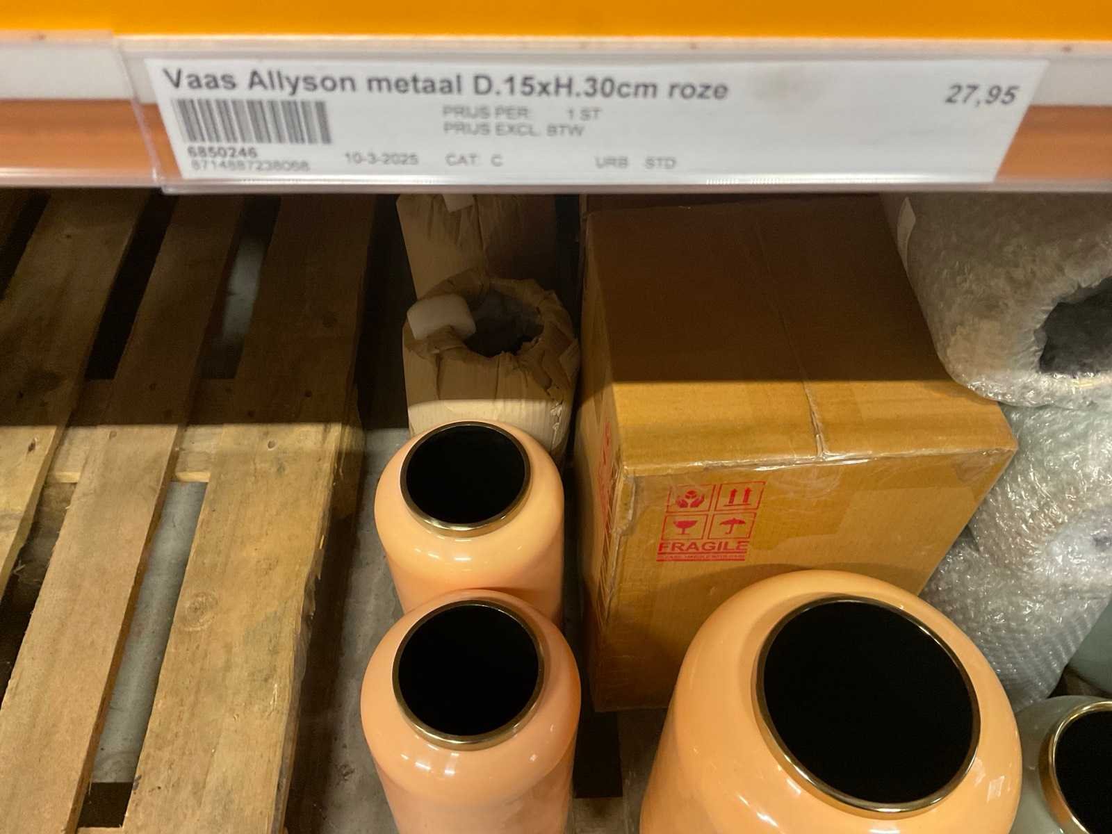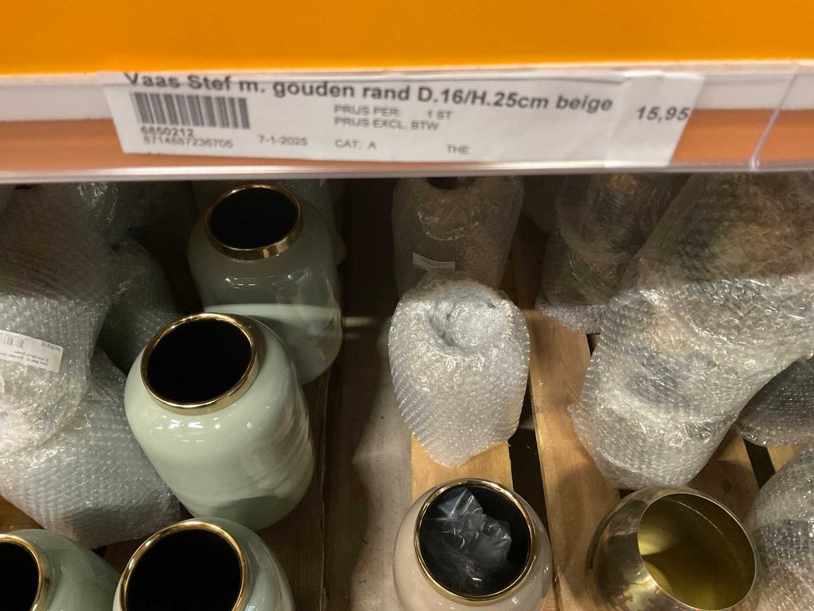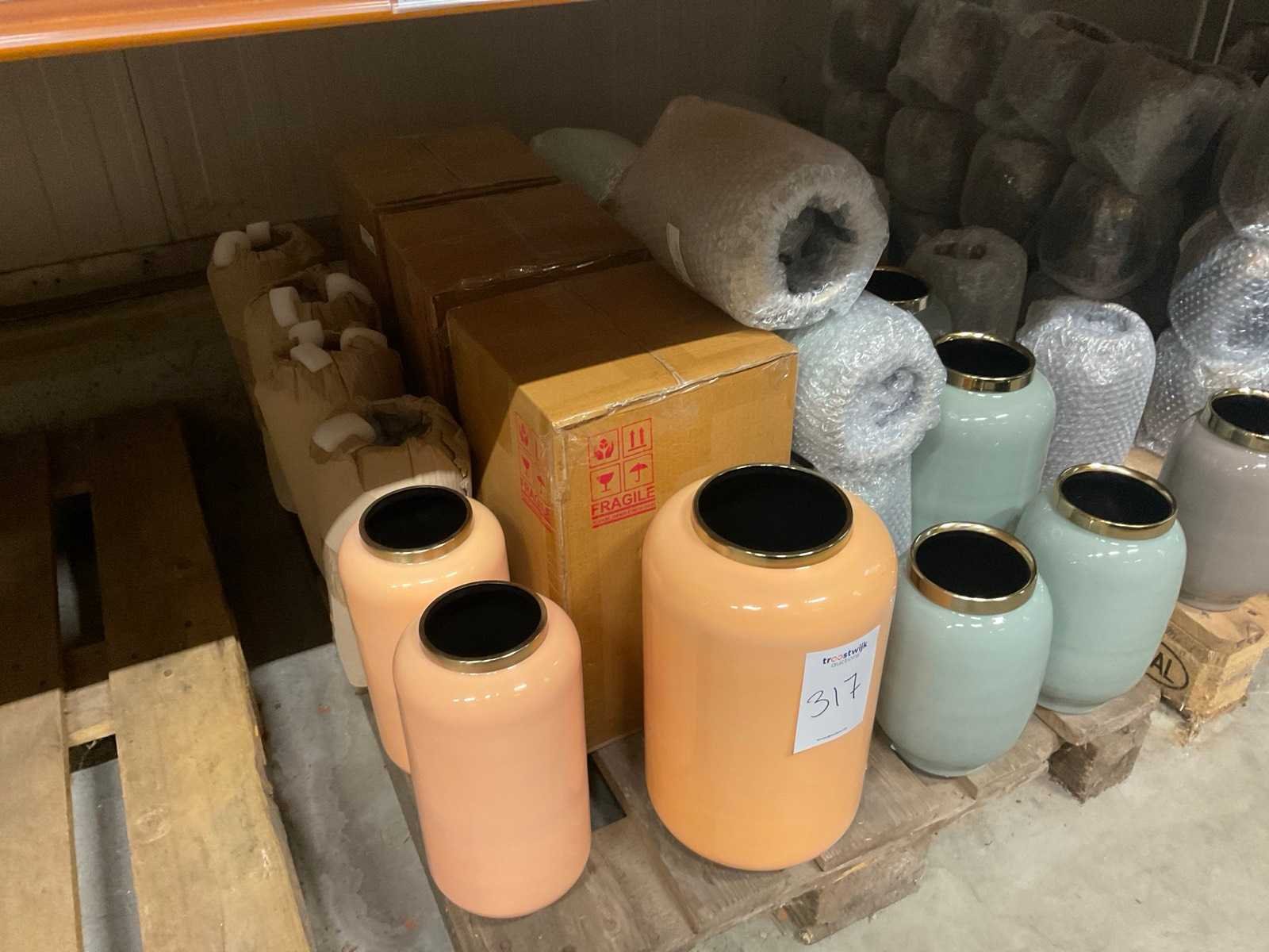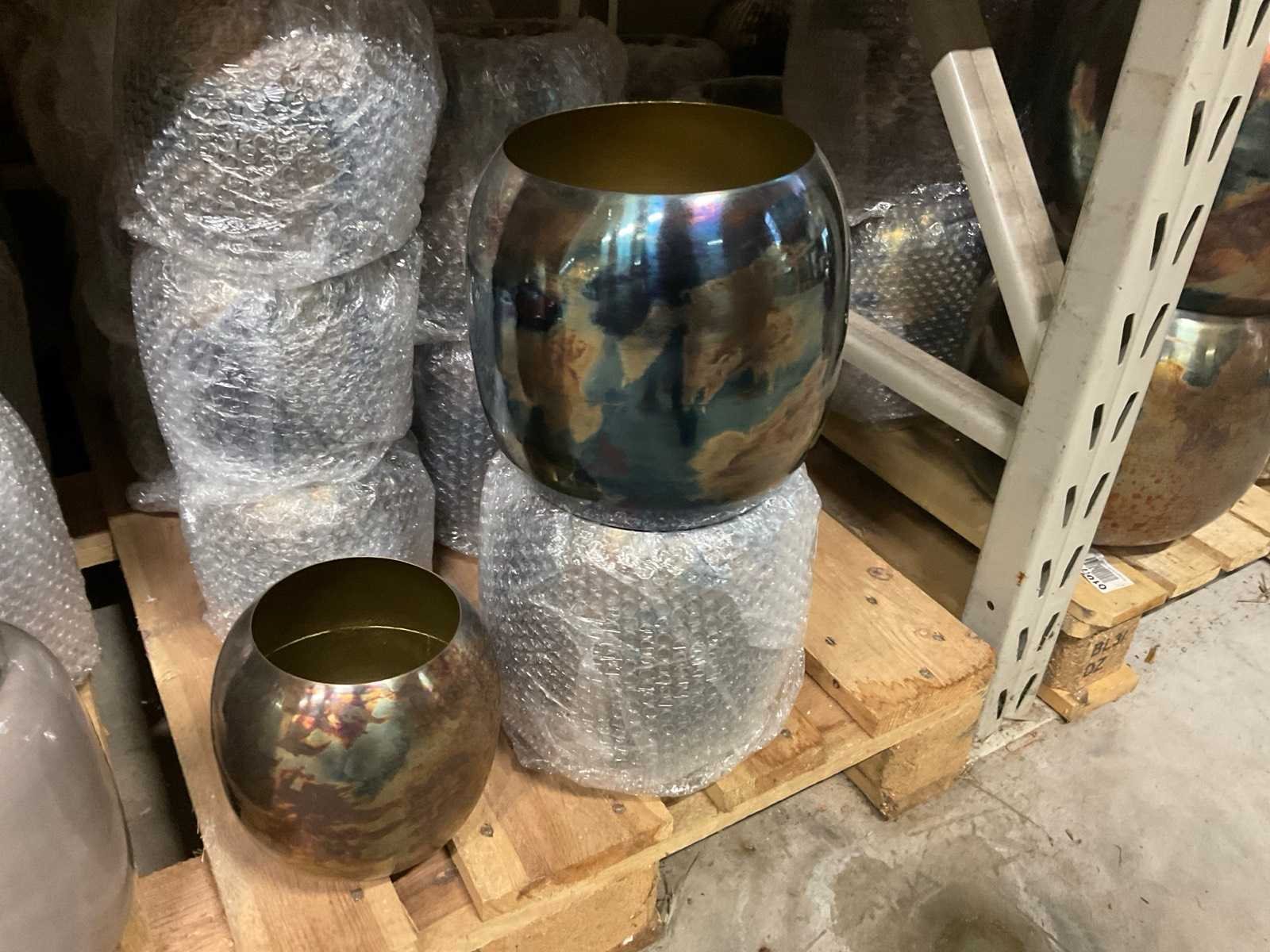 Vazen en potten in 2 stellingsvakken, diverse formaten, stijlen en kleuren, op 5 pallets, inclusief pallets. Product type: Metalen