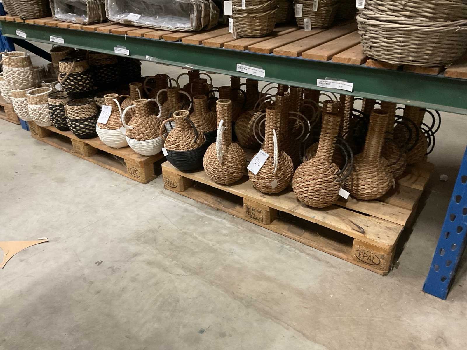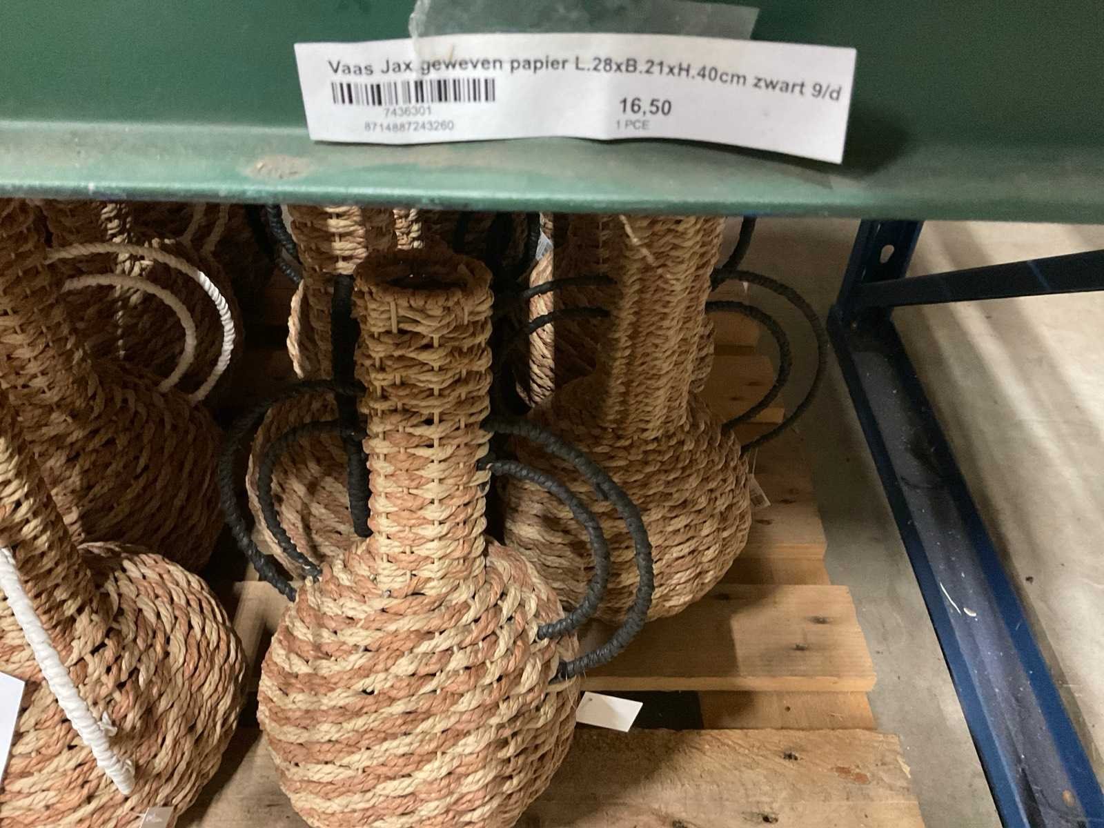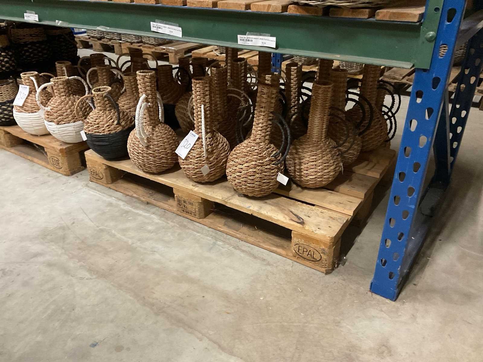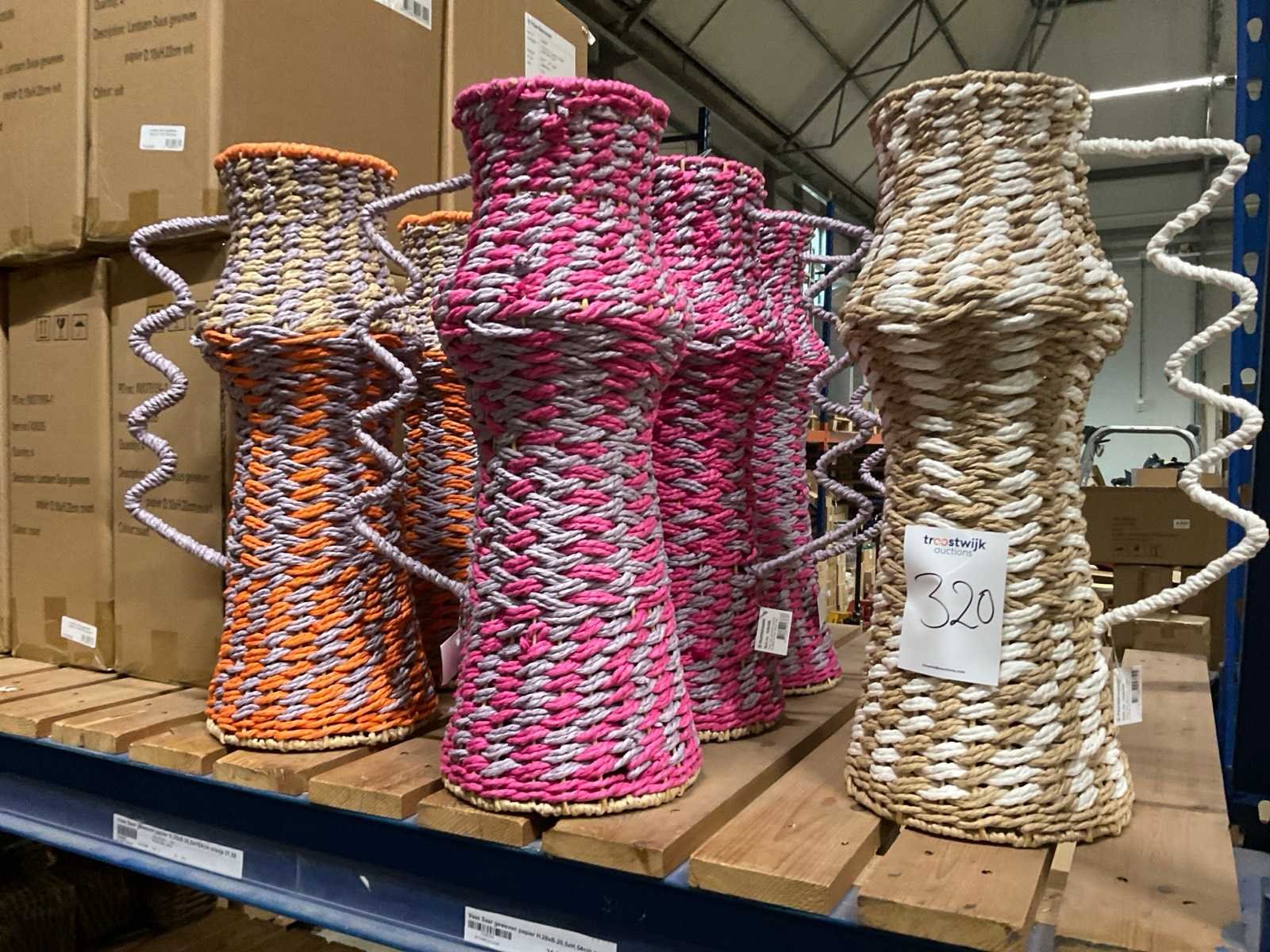 Vazen en lantaarns geweven, diverse maten en modellen w.o. Suus, Saar, Jax, Jos, ets, op pallets en in/onder stelling, inclusief pallet. Materiaal: Kunststof