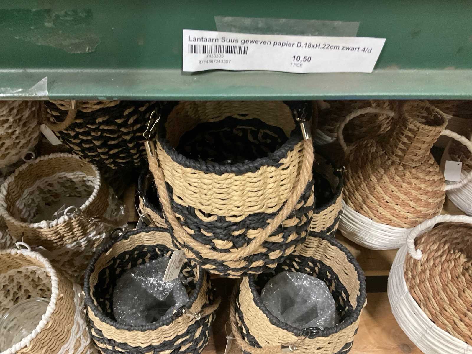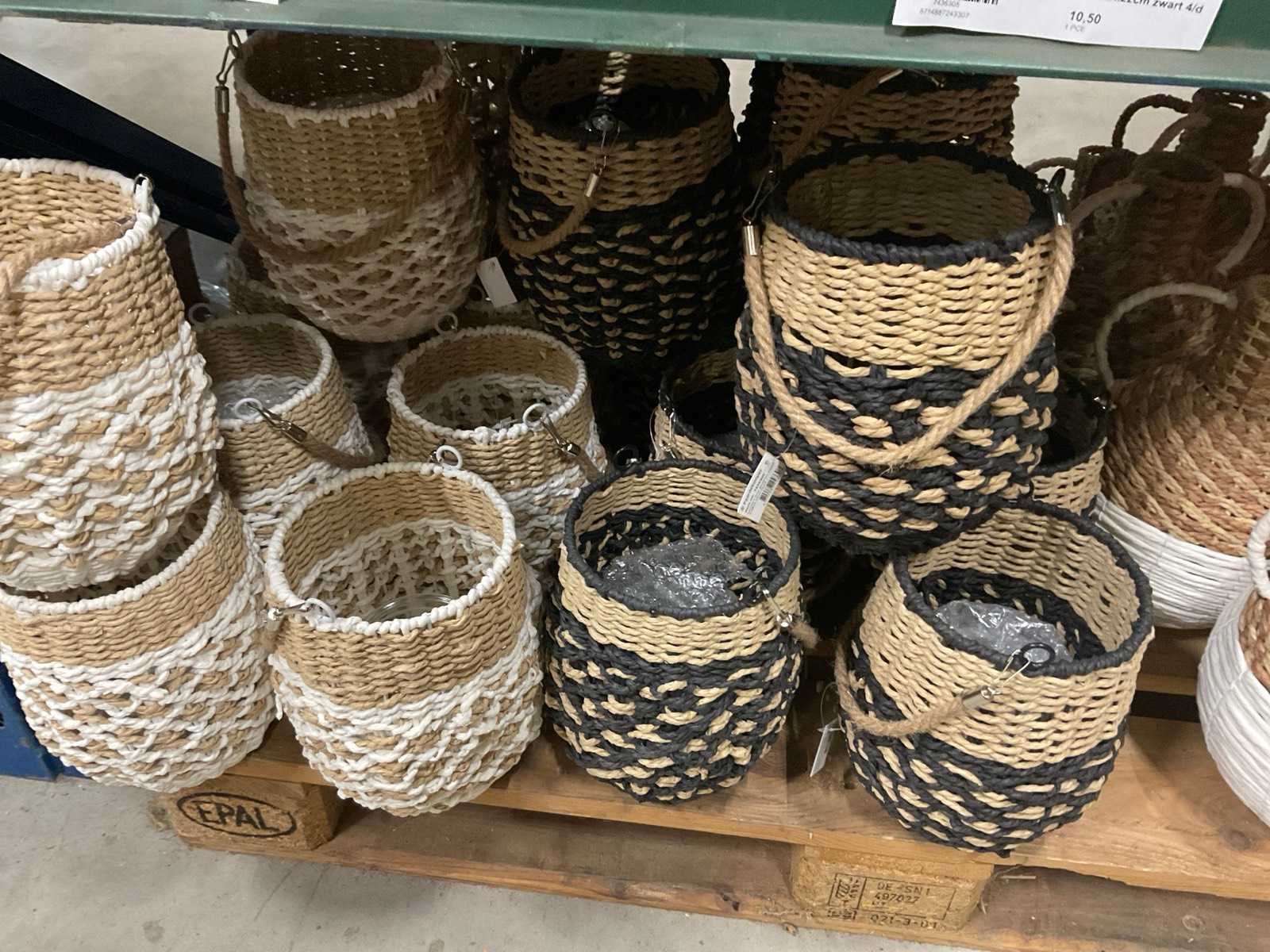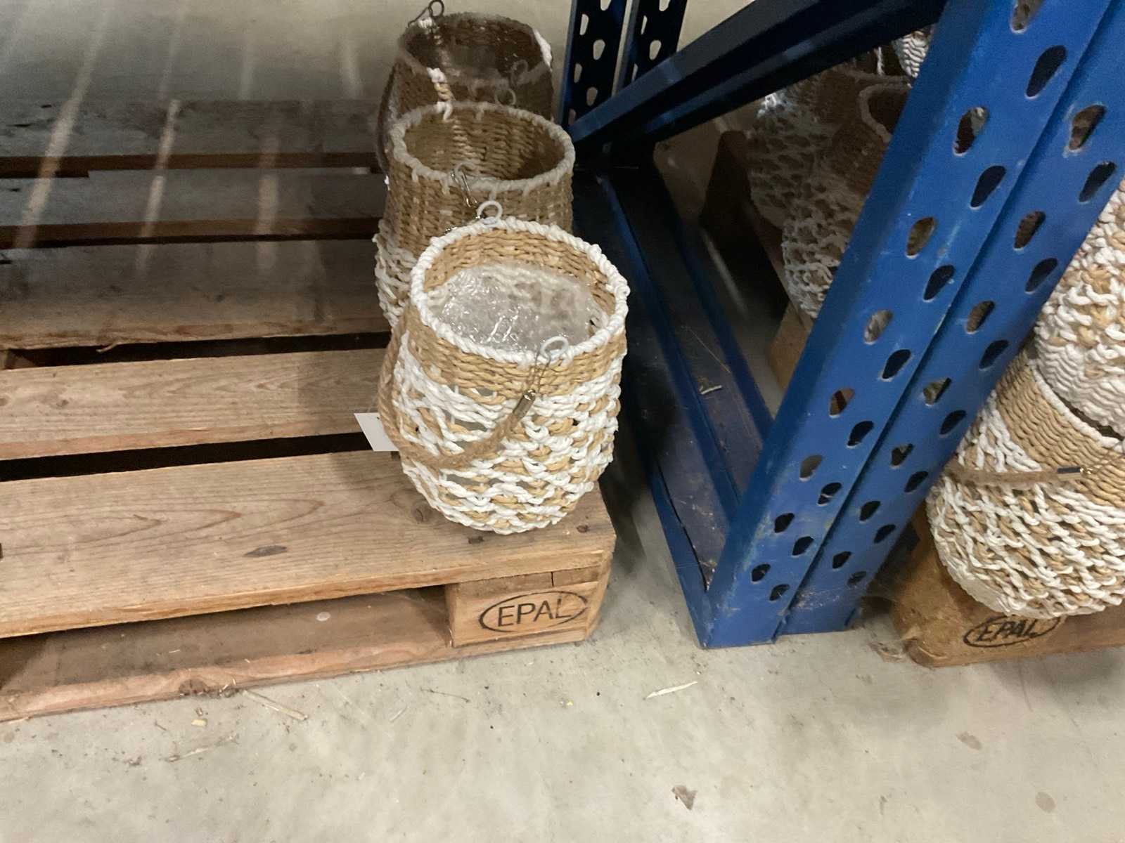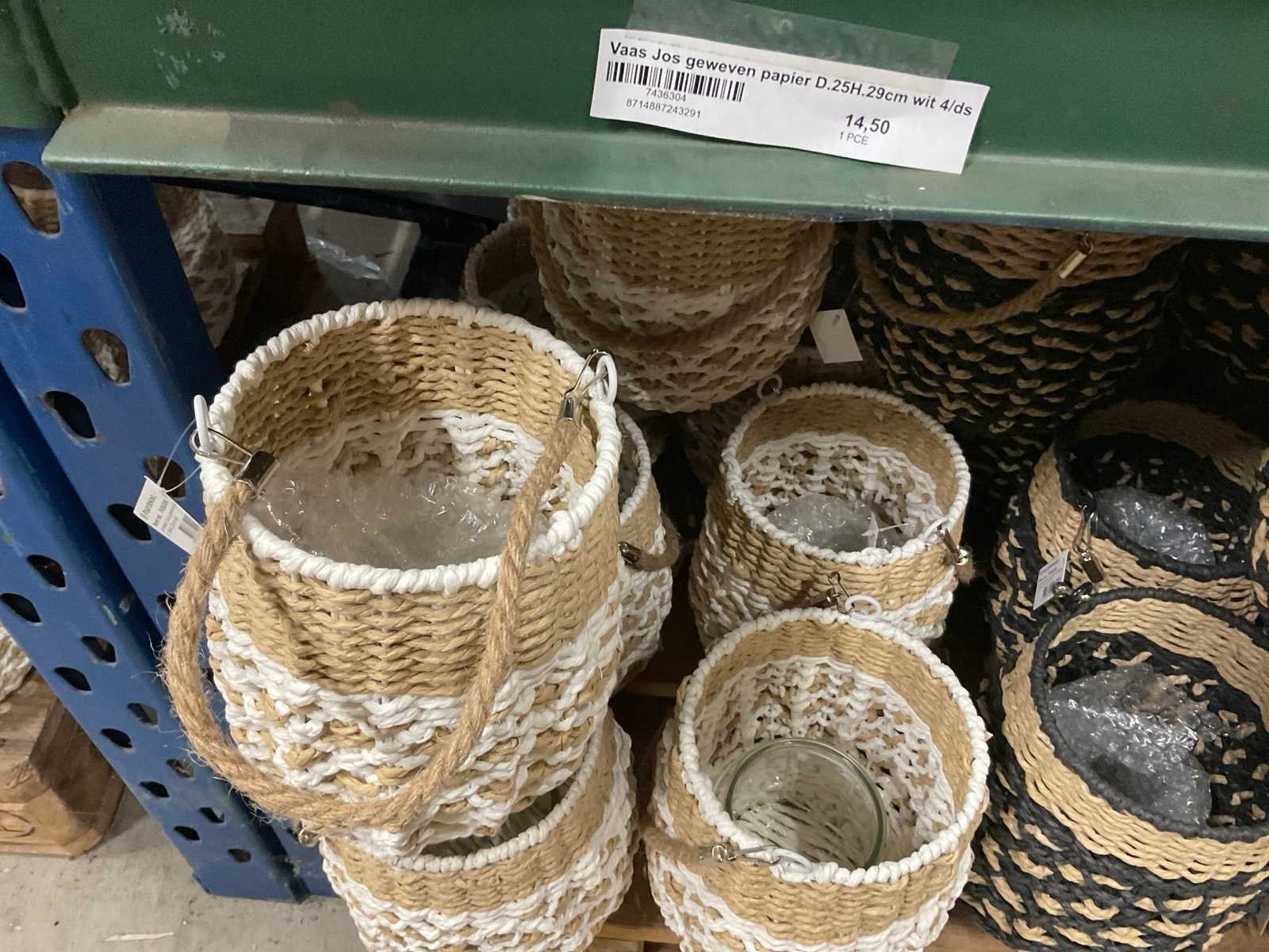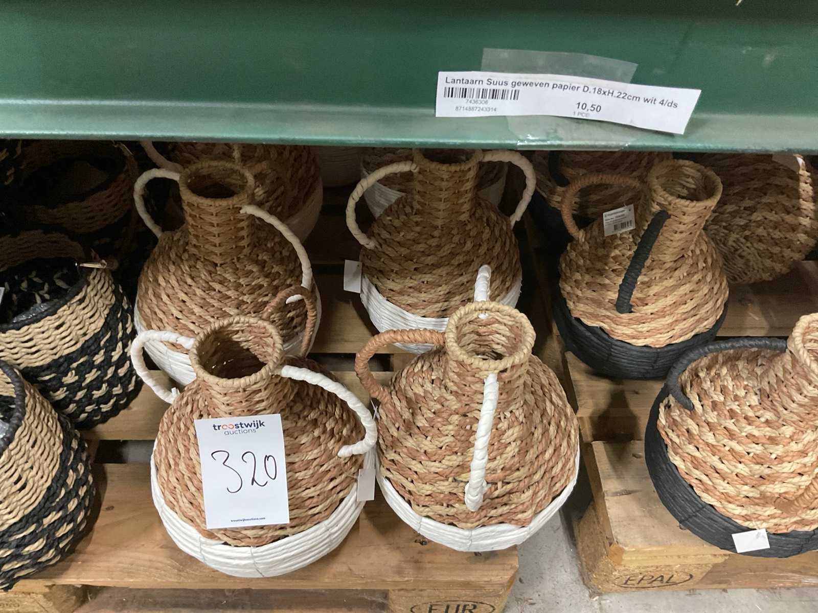 Vazen en lantaarns geweven, diverse maten en modellen w.o. Suus, Saar, Jax, Jos, ets, op pallets en in/onder stelling, inclusief pallet. Materiaal: Kunststof