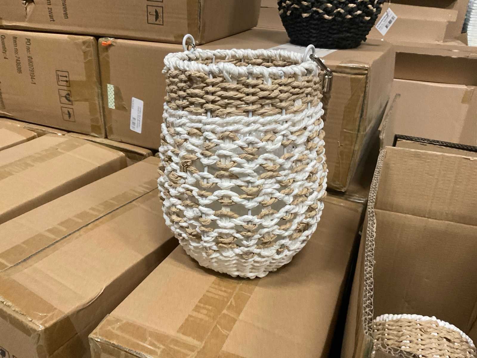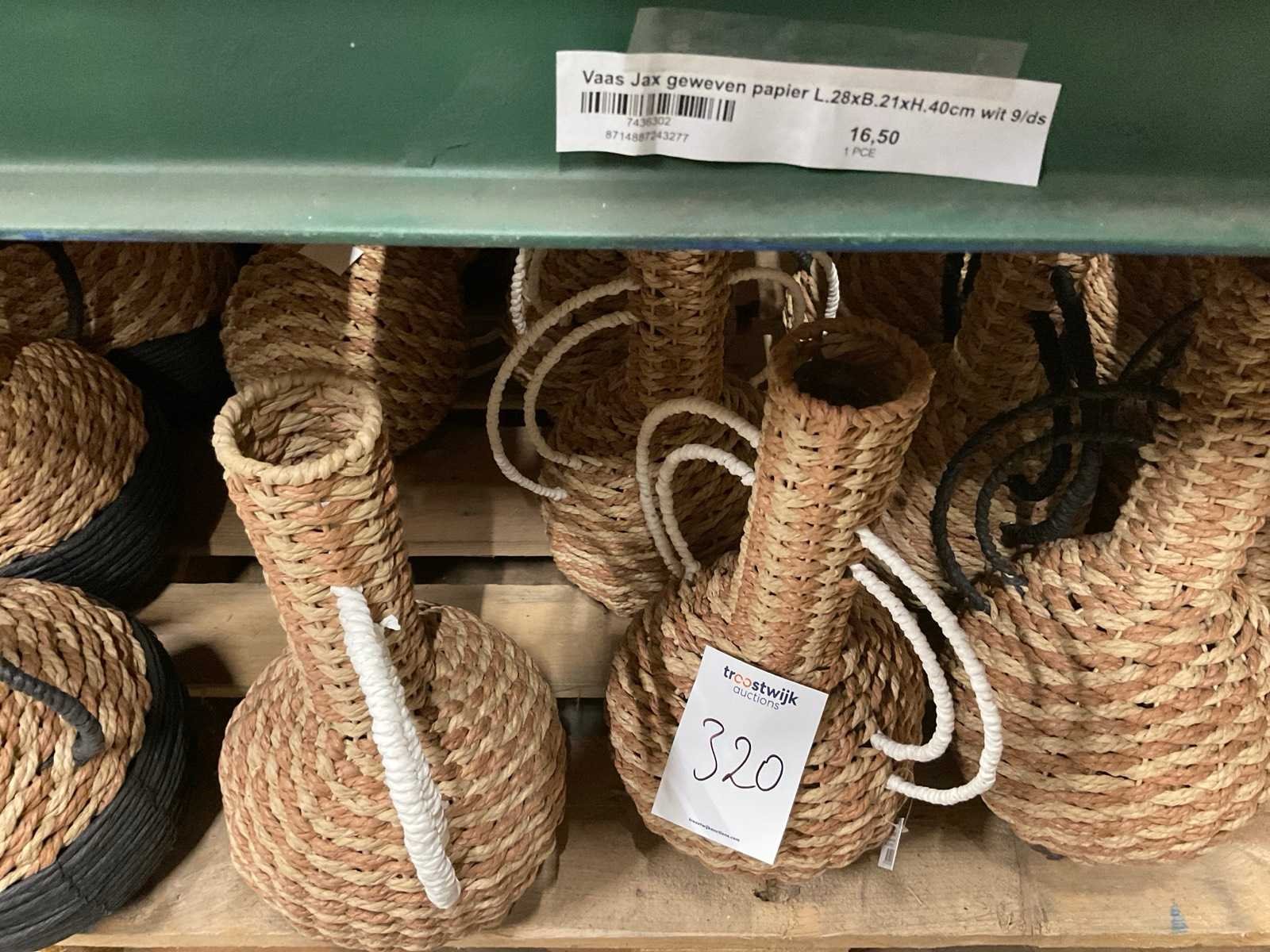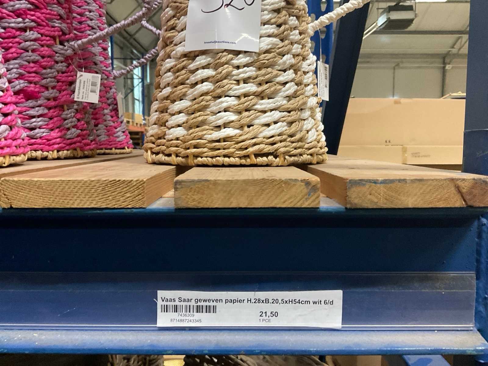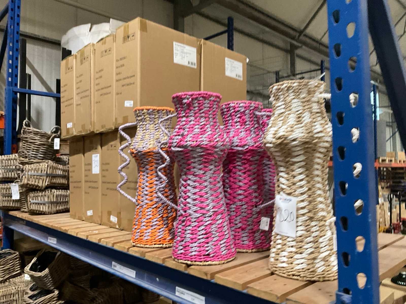 Vazen en lantaarns geweven, diverse maten en modellen w.o. Suus, Saar, Jax, Jos, ets, op pallets en in/onder stelling, inclusief pallet. Materiaal: Kunststof