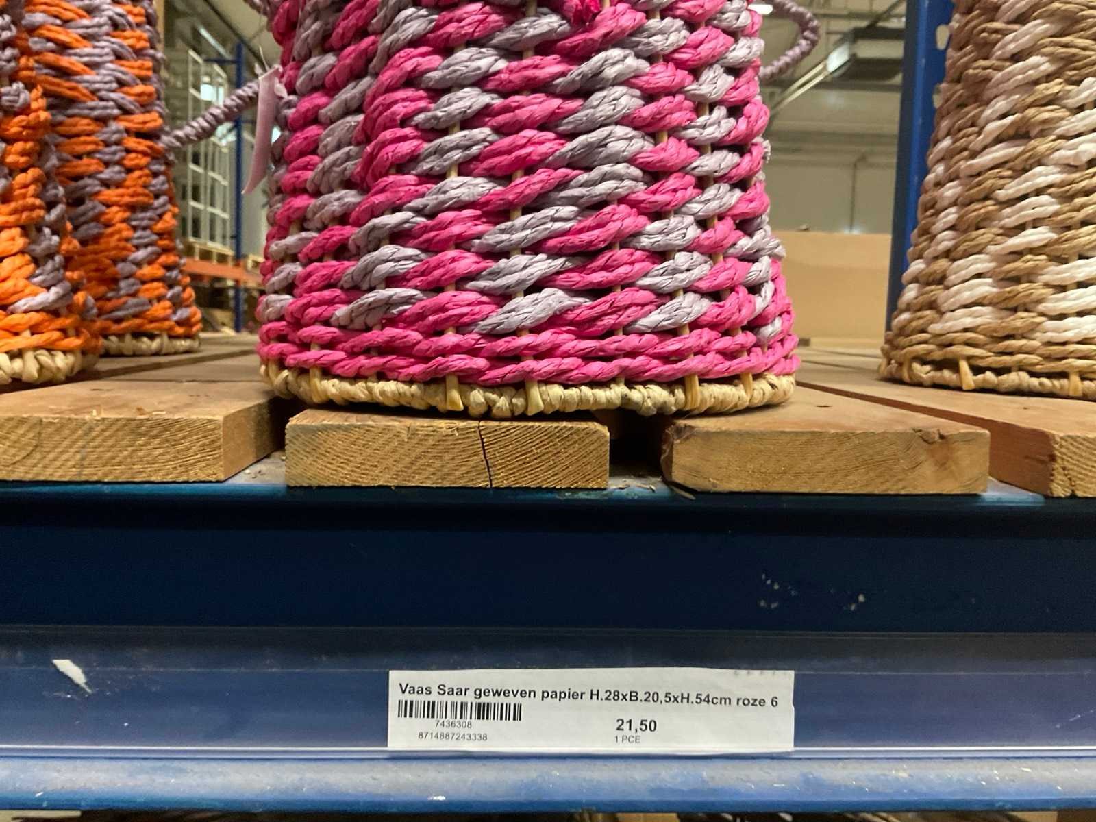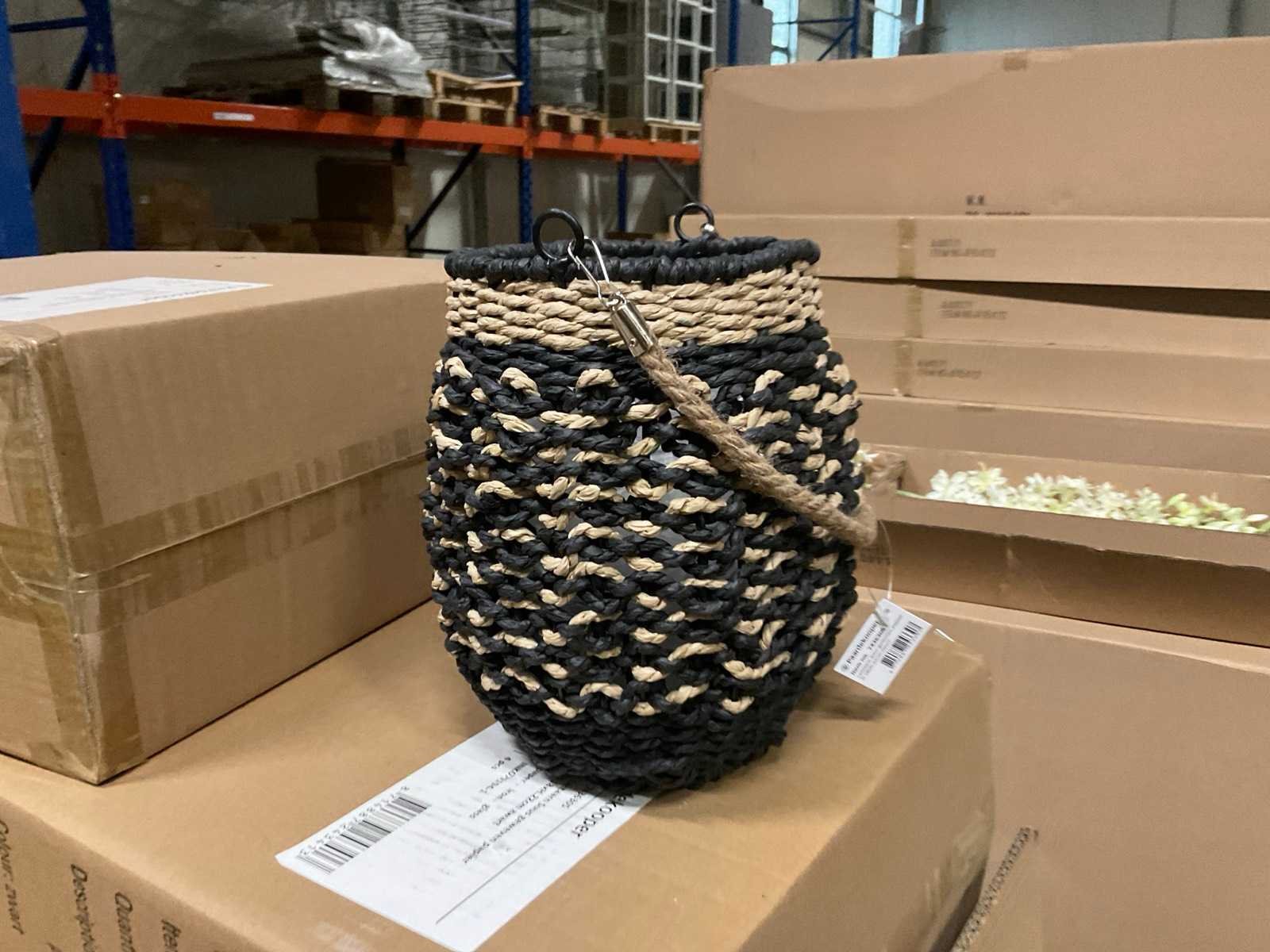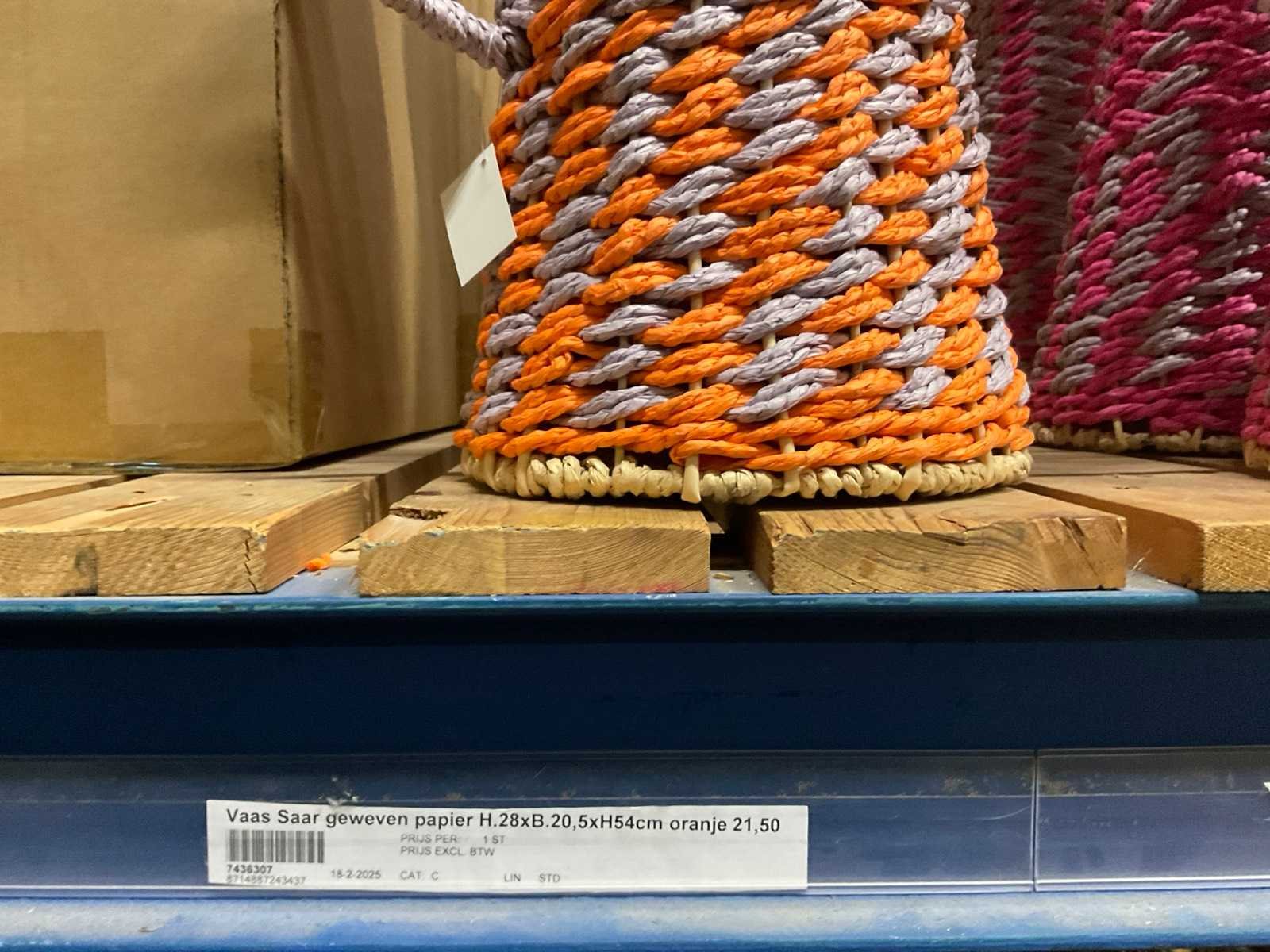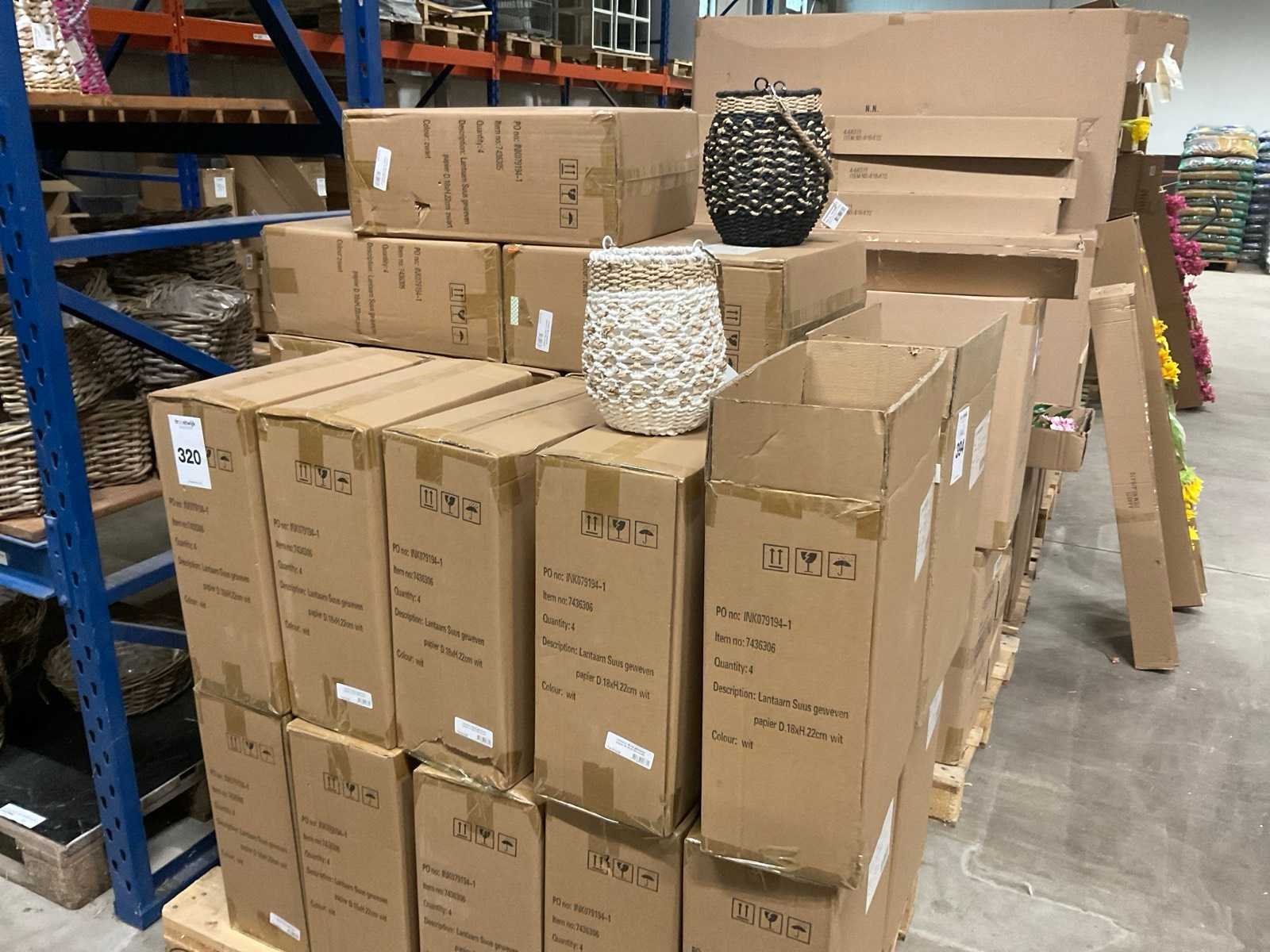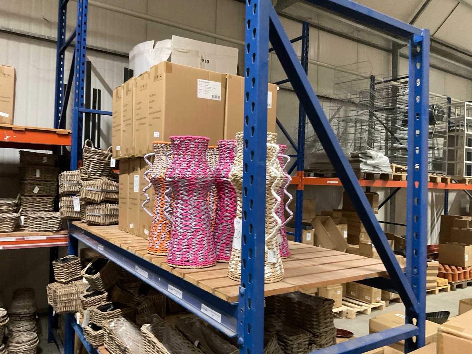 Vazen en lantaarns geweven, diverse maten en modellen w.o. Suus, Saar, Jax, Jos, ets, op pallets en in/onder stelling, inclusief pallet. Materiaal: Kunststof