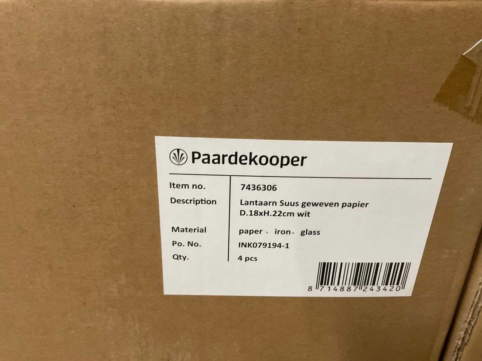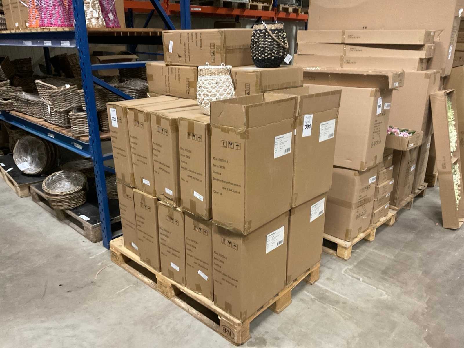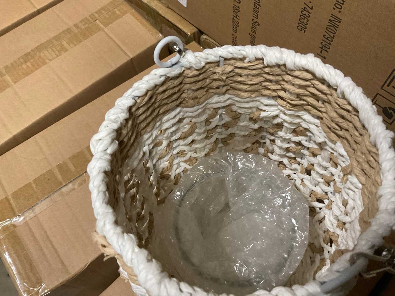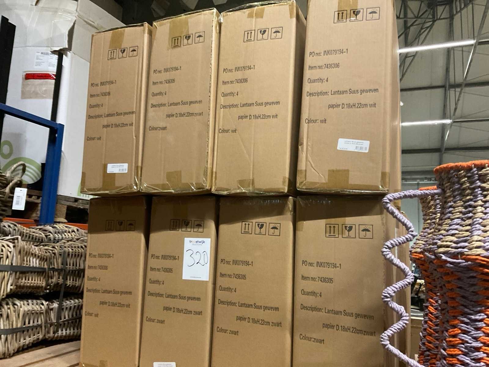 Vazen en lantaarns geweven, diverse maten en modellen w.o. Suus, Saar, Jax, Jos, ets, op pallets en in/onder stelling, inclusief pallet. Materiaal: Kunststof