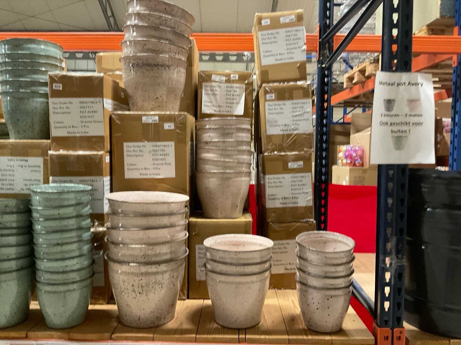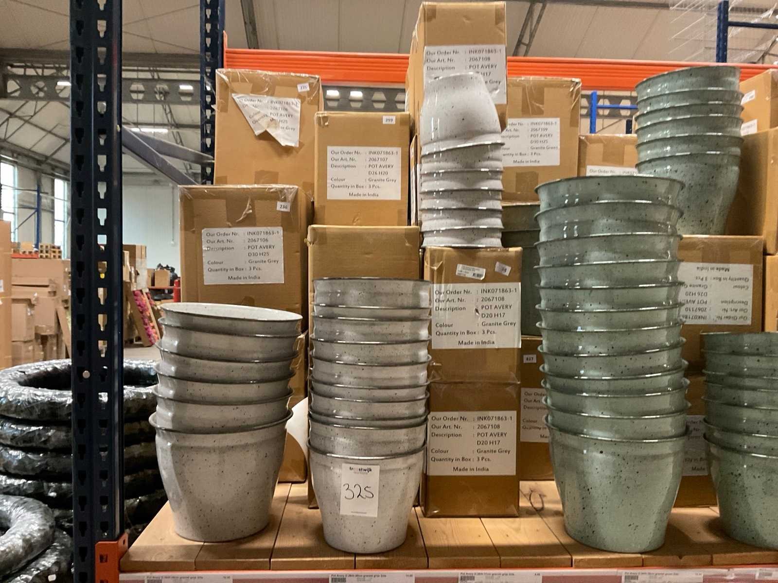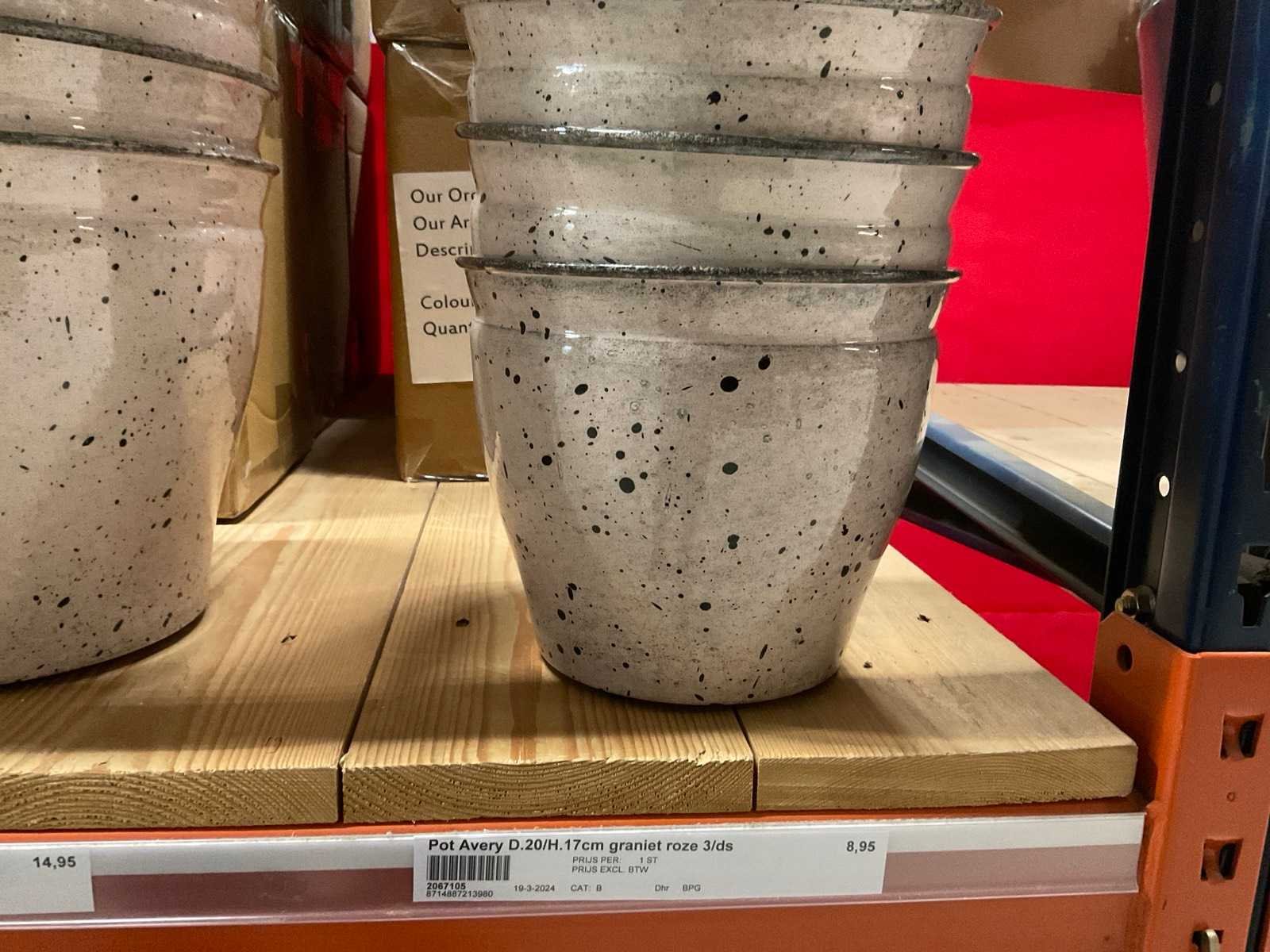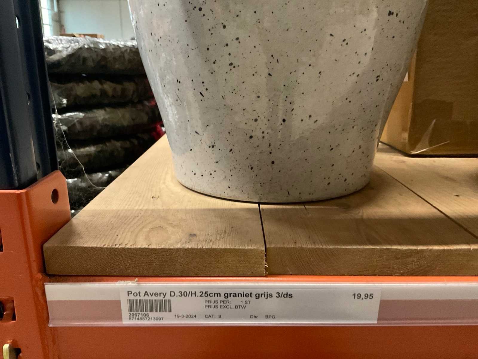 In 3 kleuren, graniet green, grey en pink, in diverse formaten, op 1 pallet en in 1 stellingvak, inclusief pallet. Materiaal: Kunststof