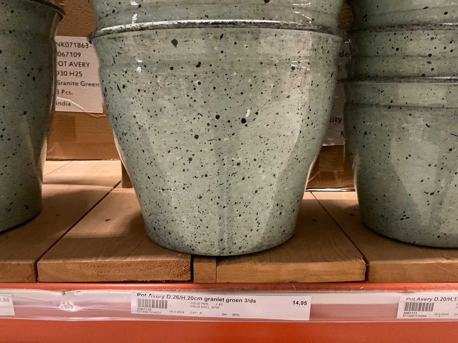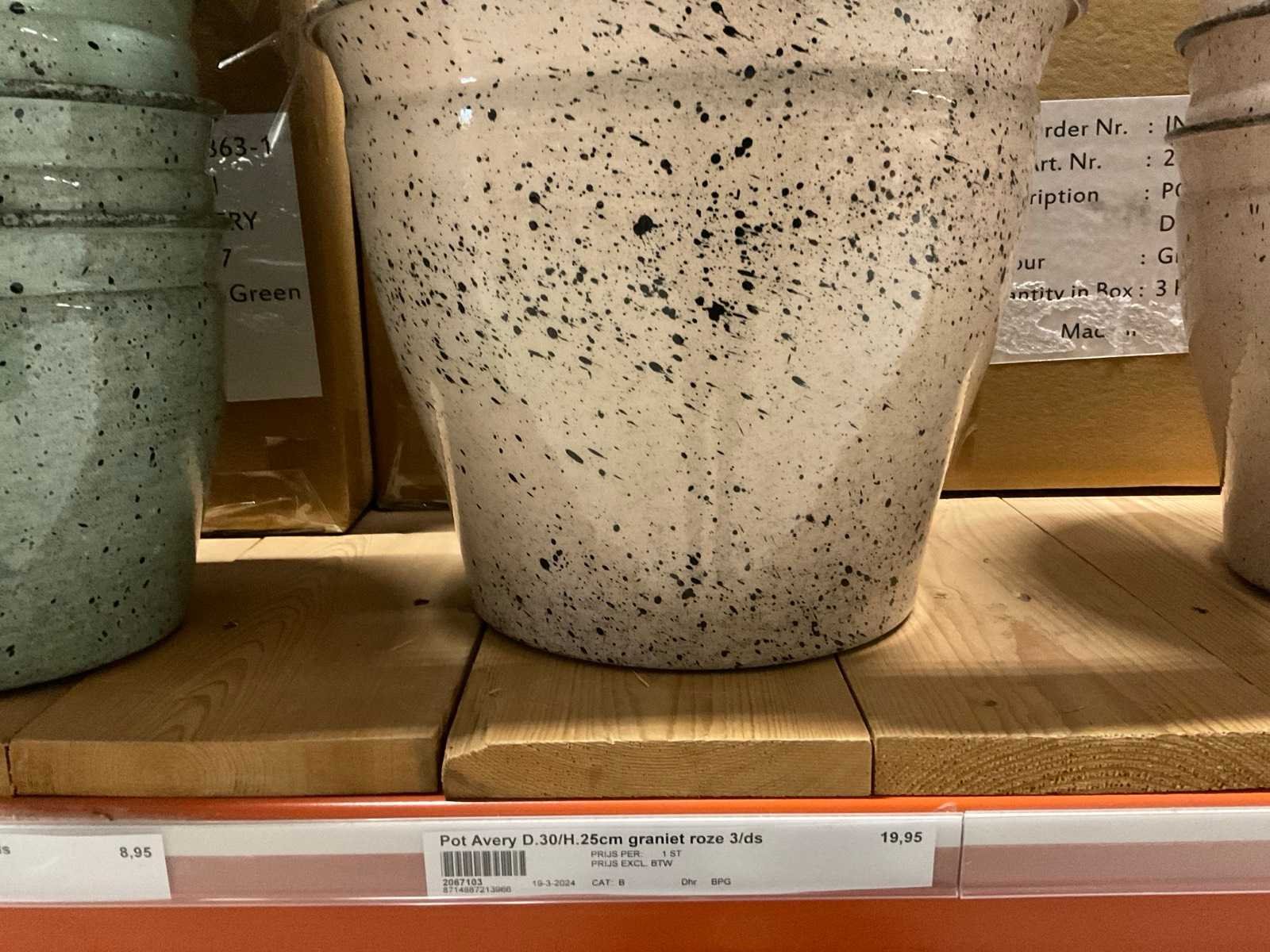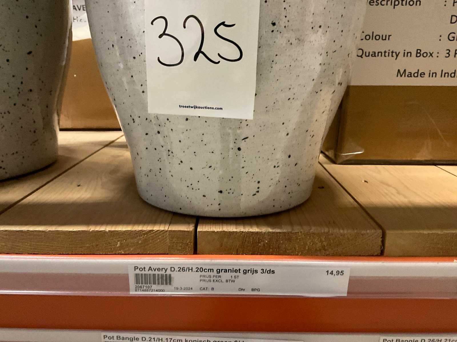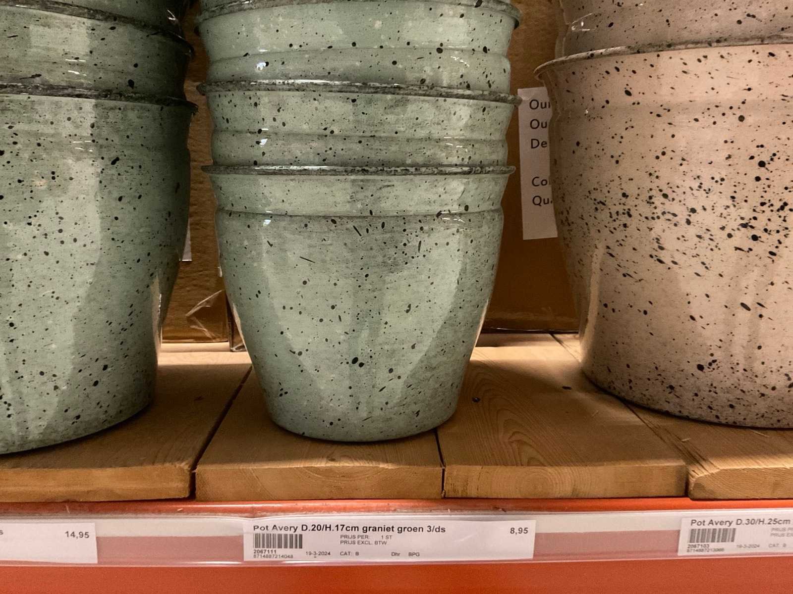 In 3 kleuren, graniet green, grey en pink, in diverse formaten, op 1 pallet en in 1 stellingvak, inclusief pallet. Materiaal: Kunststof