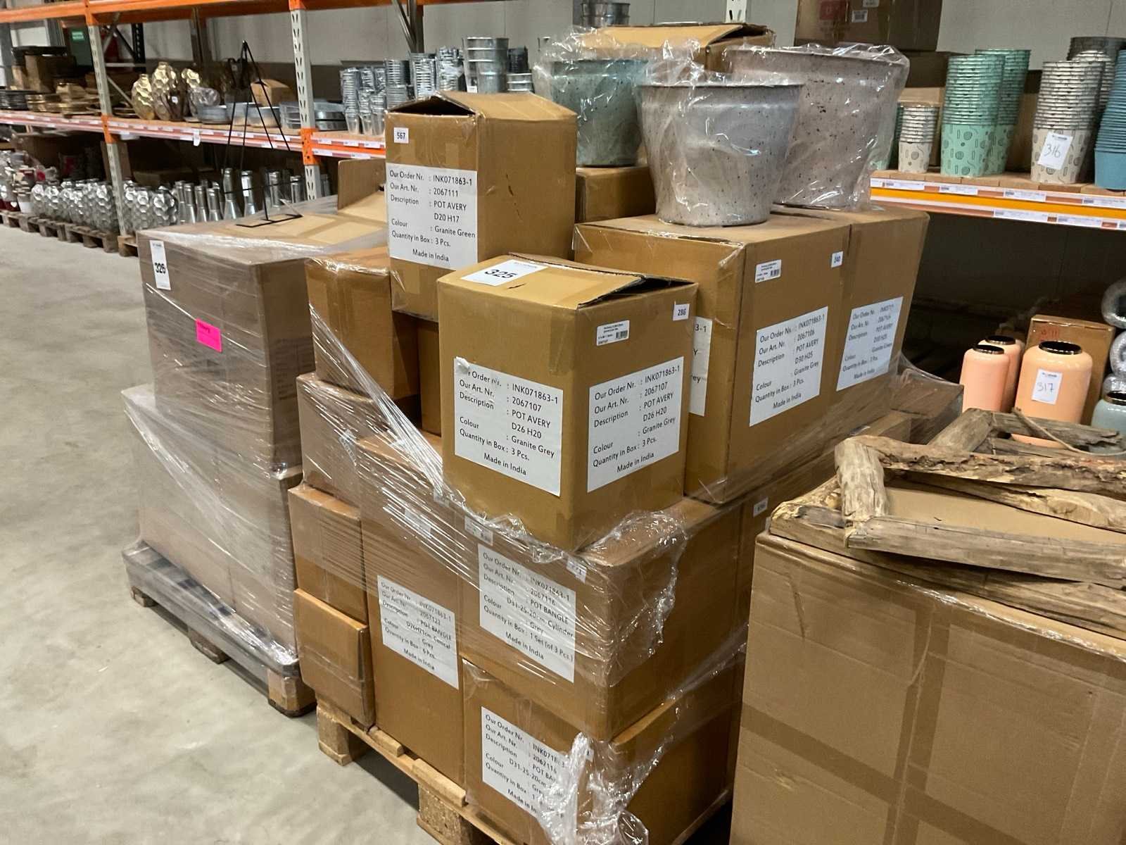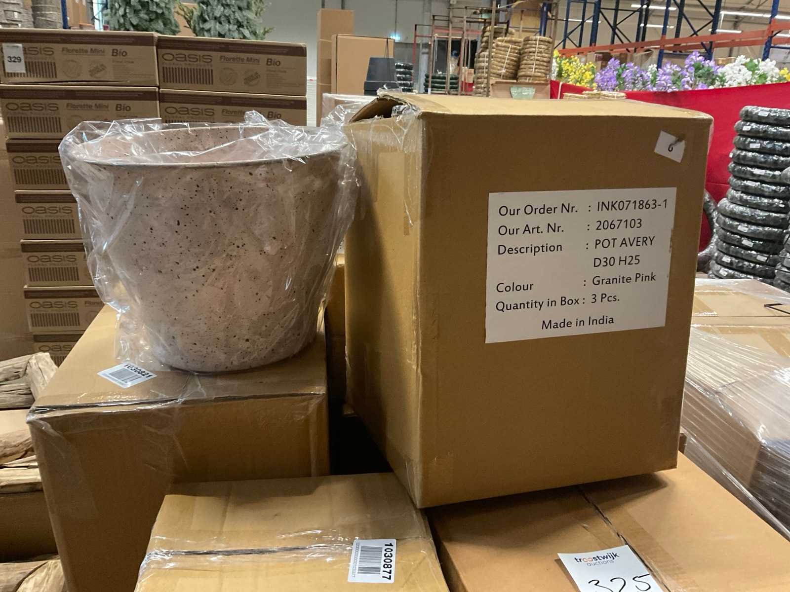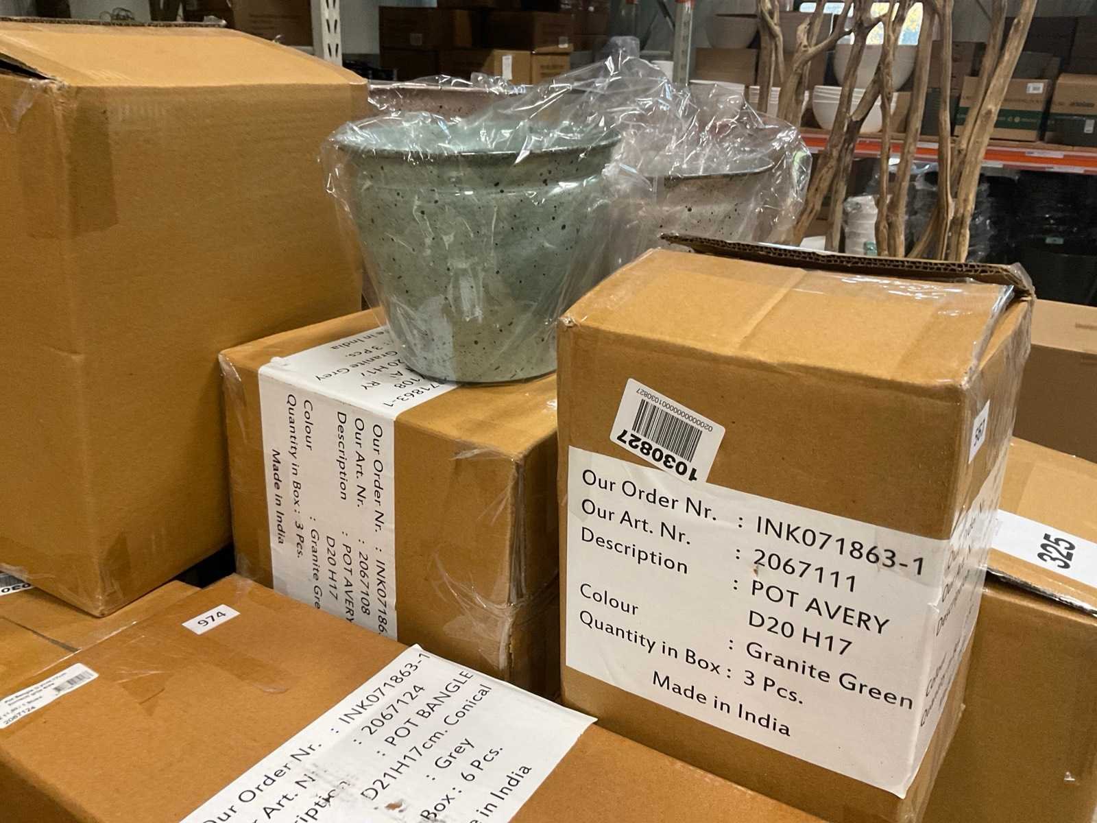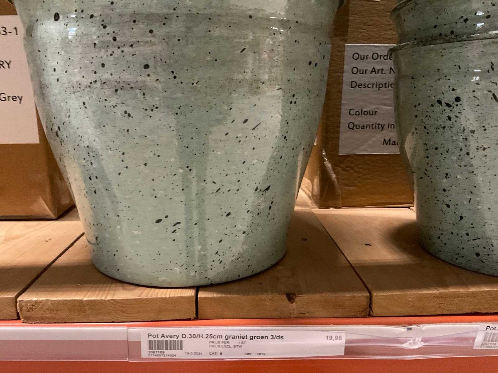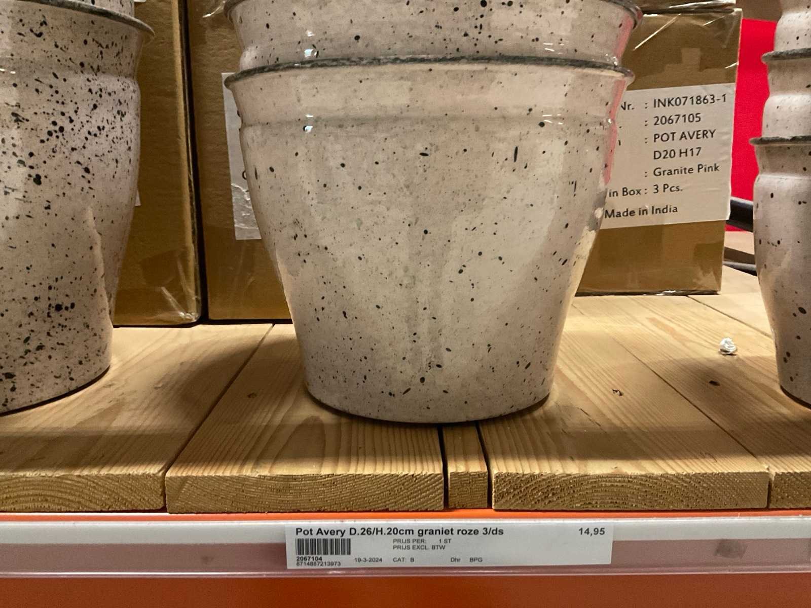 In 3 kleuren, graniet green, grey en pink, in diverse formaten, op 1 pallet en in 1 stellingvak, inclusief pallet. Materiaal: Kunststof