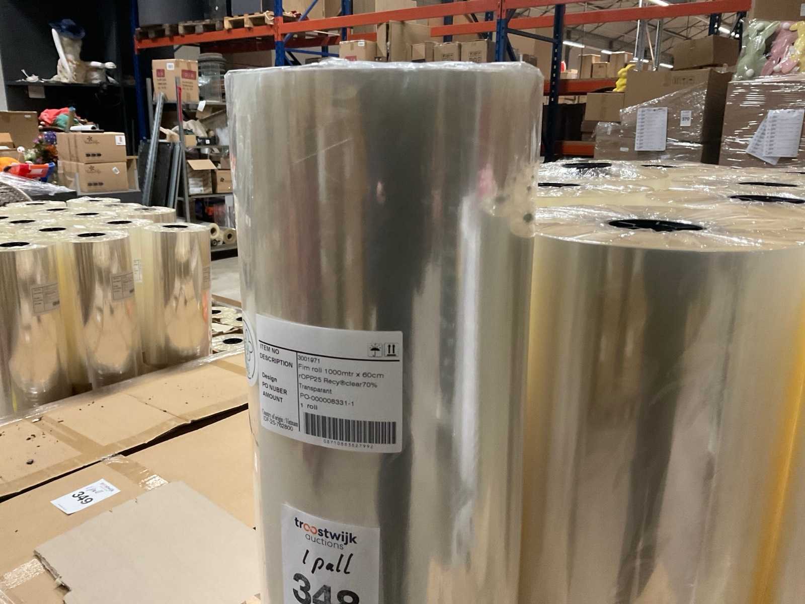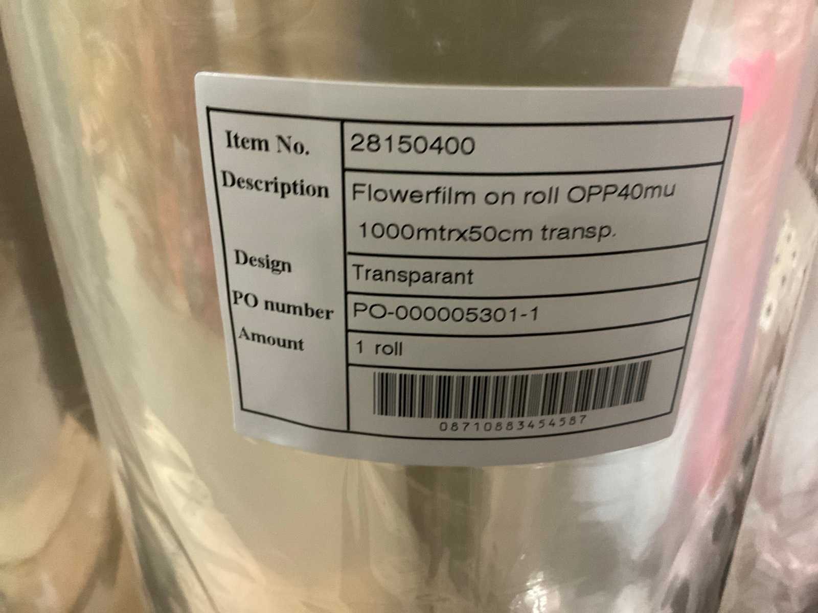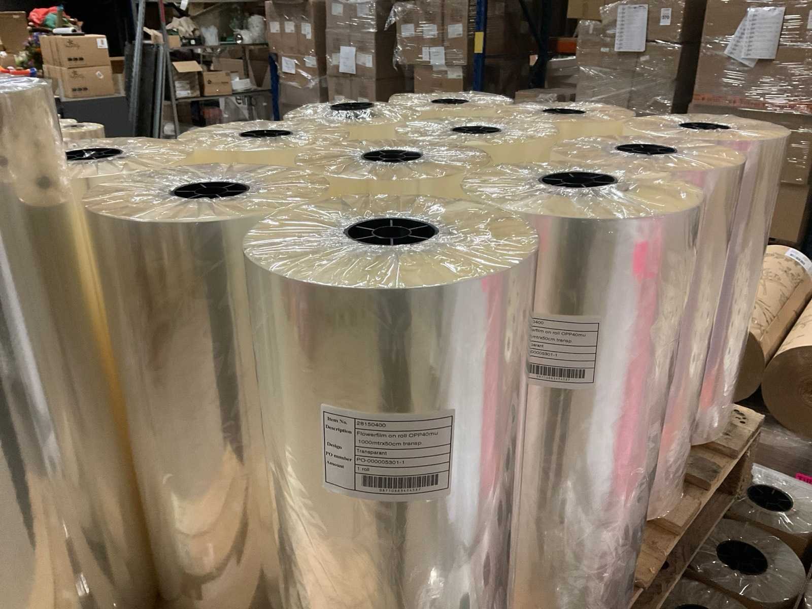 Folie op pallet, w.o. rOPP40 transparant, OPP40 flowerfilm on roll transparant, inclusief pallet. Model: OPP, rOPP