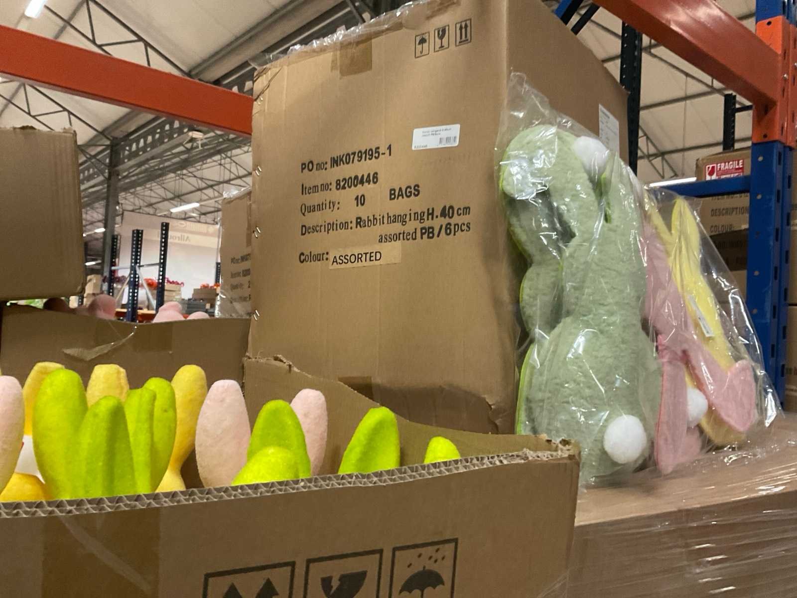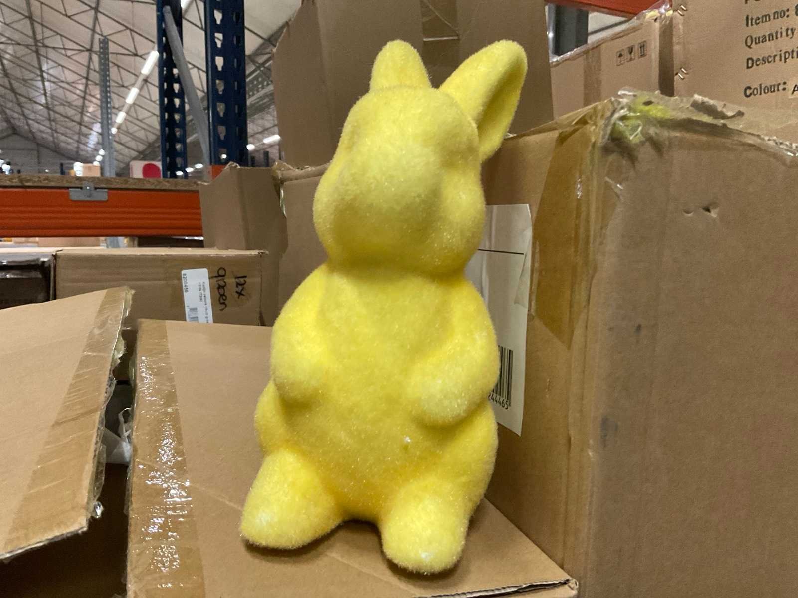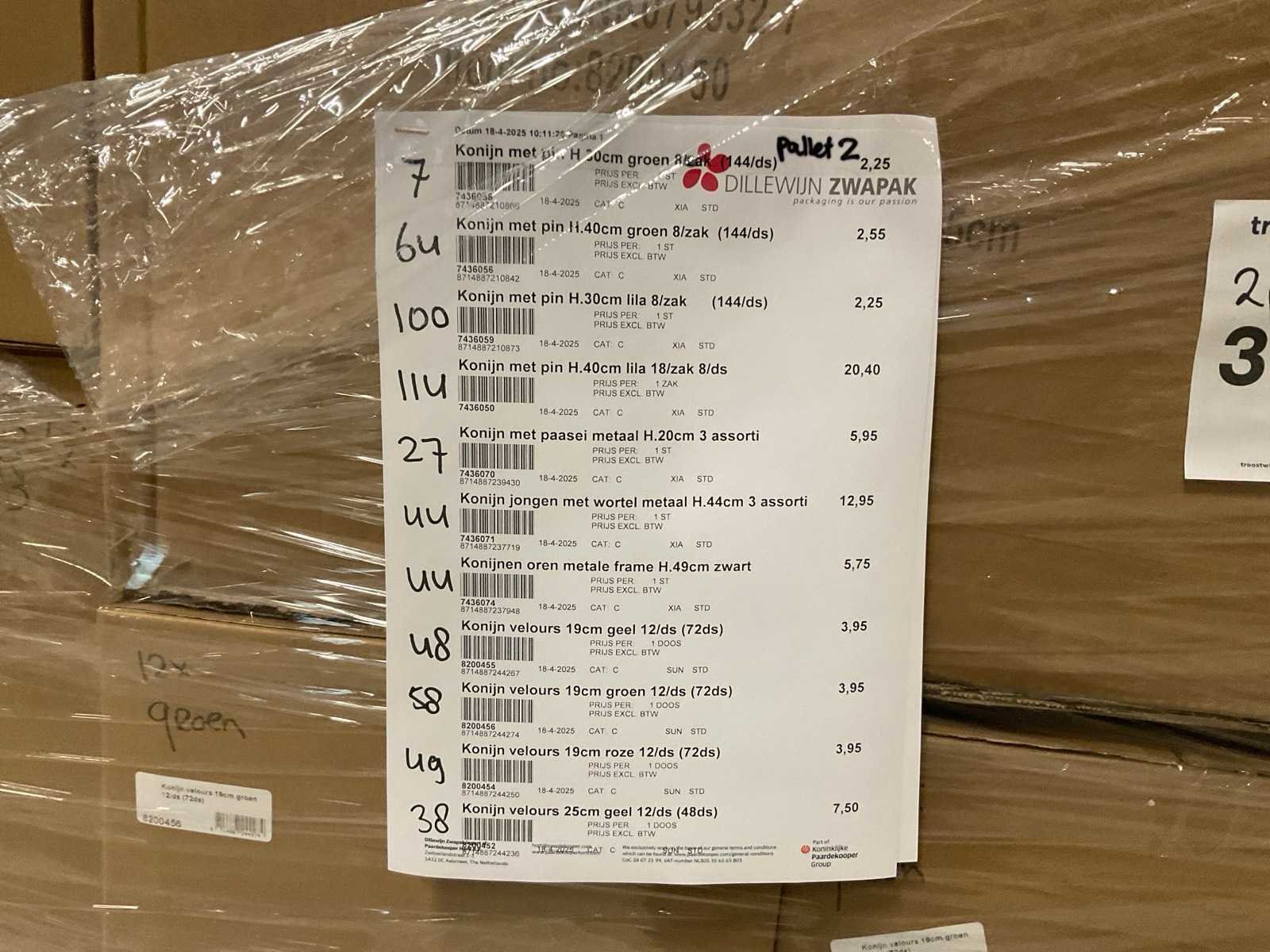 2cpallets met paasdecoratie w.o. Konijnen in diverse maten, uitvoeringen en kleuren, inclusief pallets.