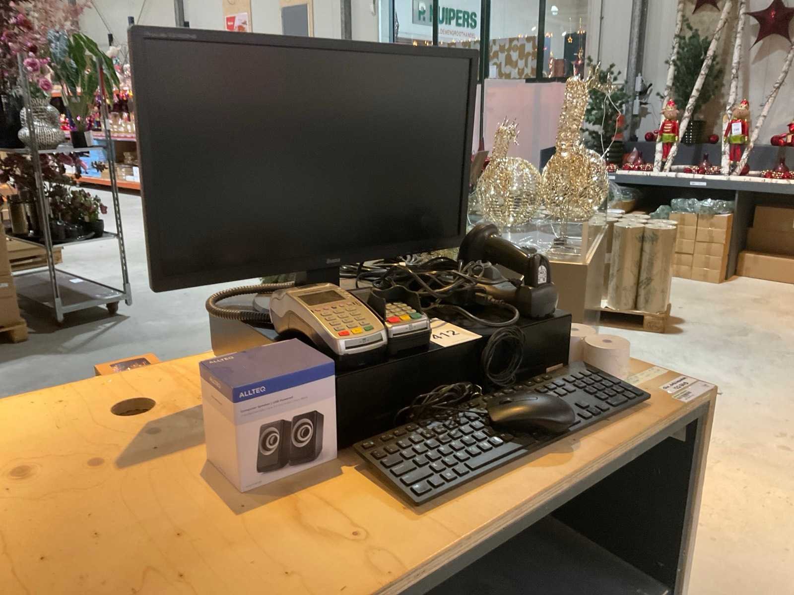 Bestaande uit kassalade, Verifone pinautomaat met klantendisplay, barcodescanner, speakerset, toetsenbord en computermuis.