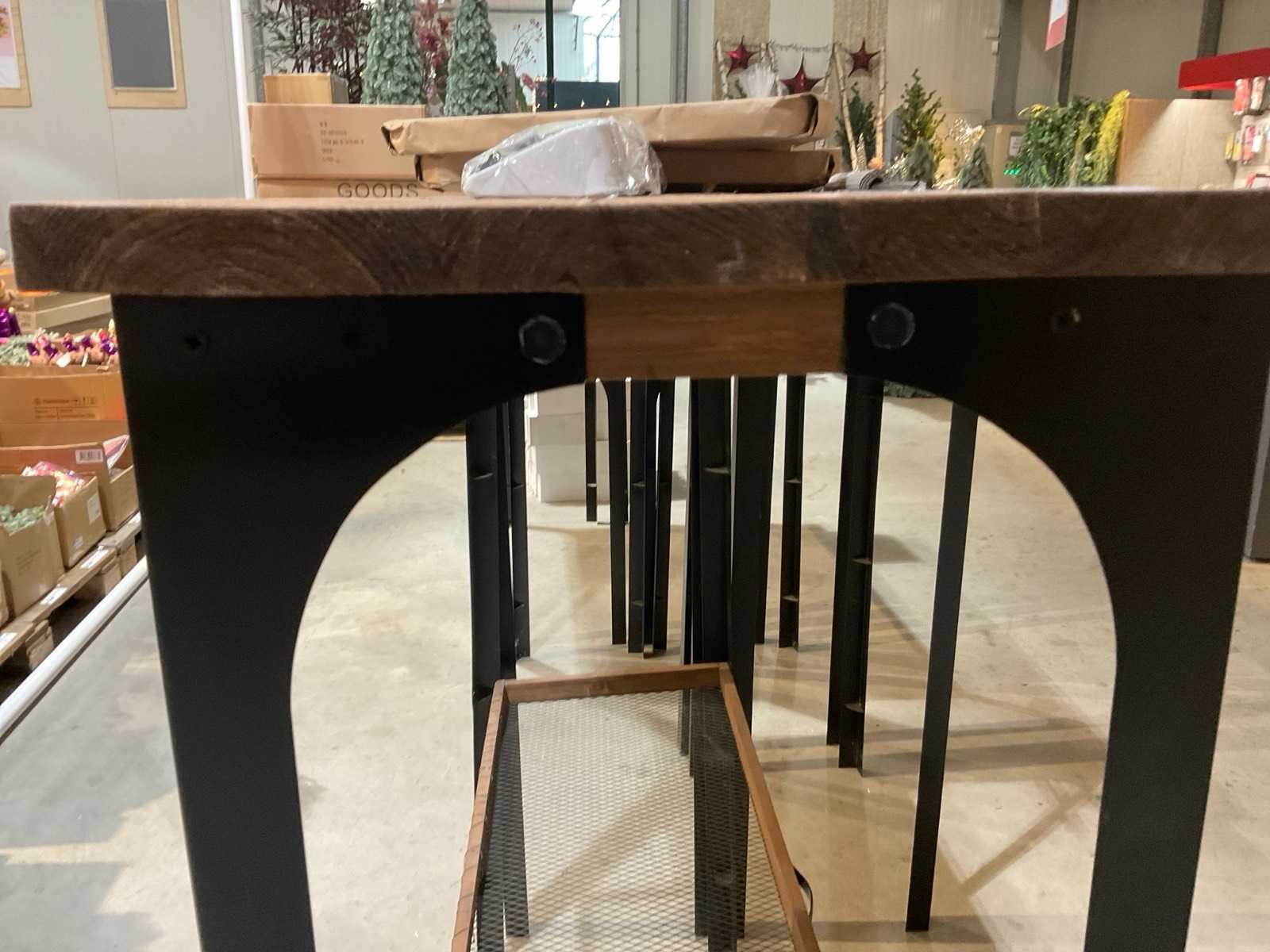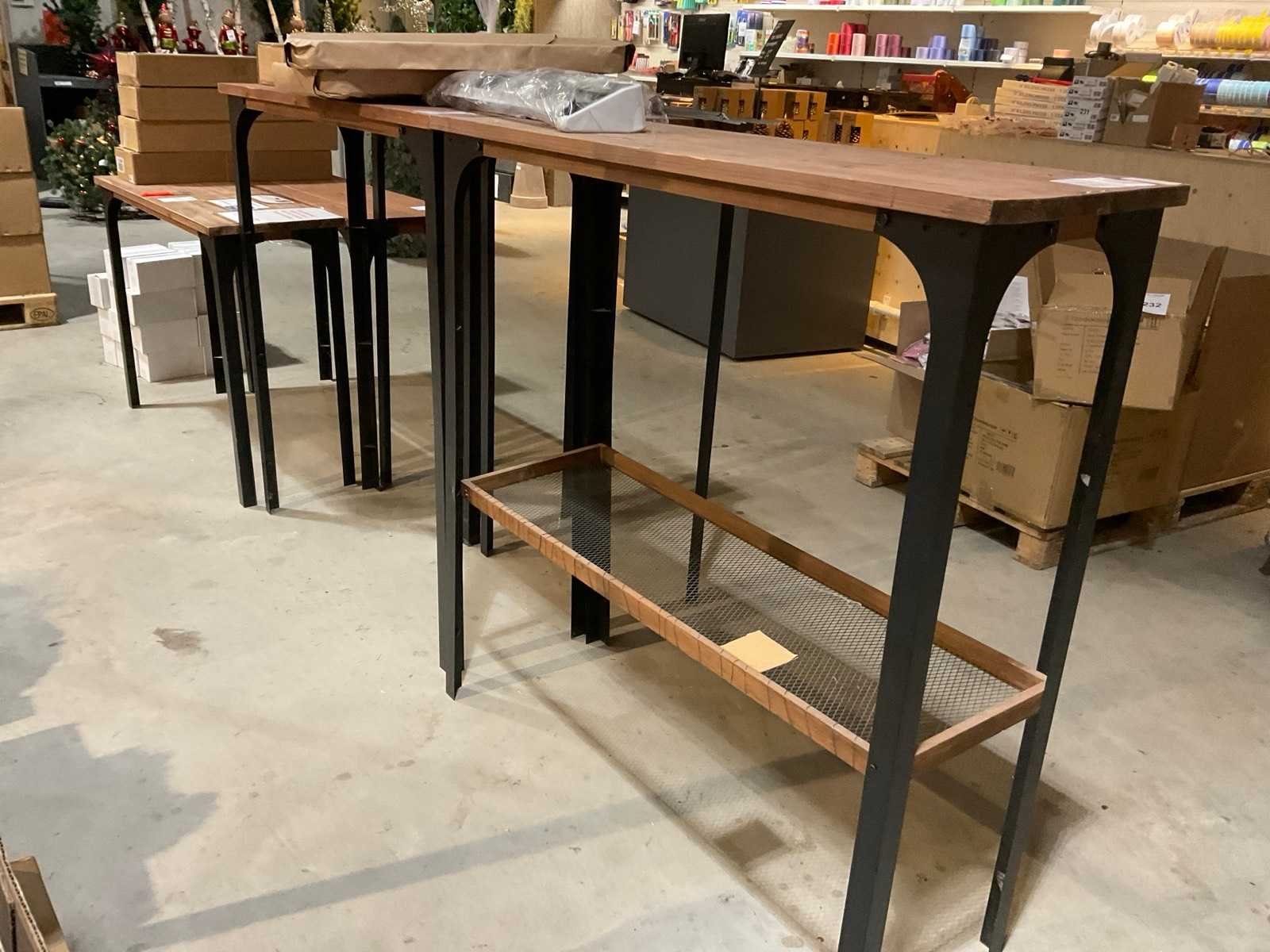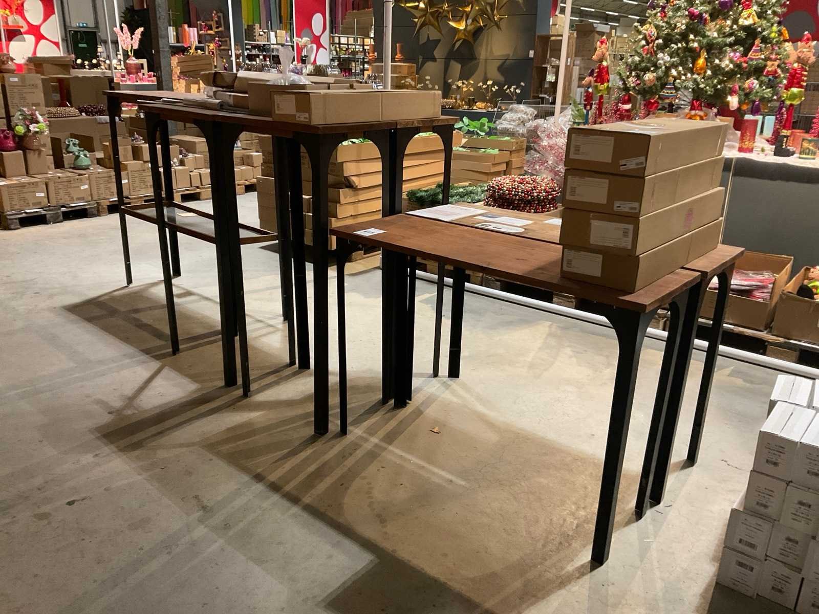 Bestaande uit 3 maten tafels, 2x ca. 120x40x86, 2x 60x40x123 en 2x 120x40x123 cm, inhoud/losse kavels niet inbegrepen.