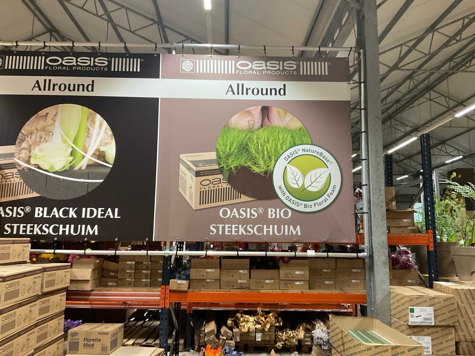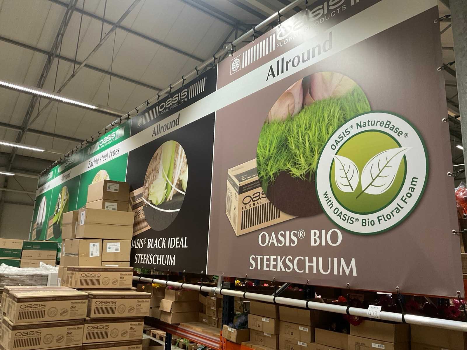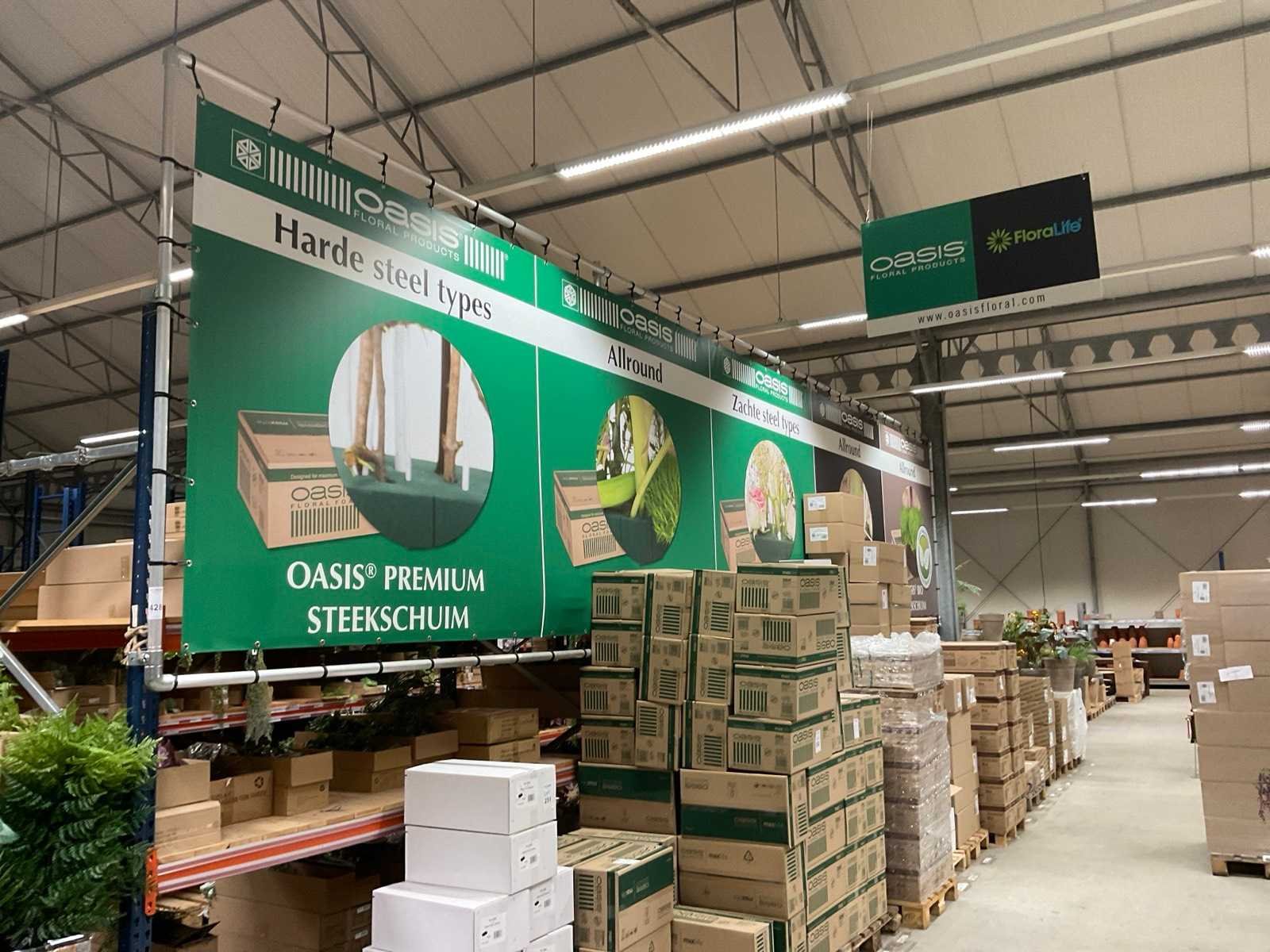 Banner ca. 10x2,5 meter, aluminium frame, hangt aan stelling, v.v. Oasis reclamedoek. Lengte: 10 Hoogte: 2.5