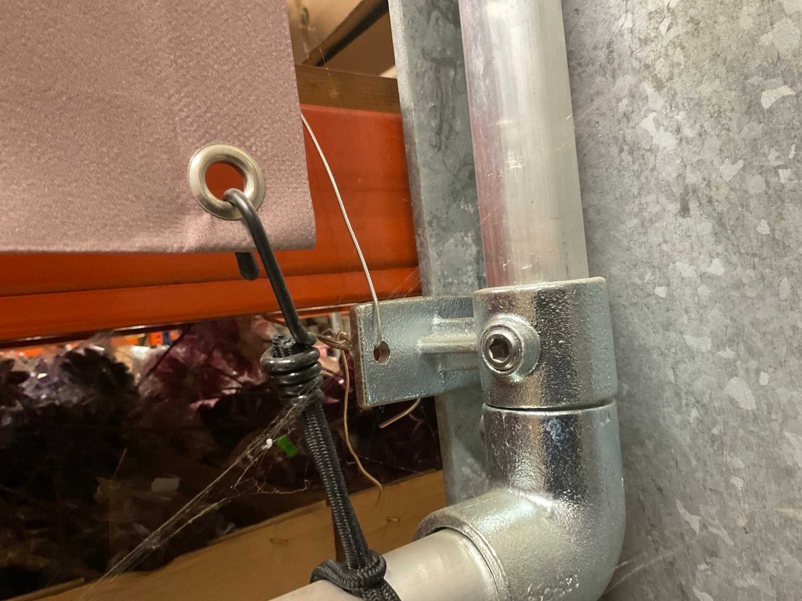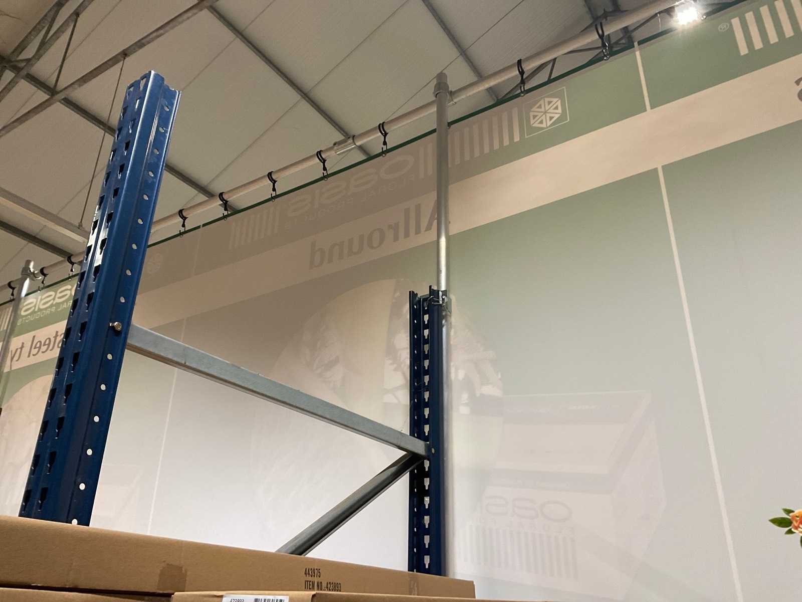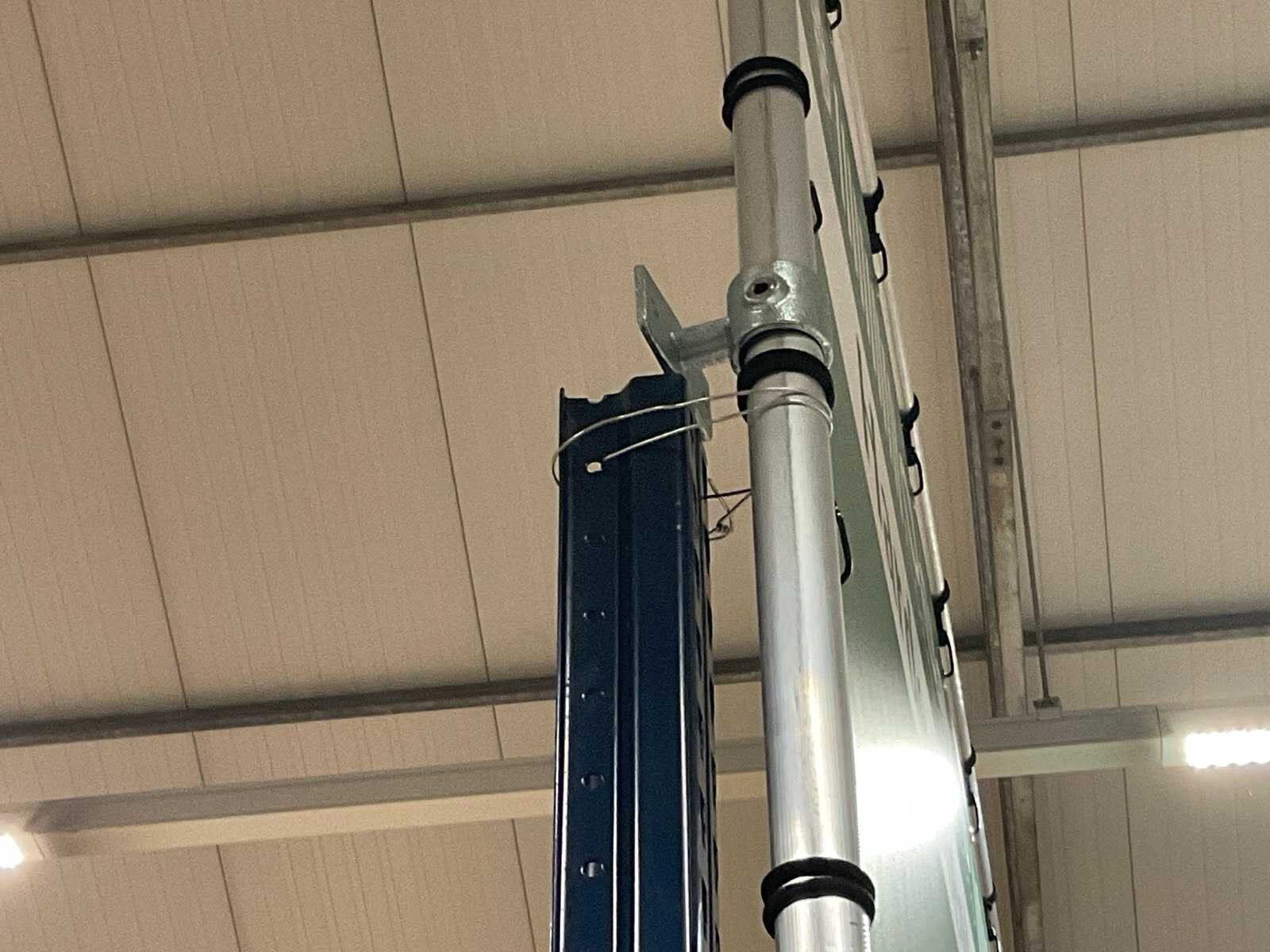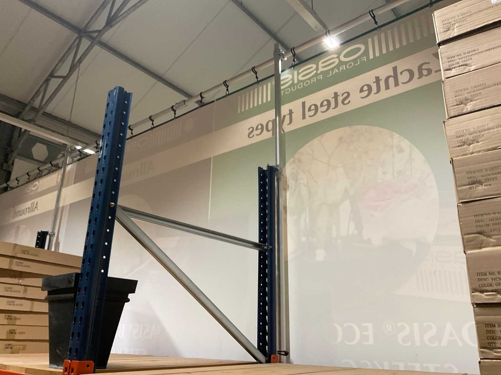 Banner ca. 10x2,5 meter, aluminium frame, hangt aan stelling, v.v. Oasis reclamedoek. Lengte: 10 Hoogte: 2.5