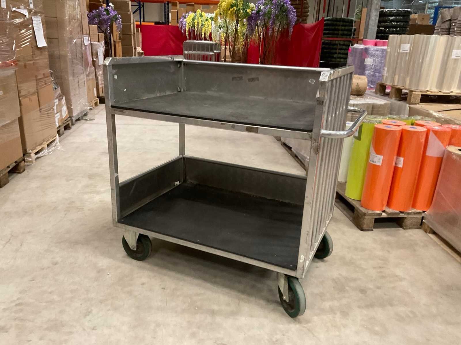 V.v. 2 plateaus, plateau afmeting ca. 105x74 cm, 2 zwenkwielen en 2 vaste wielen, aluminium Afmeting l: 113cm Afmeting b: 75cm Afmeting h: 120cm Totale afmeting L: 1240mm Totale afmeting Breedte: 750mm Totale afmeting Hoogte: 1200mm