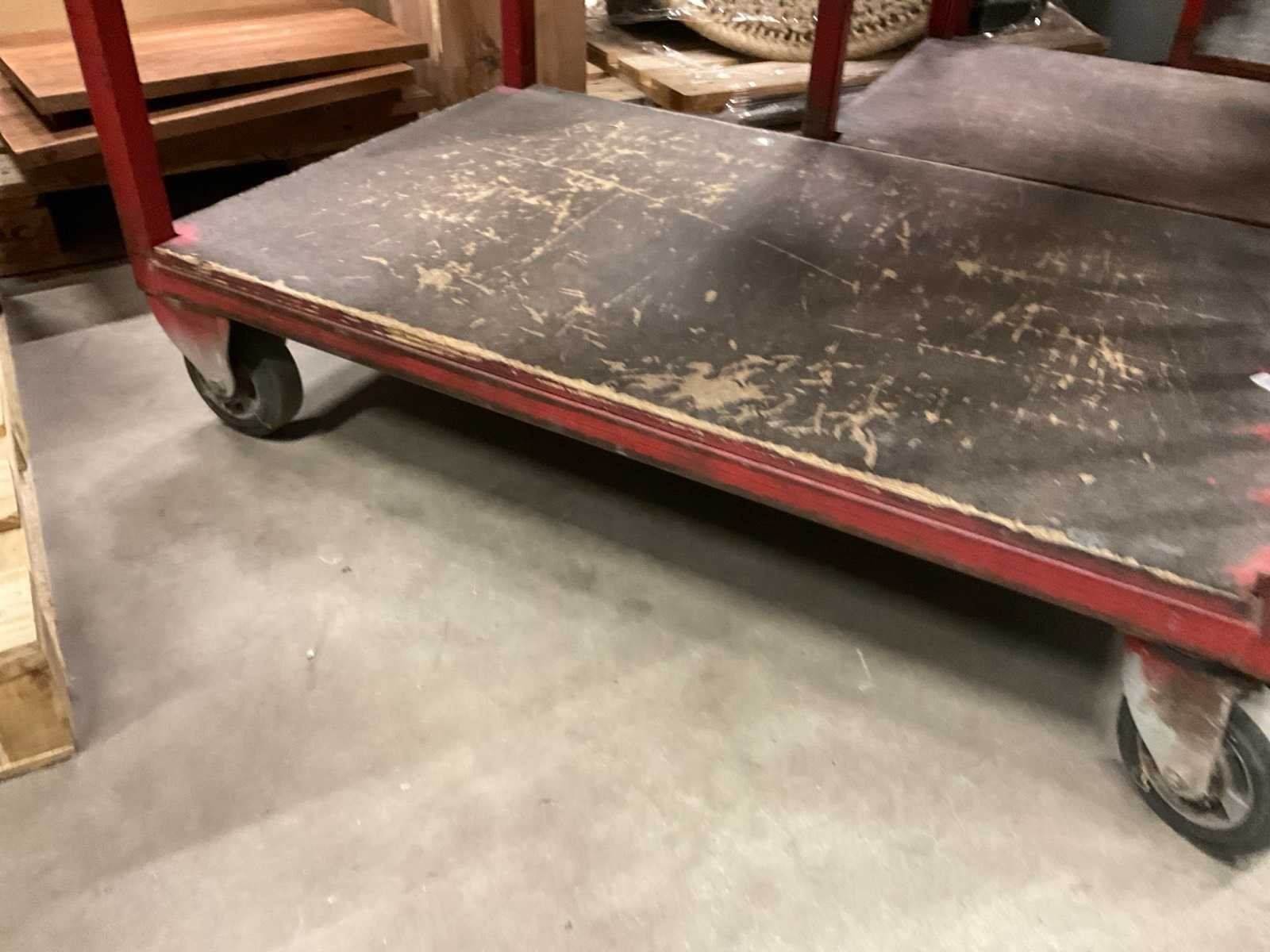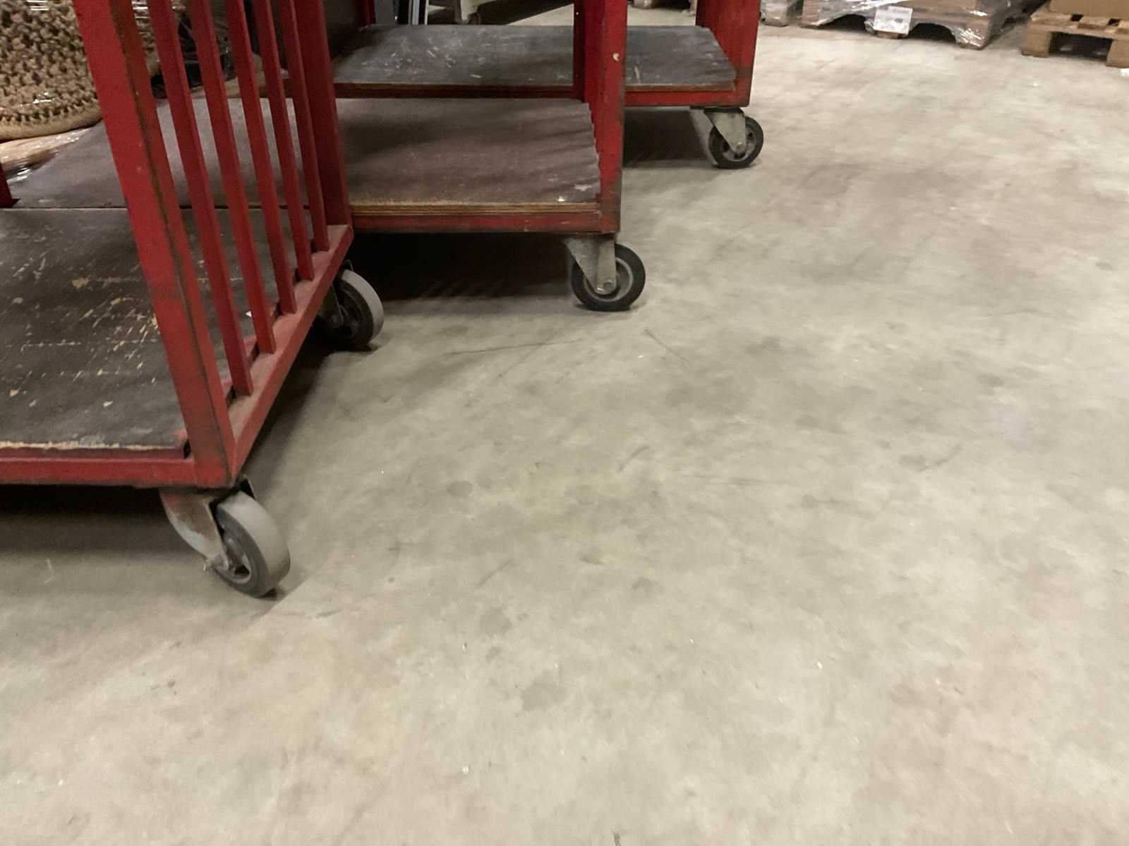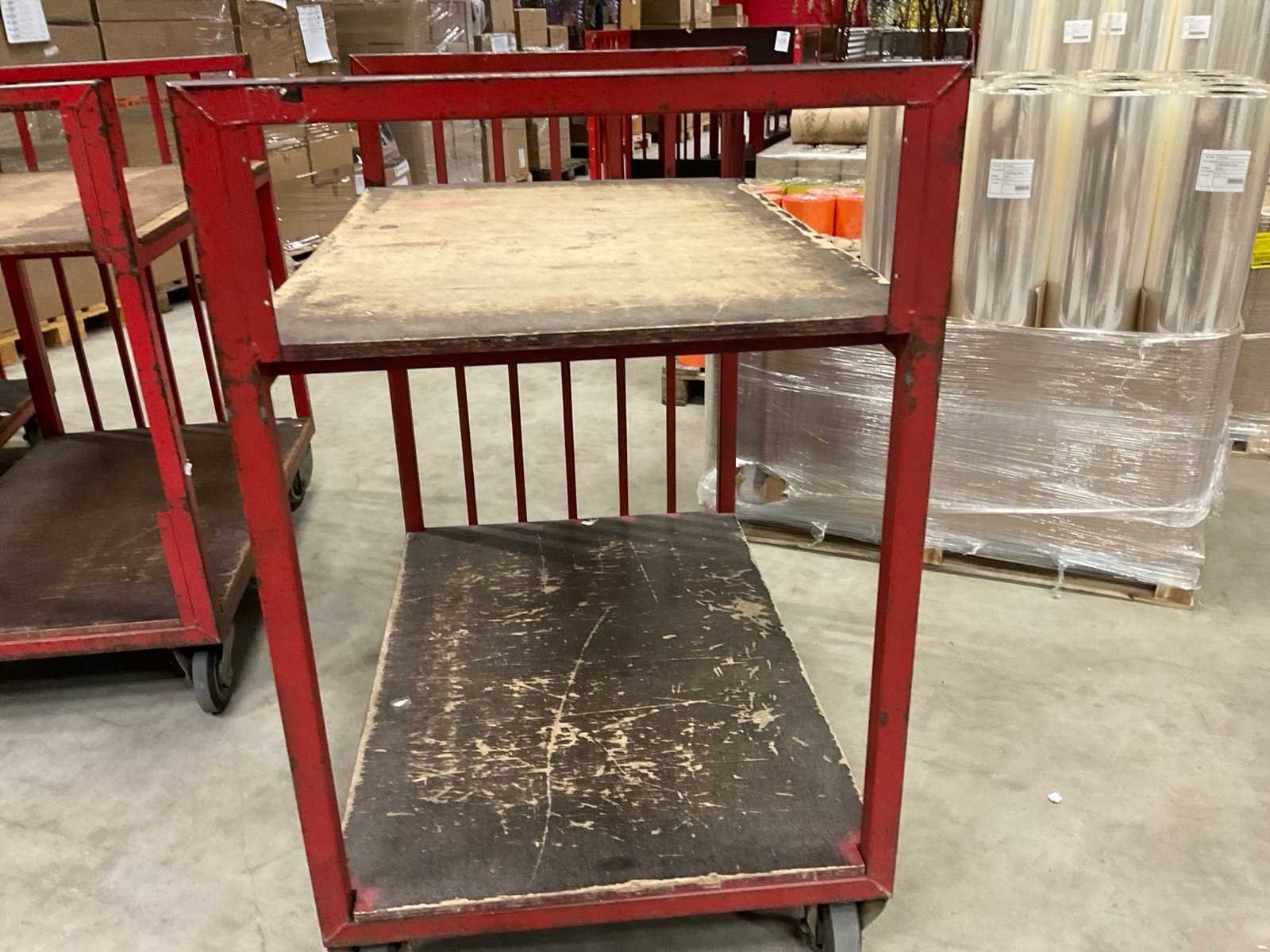 V.v. 2 plateaus, plateau afmeting ca. 115x74 cm, 2 zwenkwielen en 2 vaste wielen, metaal. Afmeting l: 120cm Afmeting b: 75cm Afmeting h: 124cm Totale afmeting L: 1330mm Totale afmeting Breedte: 750mm Totale afmeting Hoogte: 1240mm