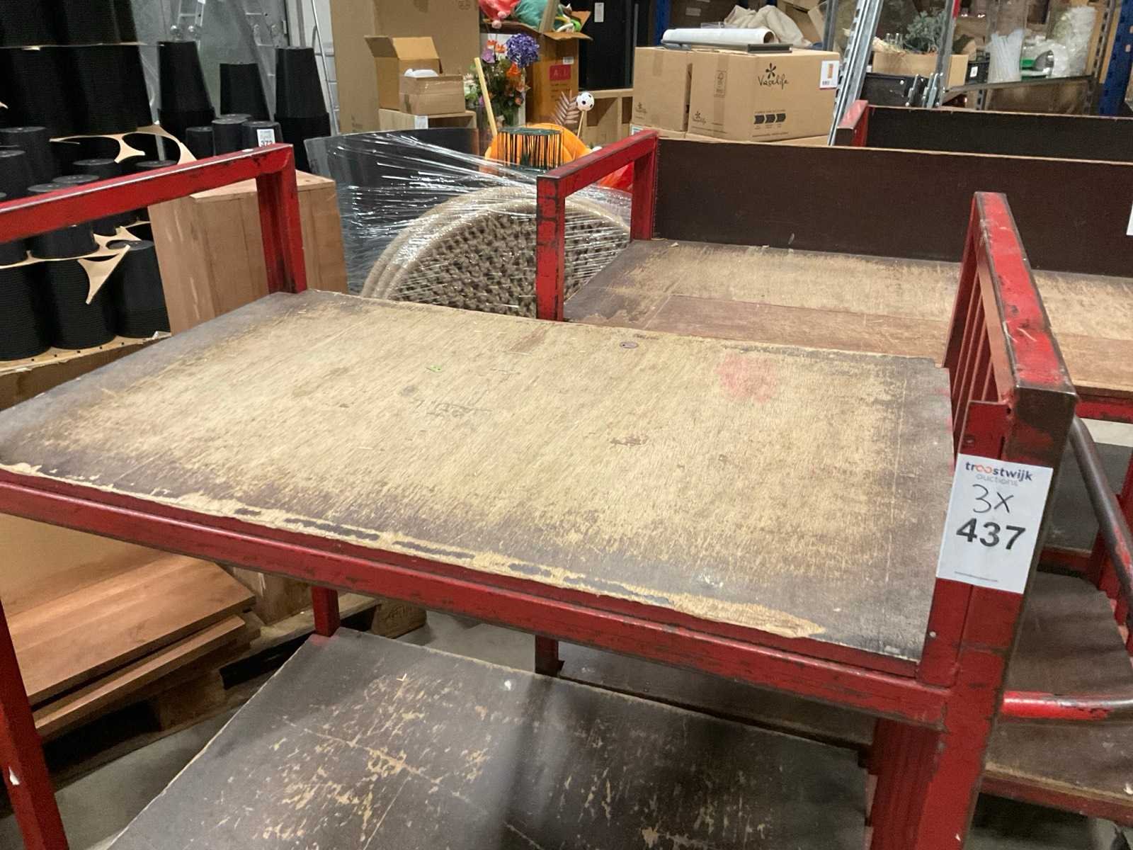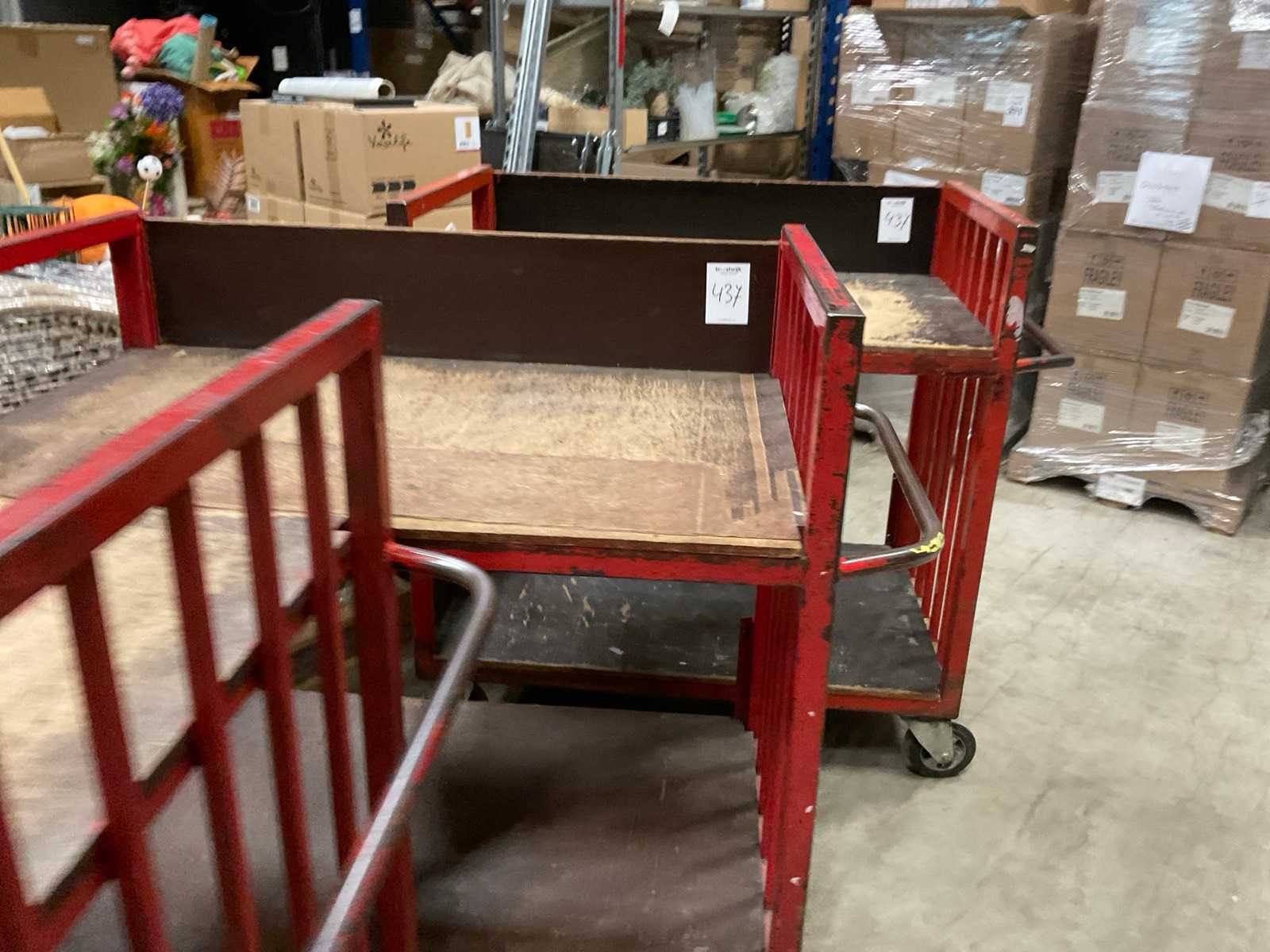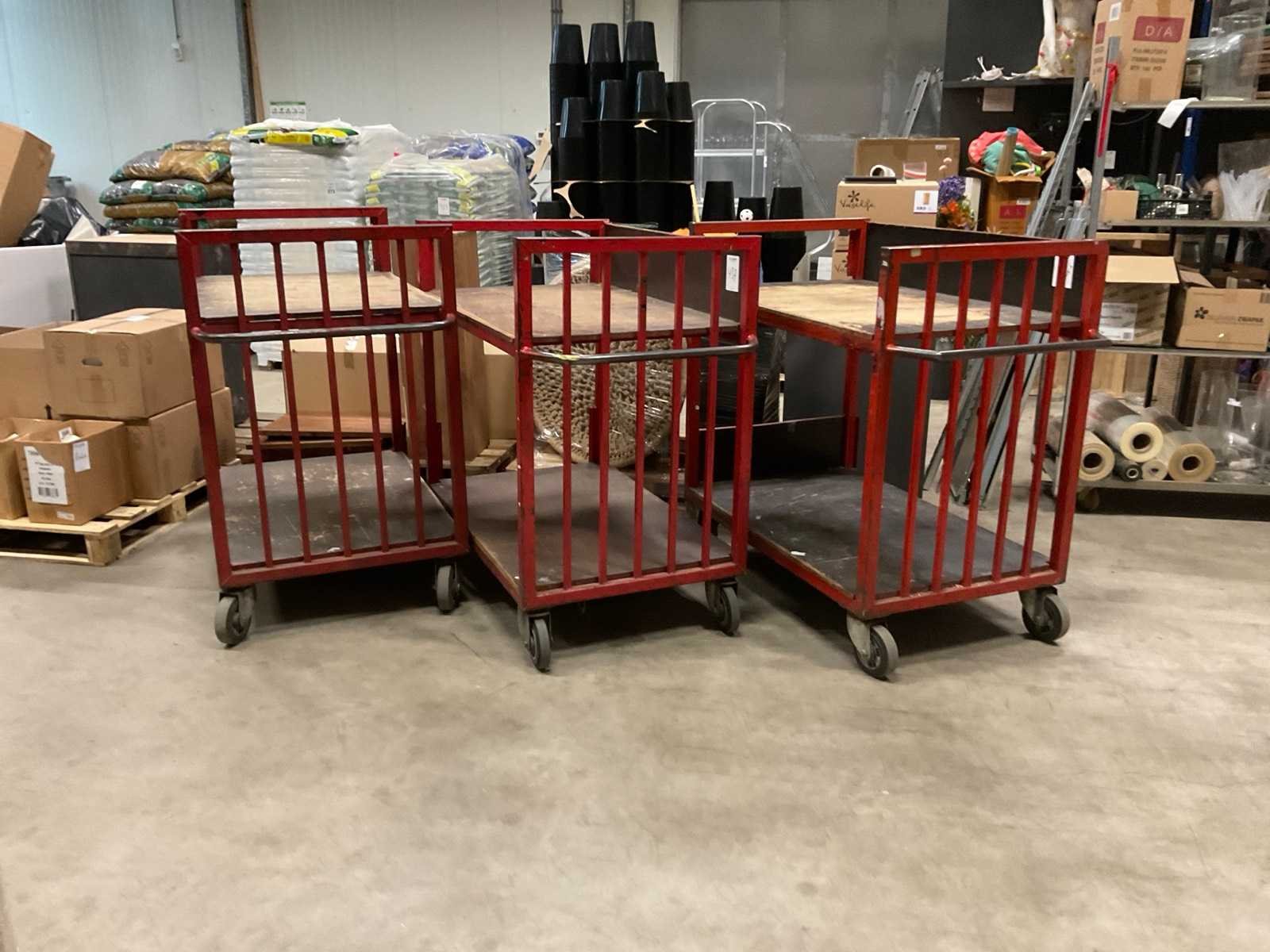 V.v. 2 plateaus, plateau afmeting ca. 115x74 cm, 2 zwenkwielen en 2 vaste wielen, metaal. Afmeting l: 120cm Afmeting b: 75cm Afmeting h: 124cm Totale afmeting L: 1330mm Totale afmeting Breedte: 750mm Totale afmeting Hoogte: 1240mm