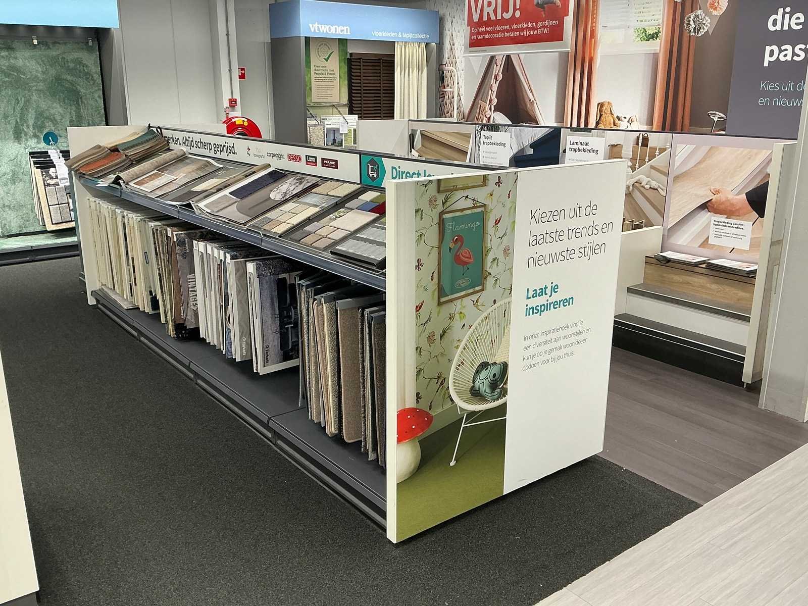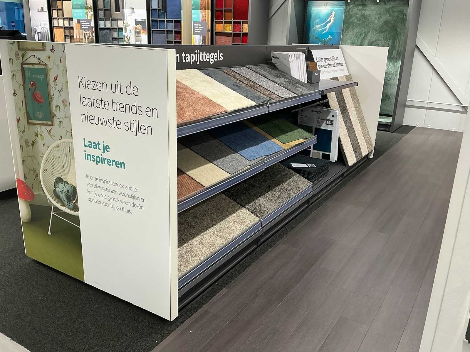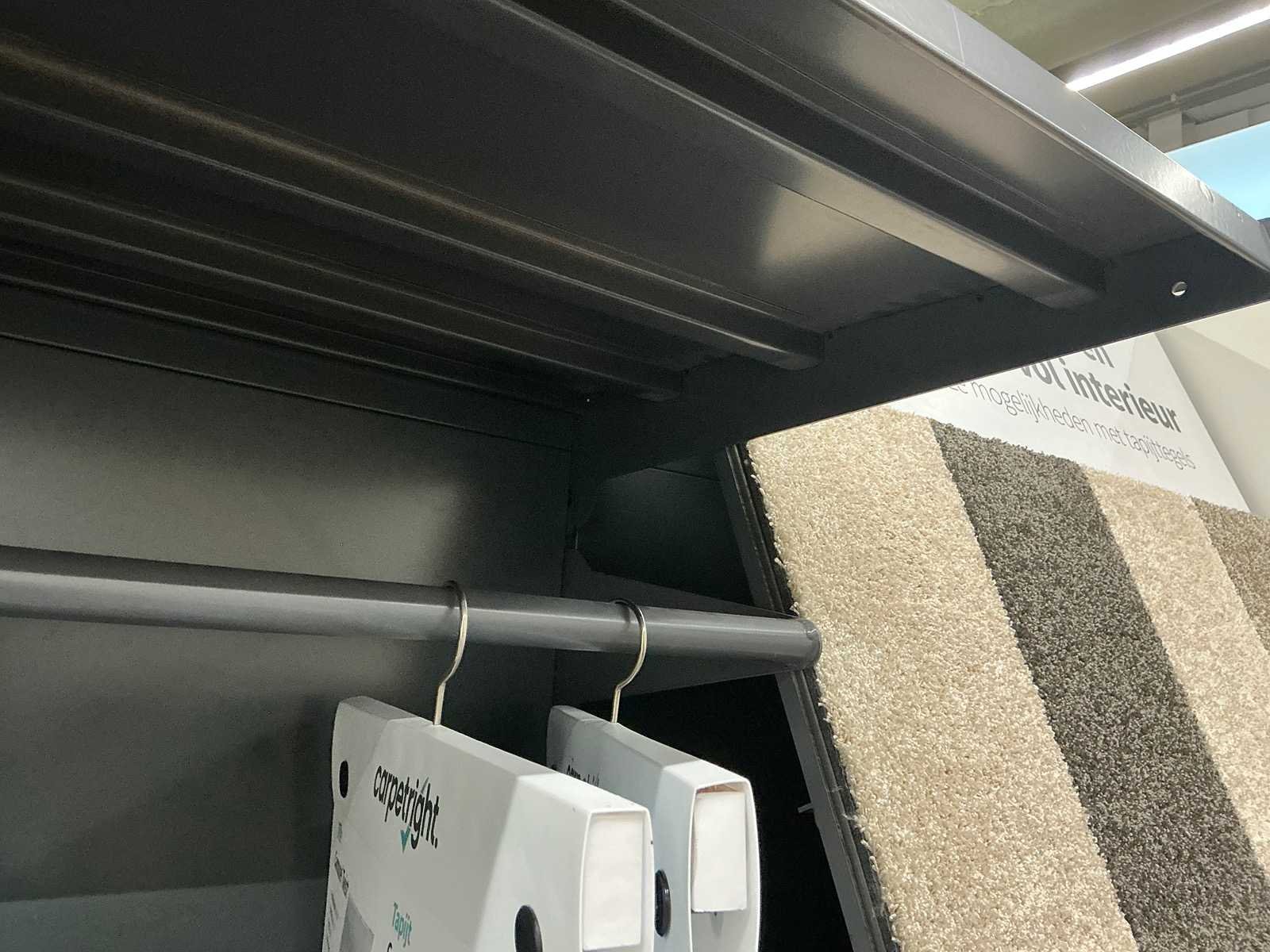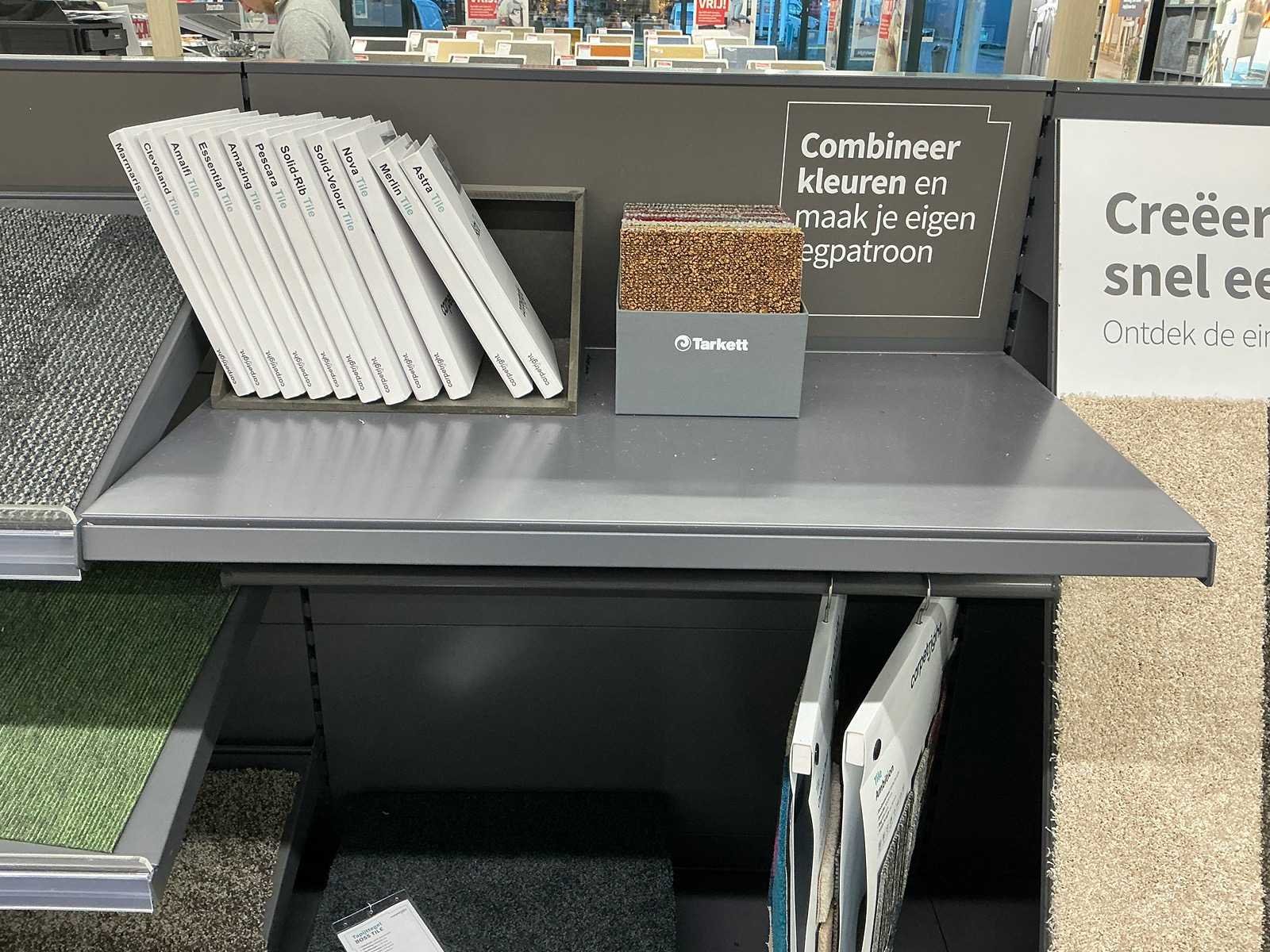 Exclusief stofsamples, boeken en beelscherm Inclusief inhoud. Totale afmeting L: 4100mm Totale afmeting Breedte: 1250mm Totale afmeting Hoogte: 1430mm