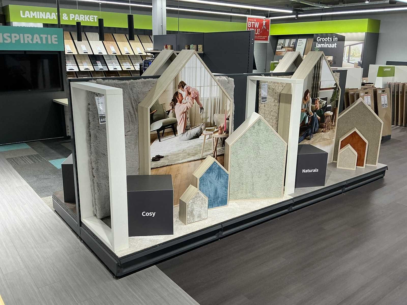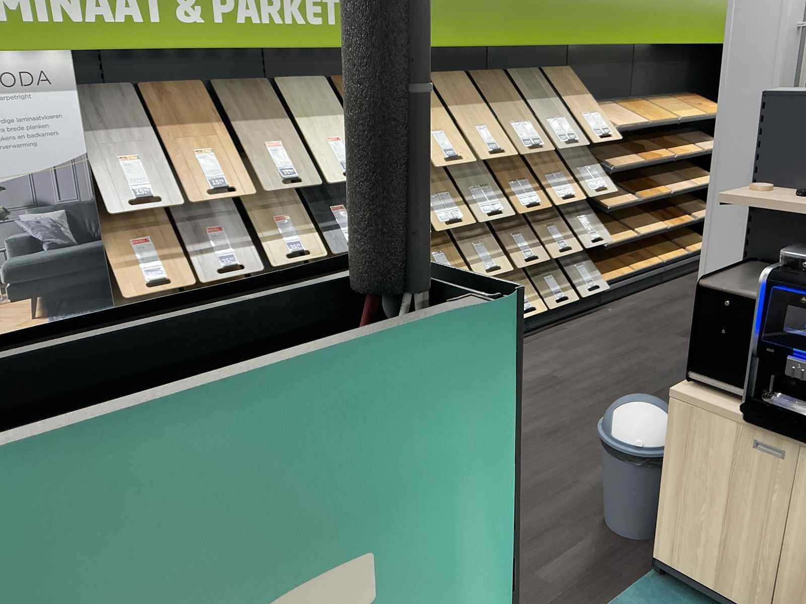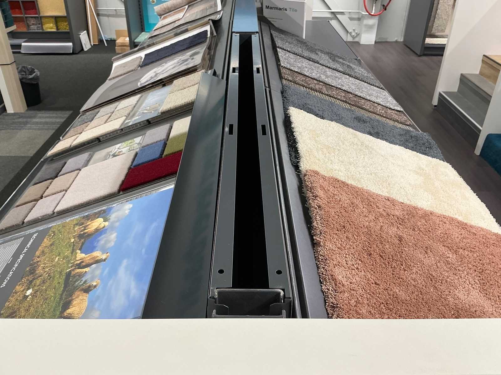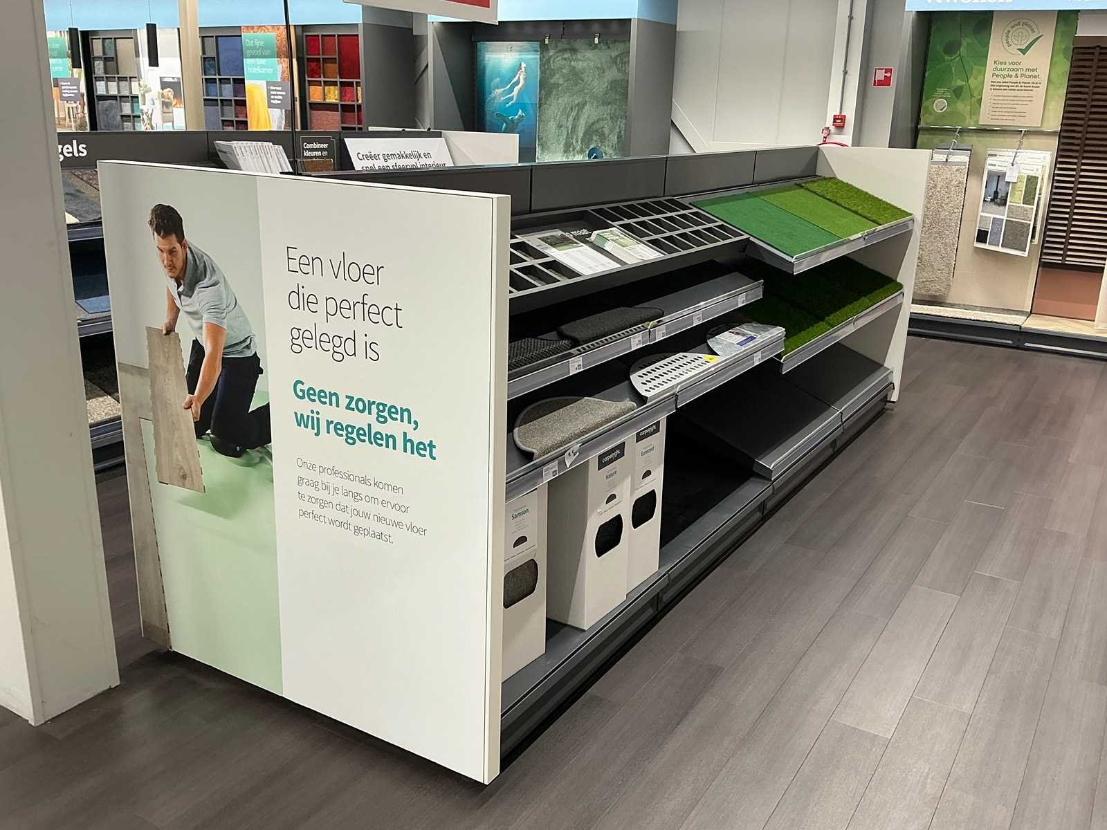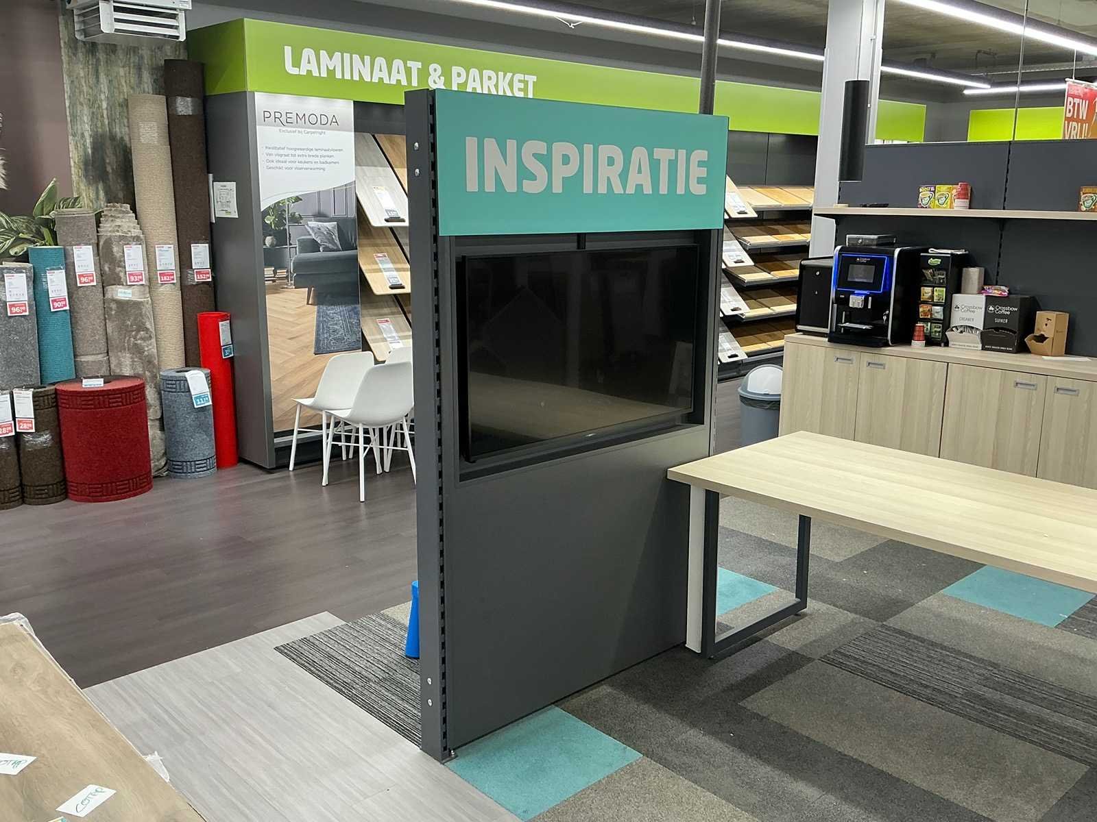 Exclusief stofsamples, boeken en beelscherm Inclusief inhoud. Totale afmeting L: 4100mm Totale afmeting Breedte: 1250mm Totale afmeting Hoogte: 1430mm