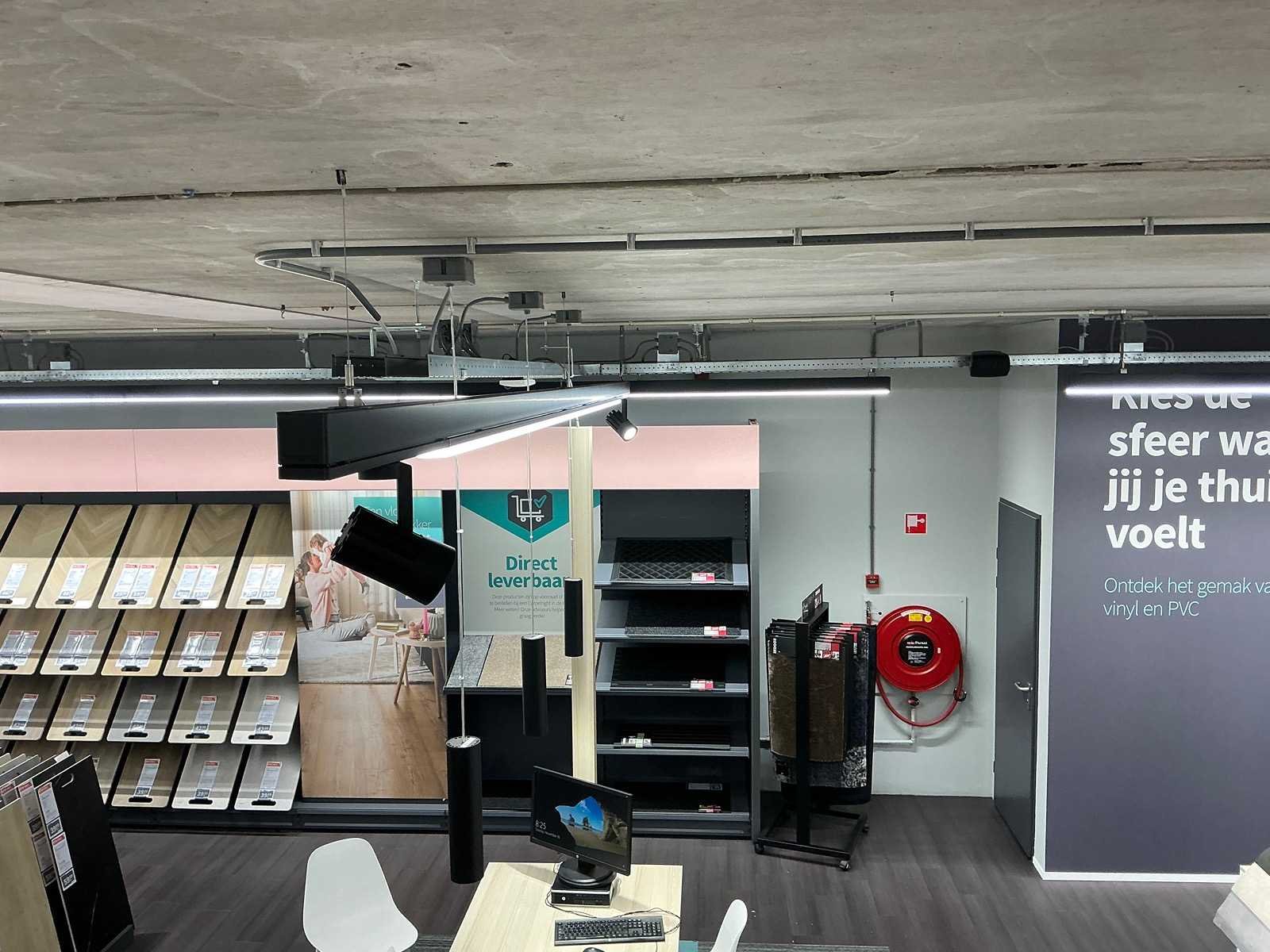 Dit kavel dient door de koper professioneel gedemonteerd te worden. Het kavel bestaat uit circa 250 meter rails met led balken en led spots. Kavel is gemonteerd op circa 5 meter hoog Zowel op de begande grond als de eerste verdieping hang verlichting
