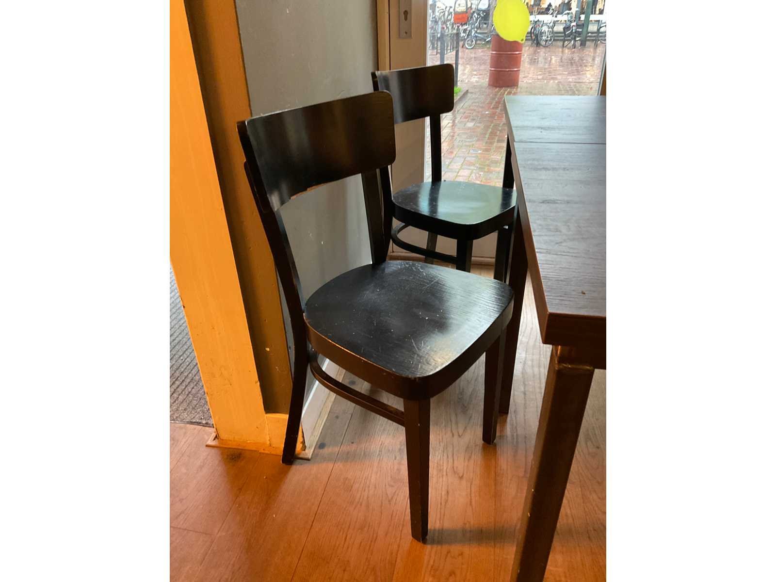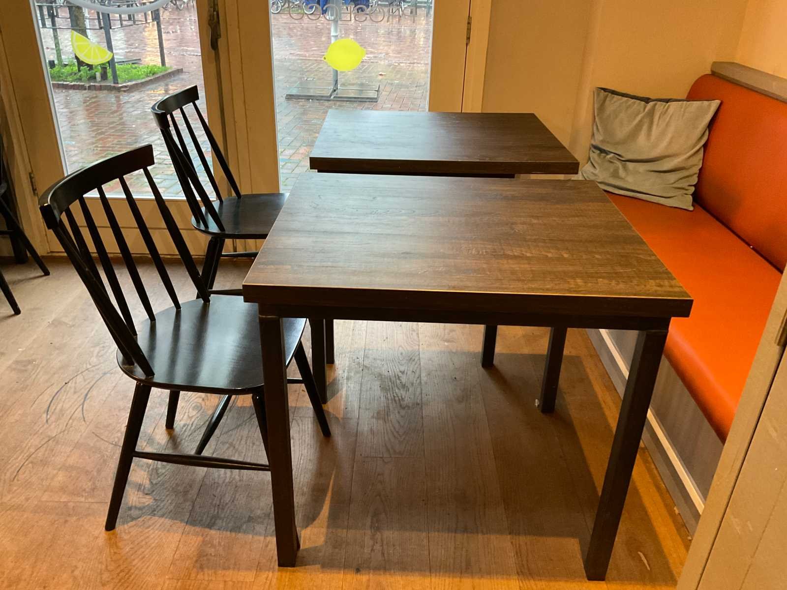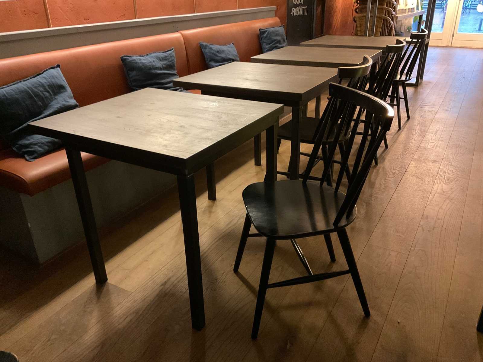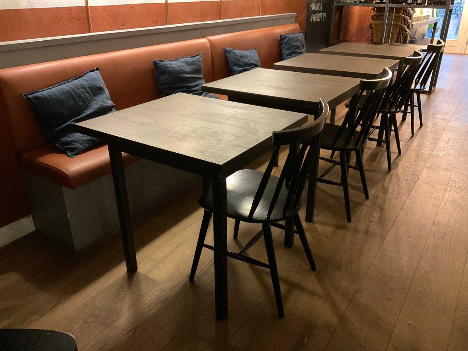 Bestaande uit 14 houten tafels afm ca. 70x80x74 cm 19 houten stoelen in 2 verschillende modellen 3 stuks Wandgemonteerde bank voorzien van kunstlederen bekleding afm ca. 351x62x101 cm, 361x62x101 cm en 187x60x101 cm, zithoogte ca. 46 cm Kussens