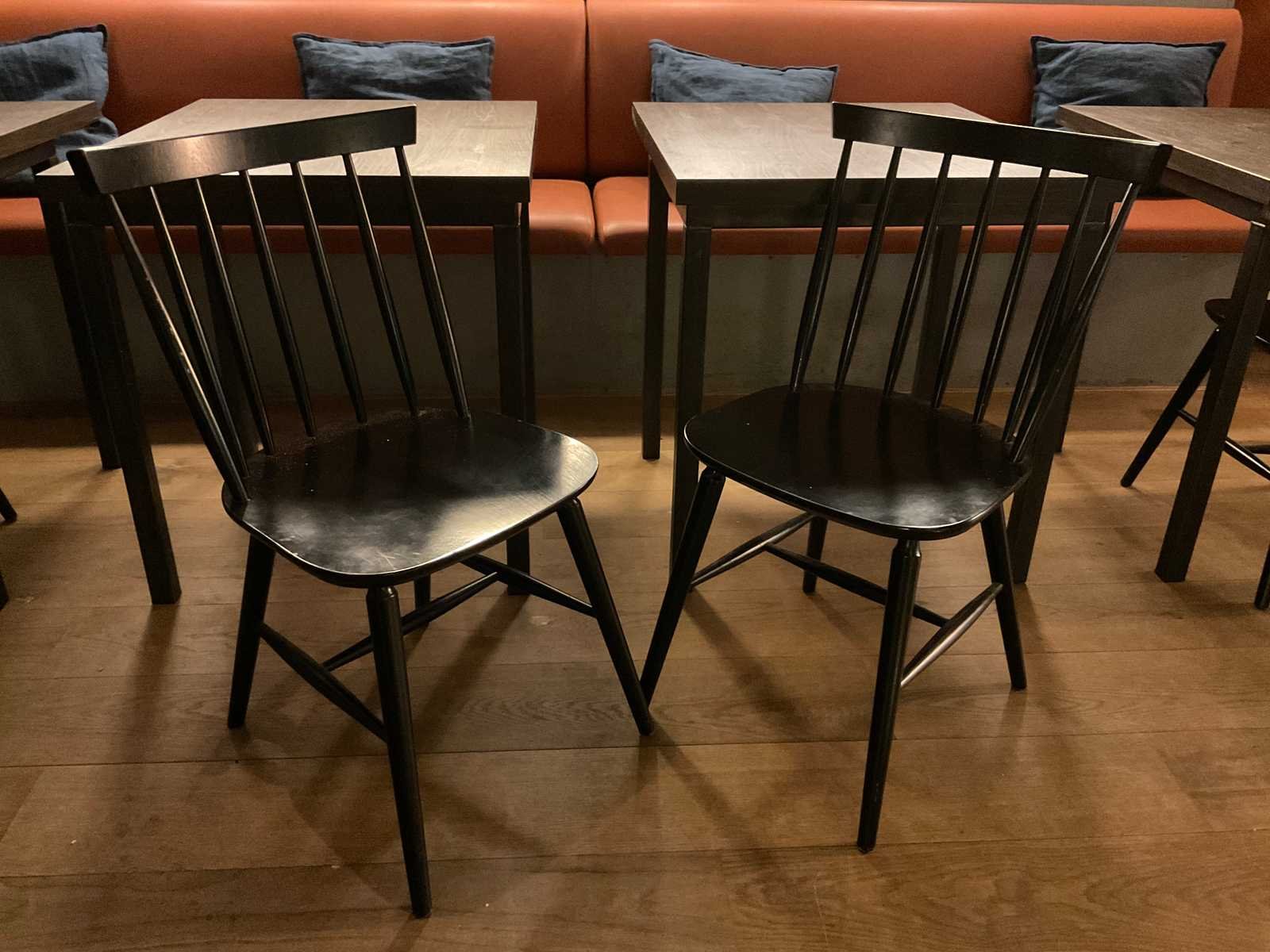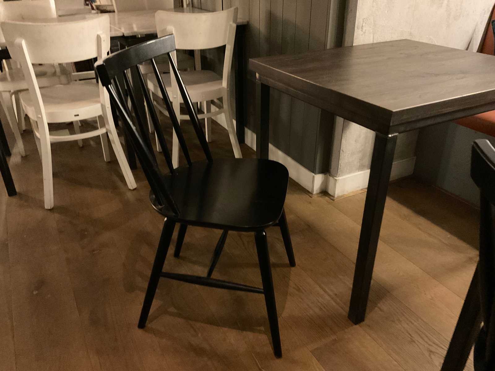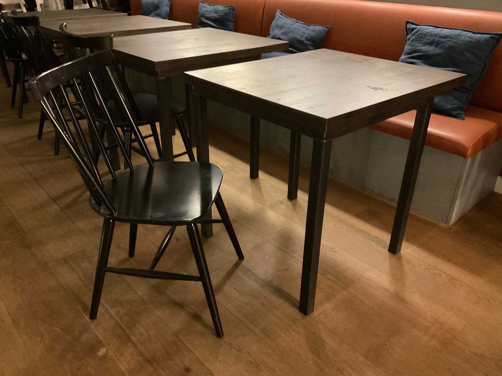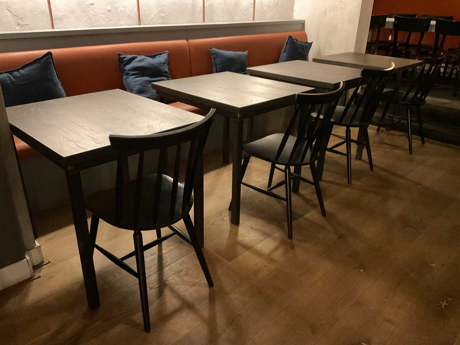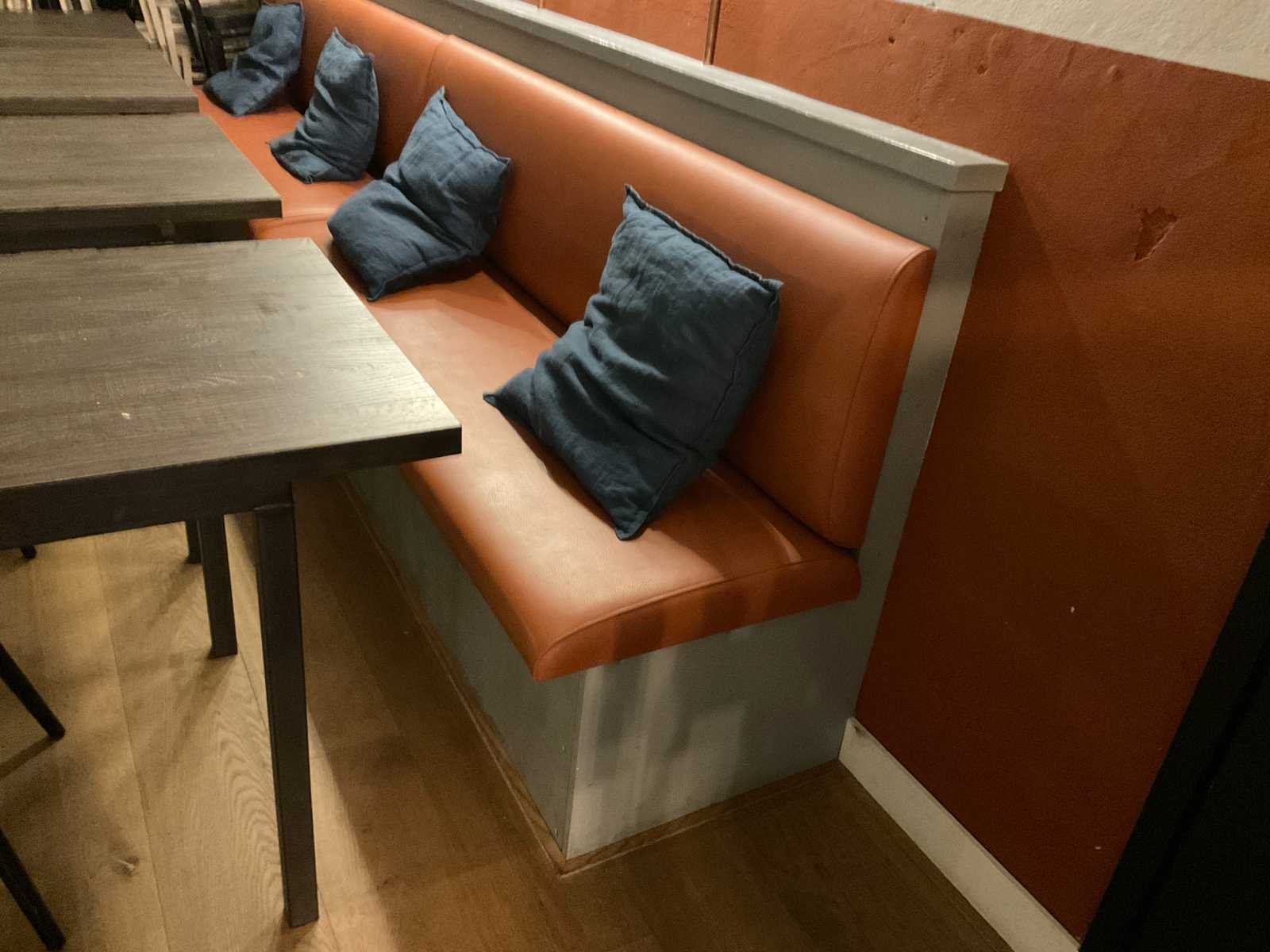 Bestaande uit 14 houten tafels afm ca. 70x80x74 cm 19 houten stoelen in 2 verschillende modellen 3 stuks Wandgemonteerde bank voorzien van kunstlederen bekleding afm ca. 351x62x101 cm, 361x62x101 cm en 187x60x101 cm, zithoogte ca. 46 cm Kussens
