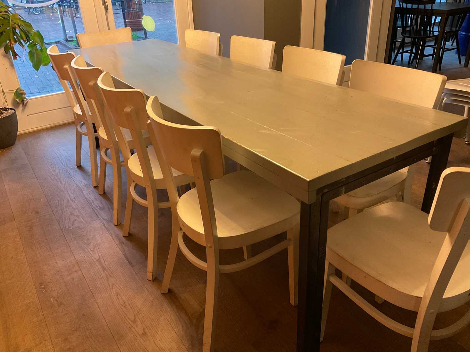 Bestaande uut tafel op metalen onderstel en 10 stoelen Merk: Ton Hout: true Metaal: true Totale afmeting L: 250cm Totale afmeting Breedte: 70cm Totale afmeting Hoogte: 76cm