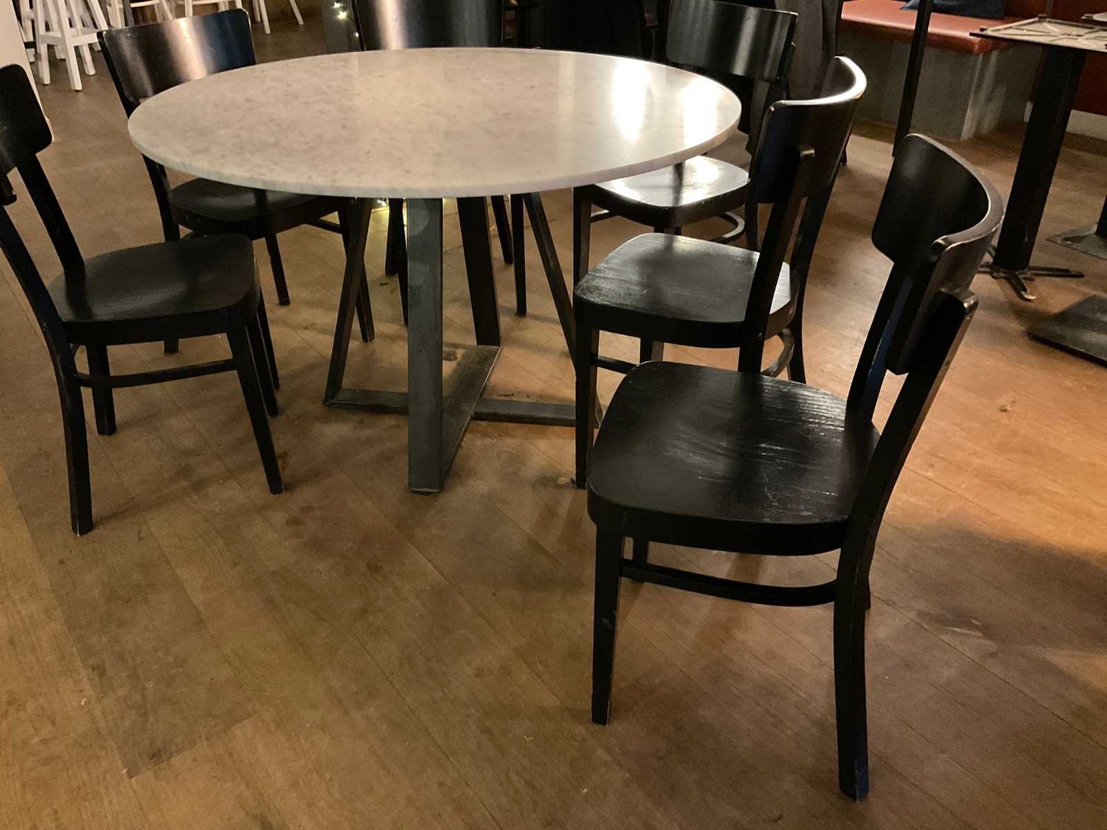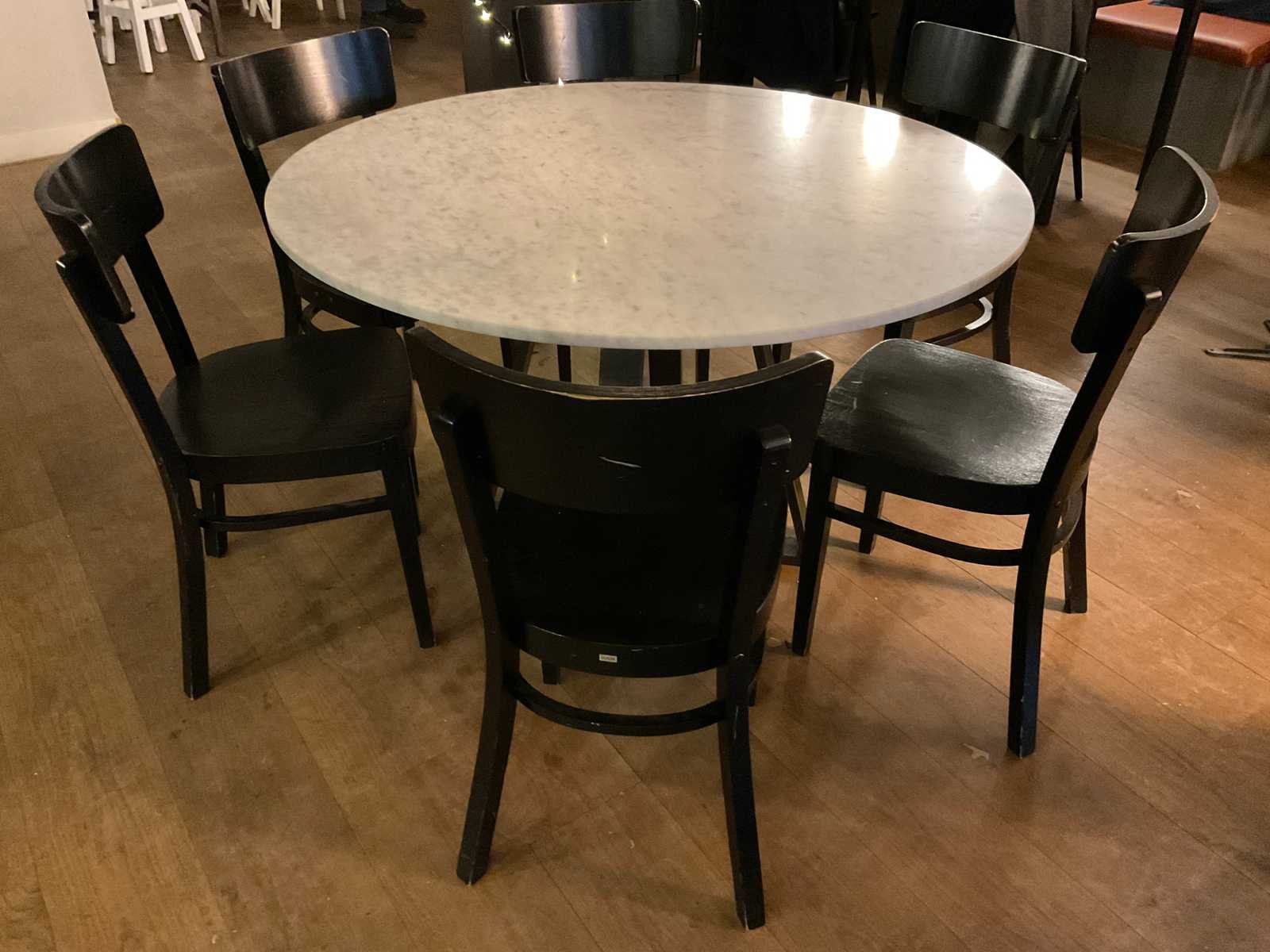 Natuurstenen tafelblad op stalen onderstel met 6 houten stoelen Merk: Ton Vorm: Rond Lengte: 120cm Hoogte: 75cm