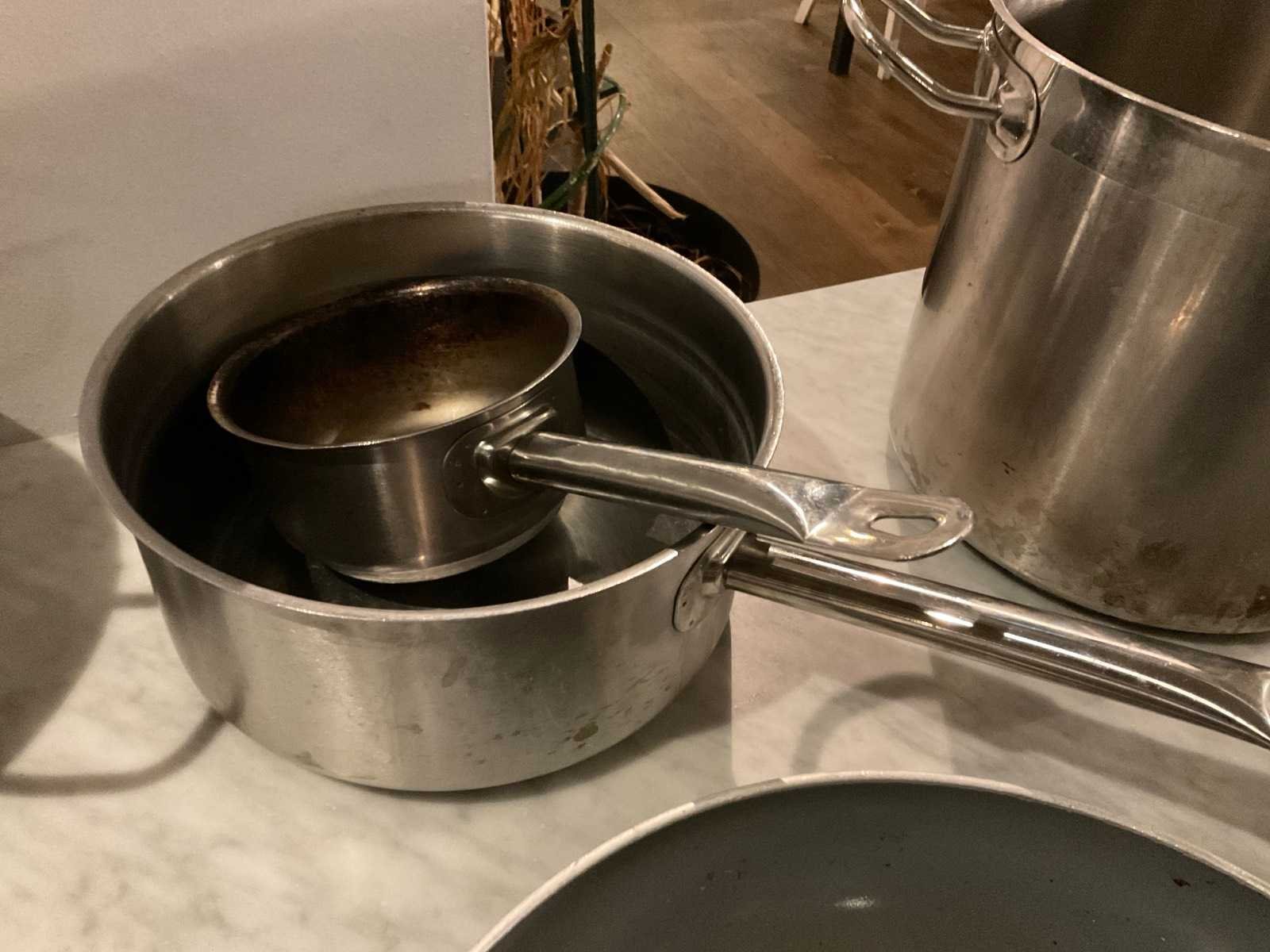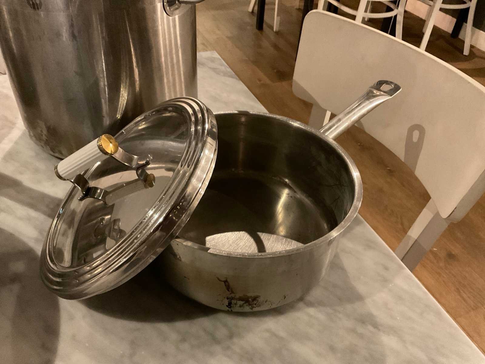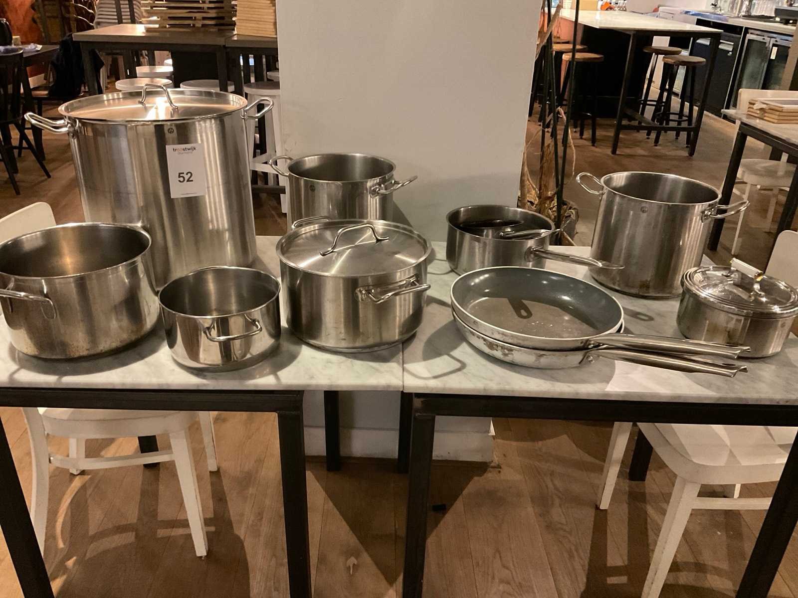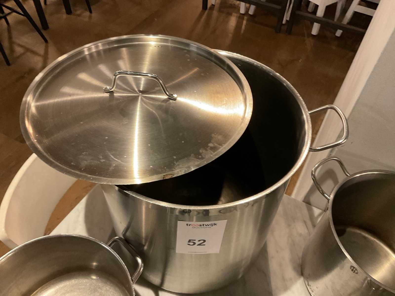 Diverse kookpannen en steelpannen waarvan grootste ø 38 cm hoogte 37 cm