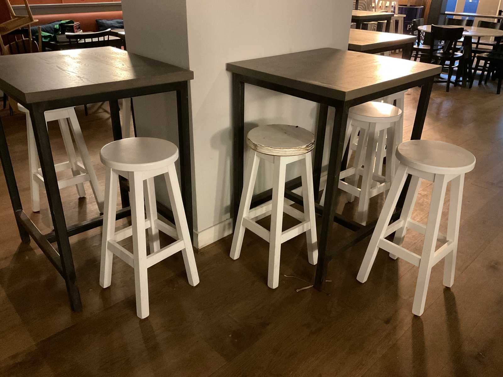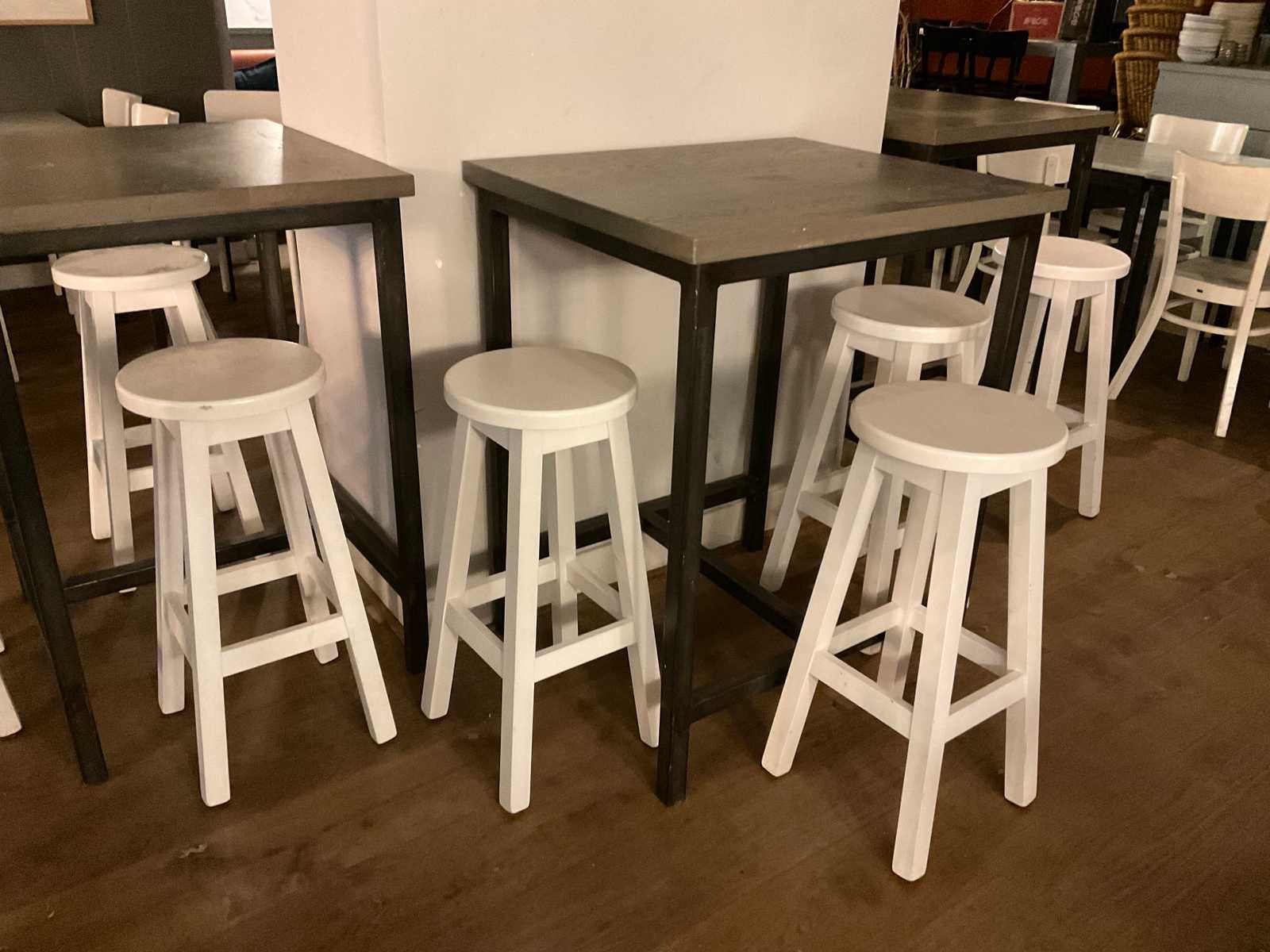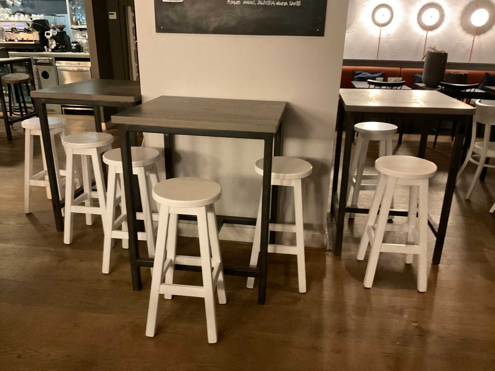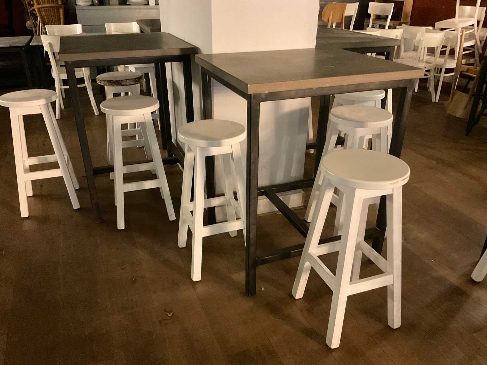 Bestaande uit 6 statafels en 15 barkrukken afm ca. Ø 33 cm, hoogte ca. 73 cm Totale afmeting L: 80cm Totale afmeting Breedte: 70cm Totale afmeting Hoogte: 101cm Hout: true Metaal: true
