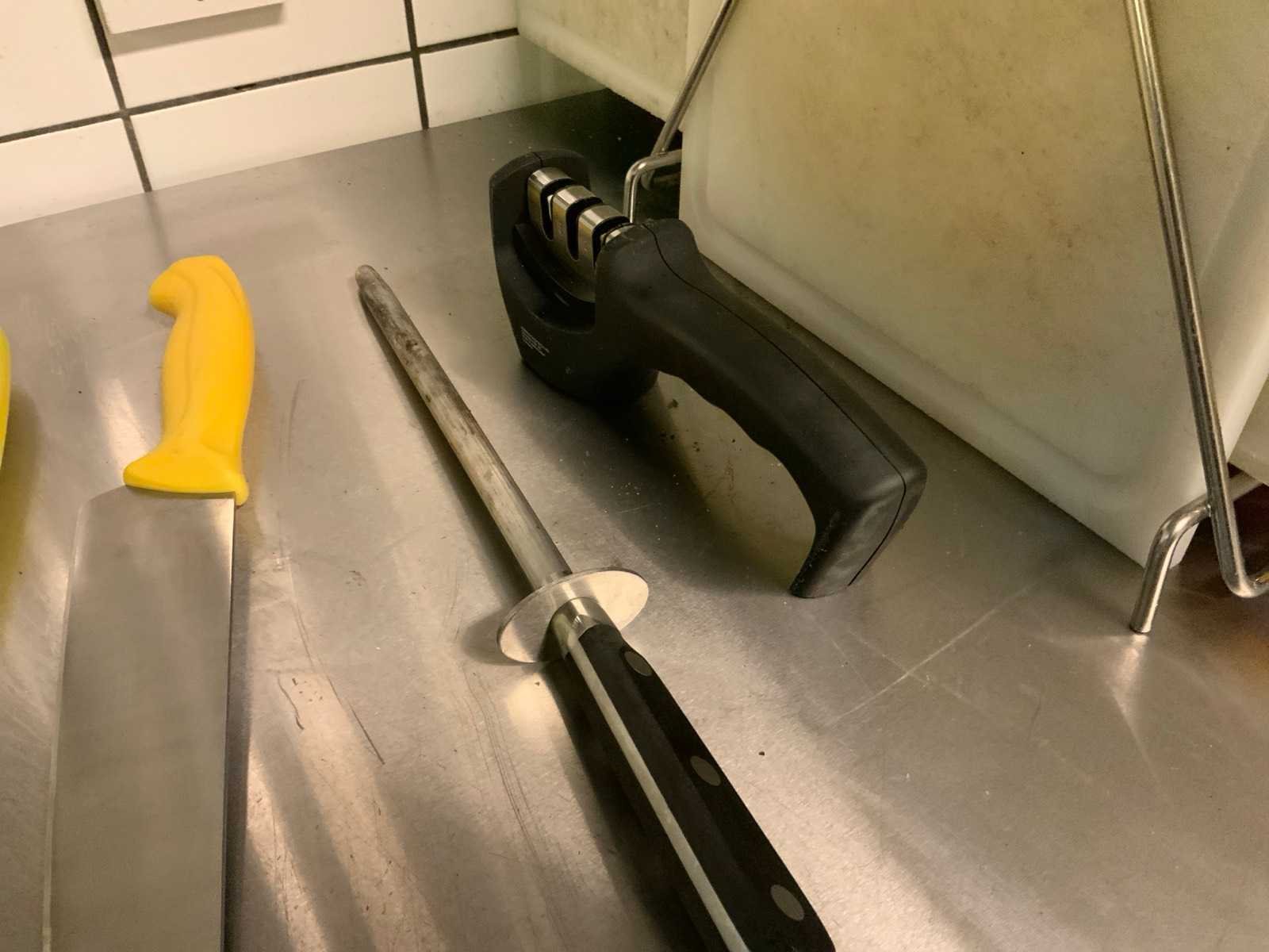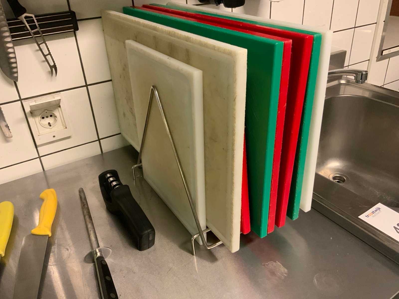 Partij diverse messen, magnetische wandhouder en snijplanken in rek Merk: Hendi, Giesser