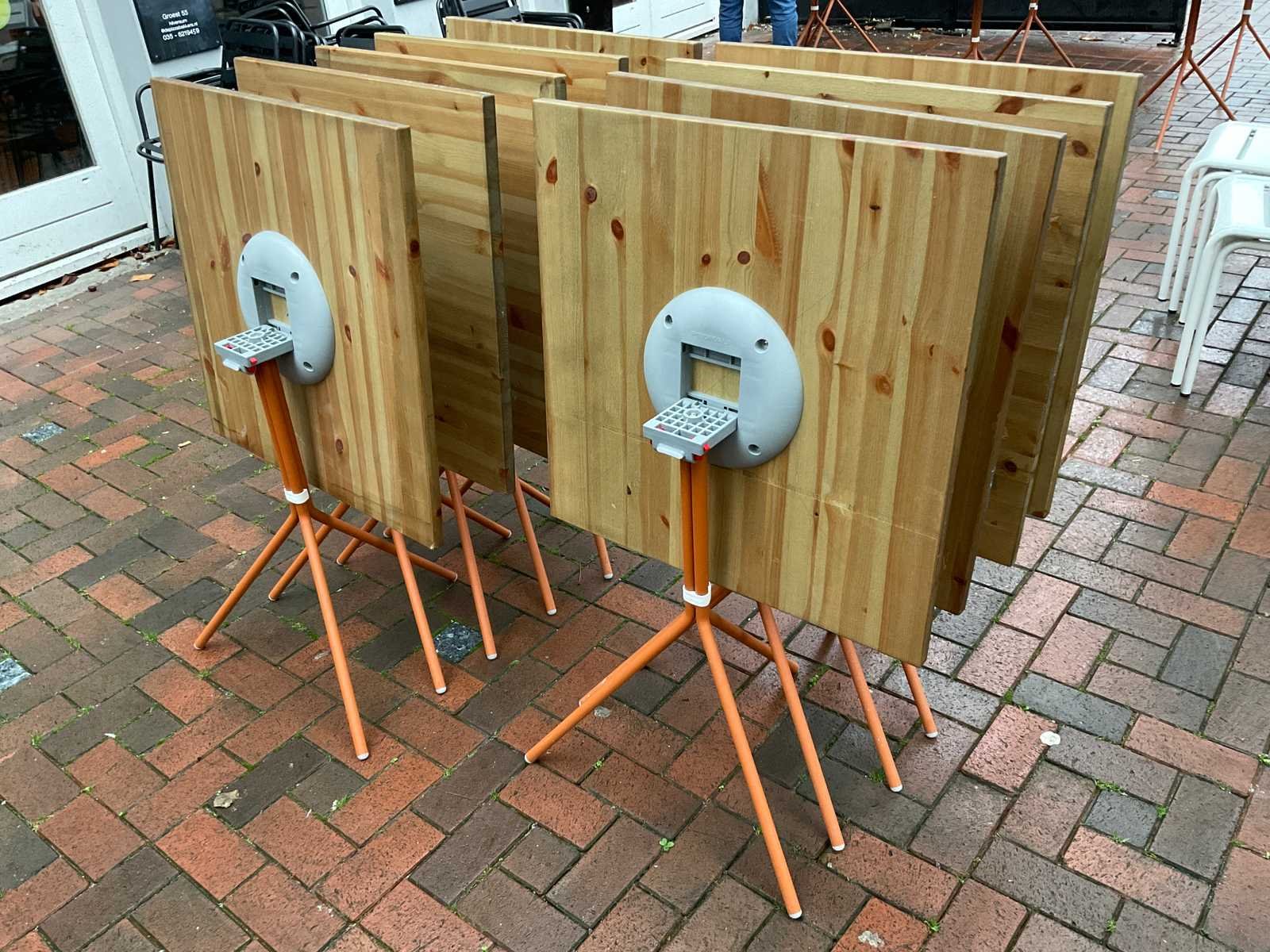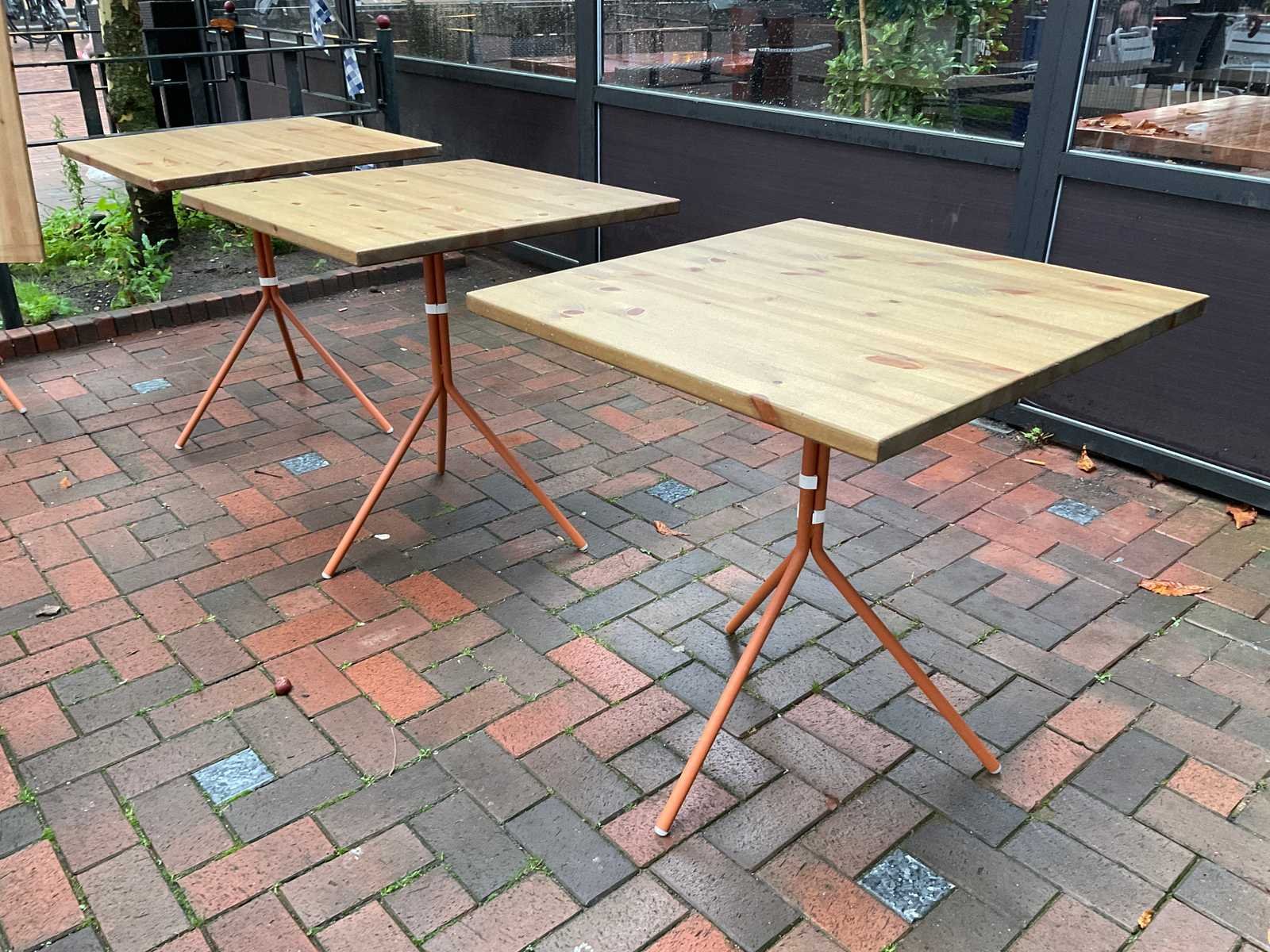 Opklapbare terrastafel op driepoot onderstel Merk: Pedrali Lengte: 70cm Breedte: 70cm Hoogte: 75cm