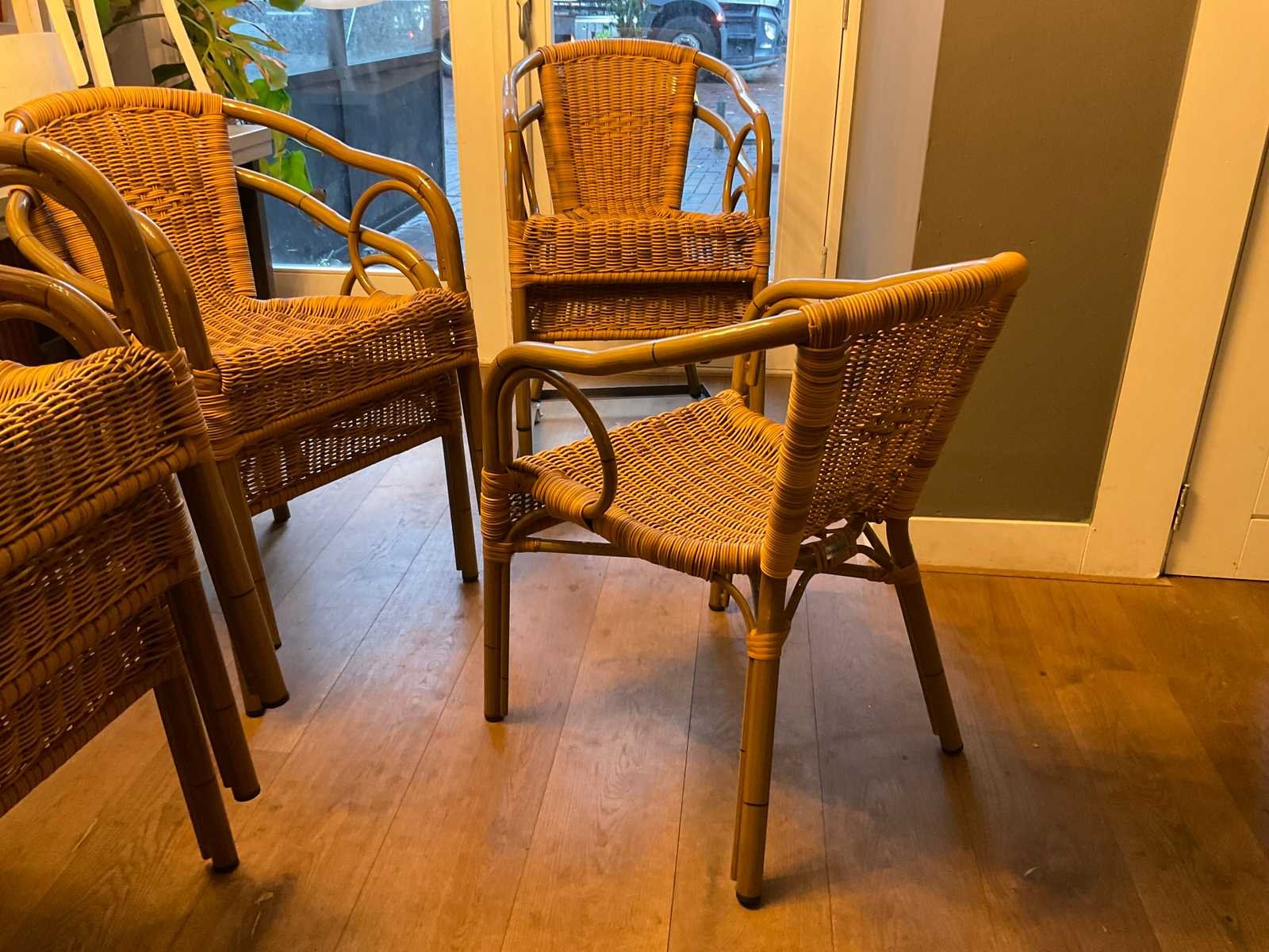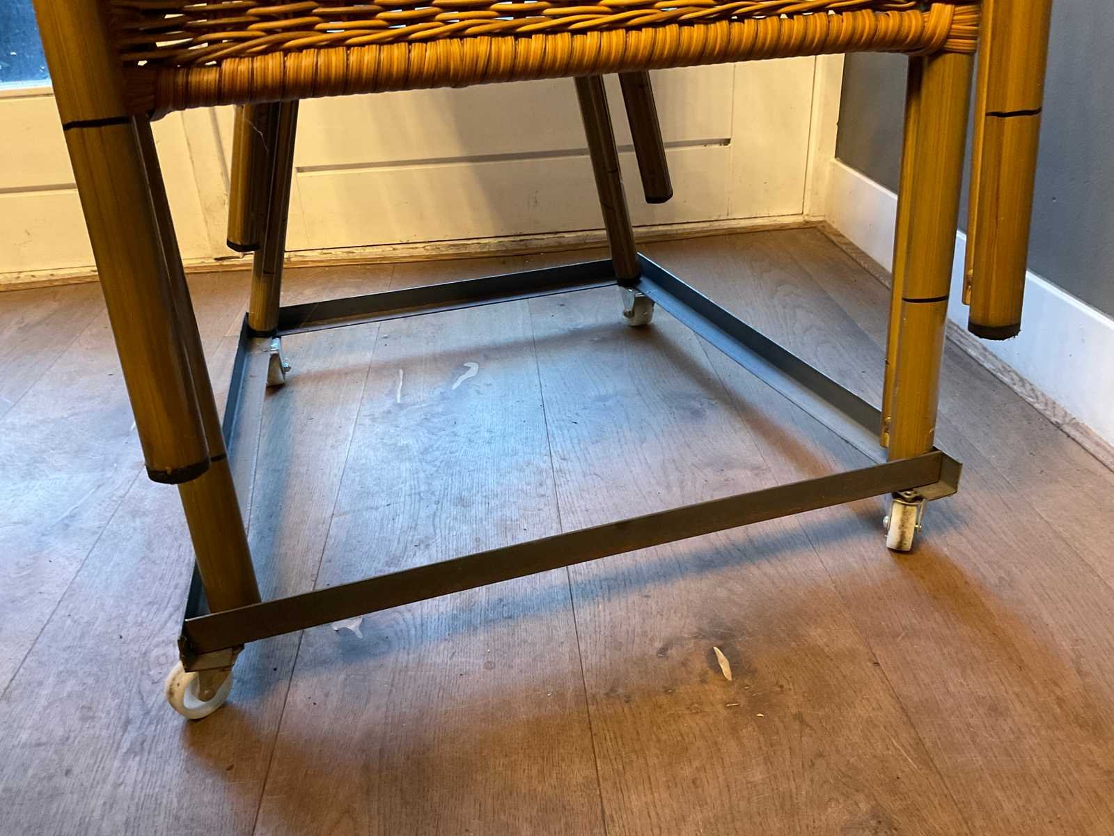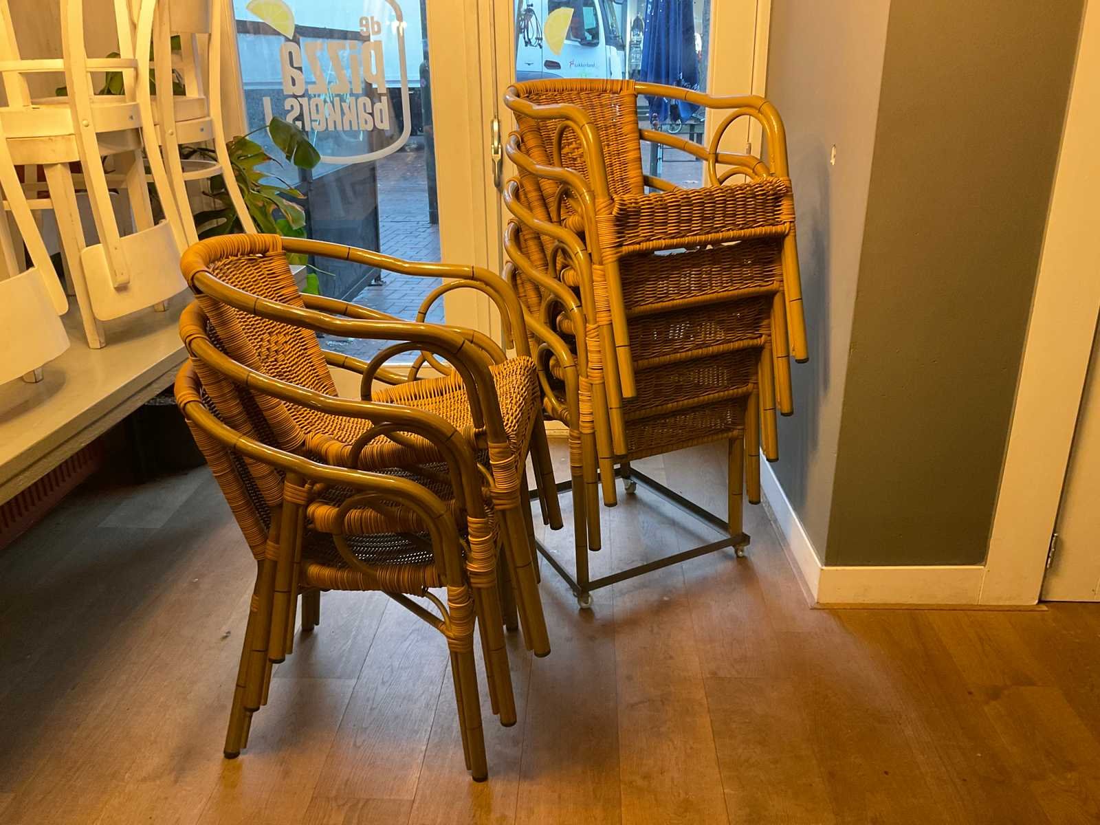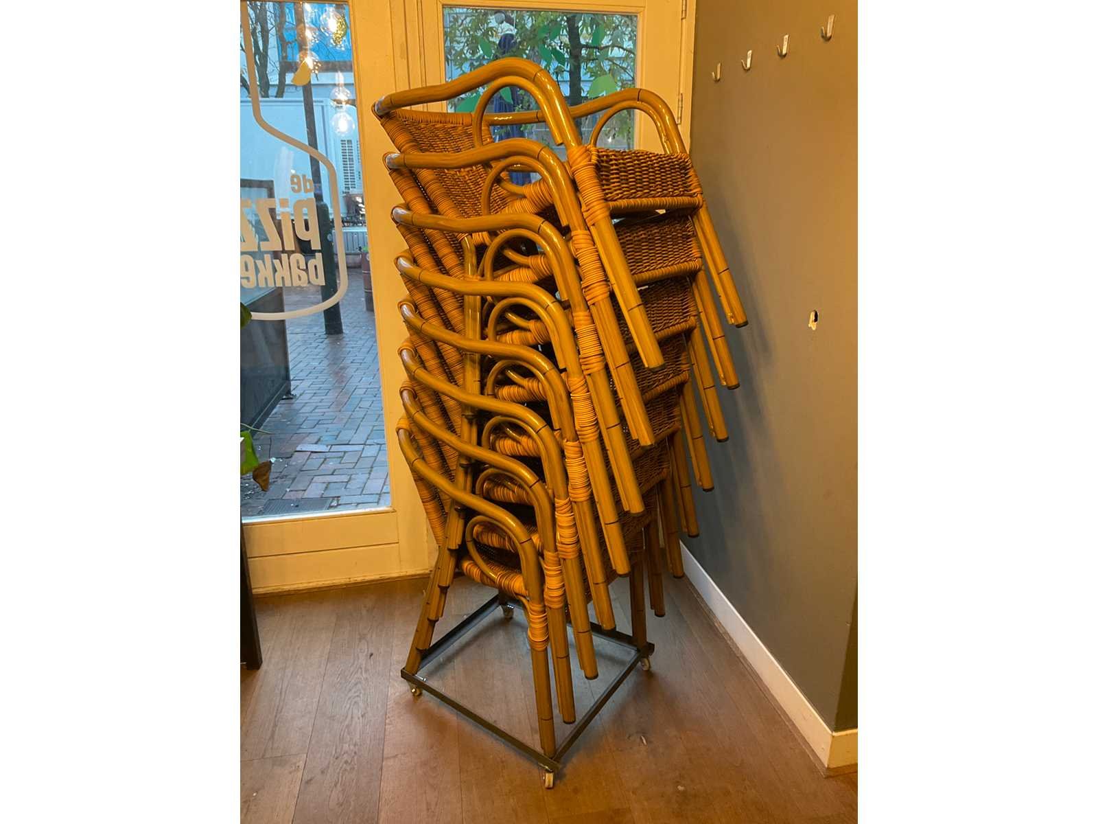 Stapelbare terras stoelen op verrijdbaar onderstel. Zithoogte ca. 46 cm Merk: Homint Lengte: 55cm Breedte: 60cm Hoogte: 80cm