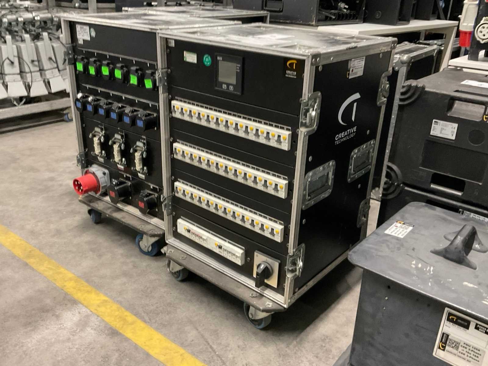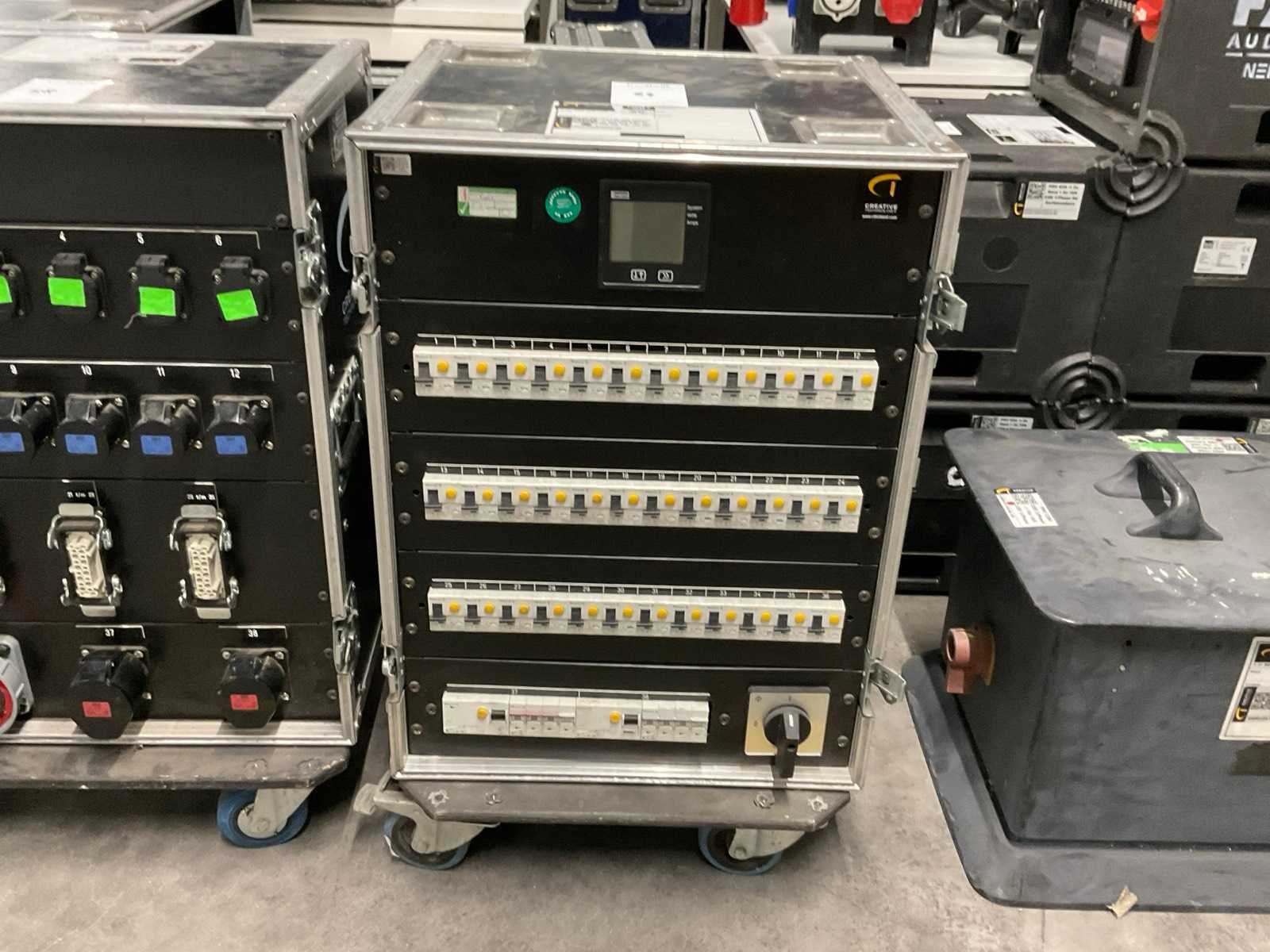 PDU 63A CEE; 3-fase; (3x) Harting 8-kanaals; (1x) 32Amp.; (1x) 16Amp 3-fase; (6x) 16Amp. 1-fase; (6x) Schuko; afm. ca. 515x500x880 mm