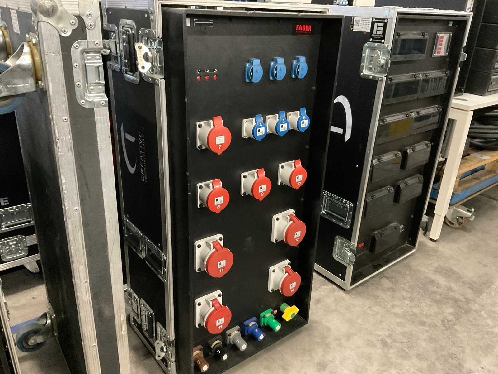 PDU Powerlock 400A type C-59; (4x) 63A CEE; (4x) 32A CEE; (3x) 16A 1-fase; (3x) Schuko; incl. mobiele flightcase Merk: Indu Electric / FABER