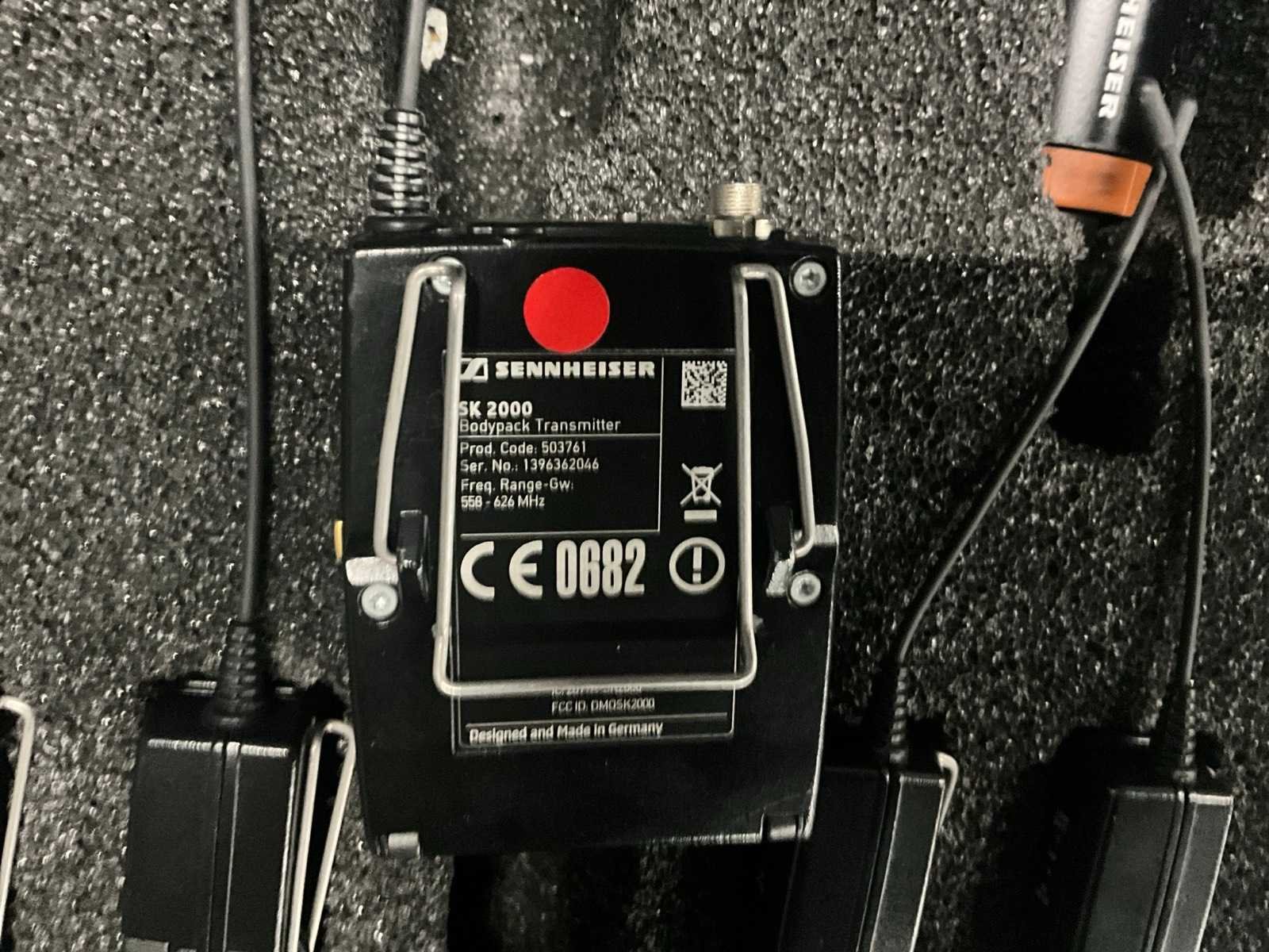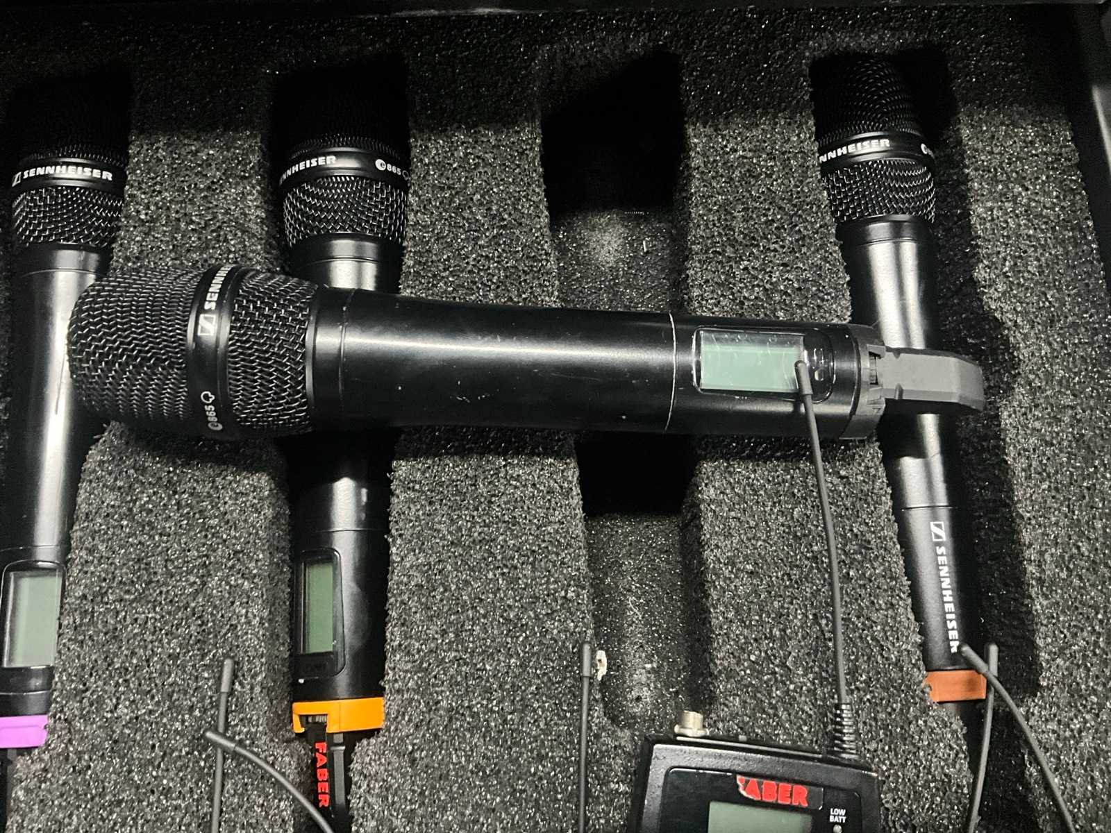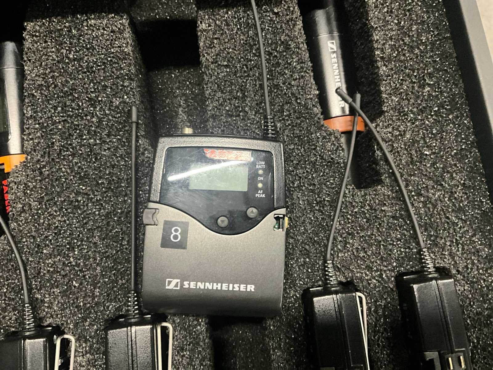 Voorzien van: 4x true diversity receiver EM-2050, 8x draadloze microfoons, 8x transmitter, 8x microfoon houder, kabels, flightcase. Merk: Sennheiser Microfoon model: true