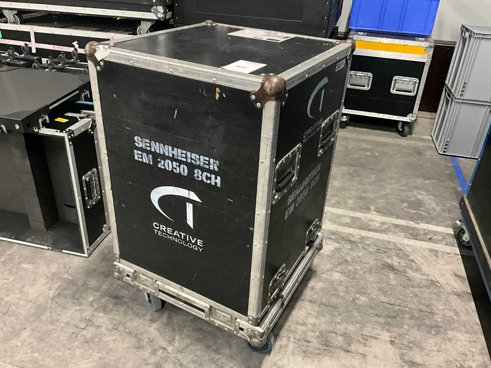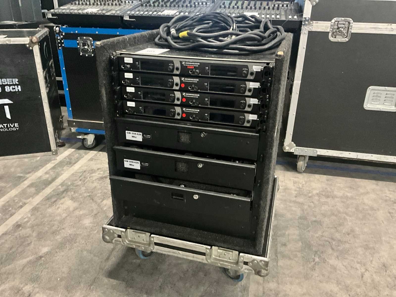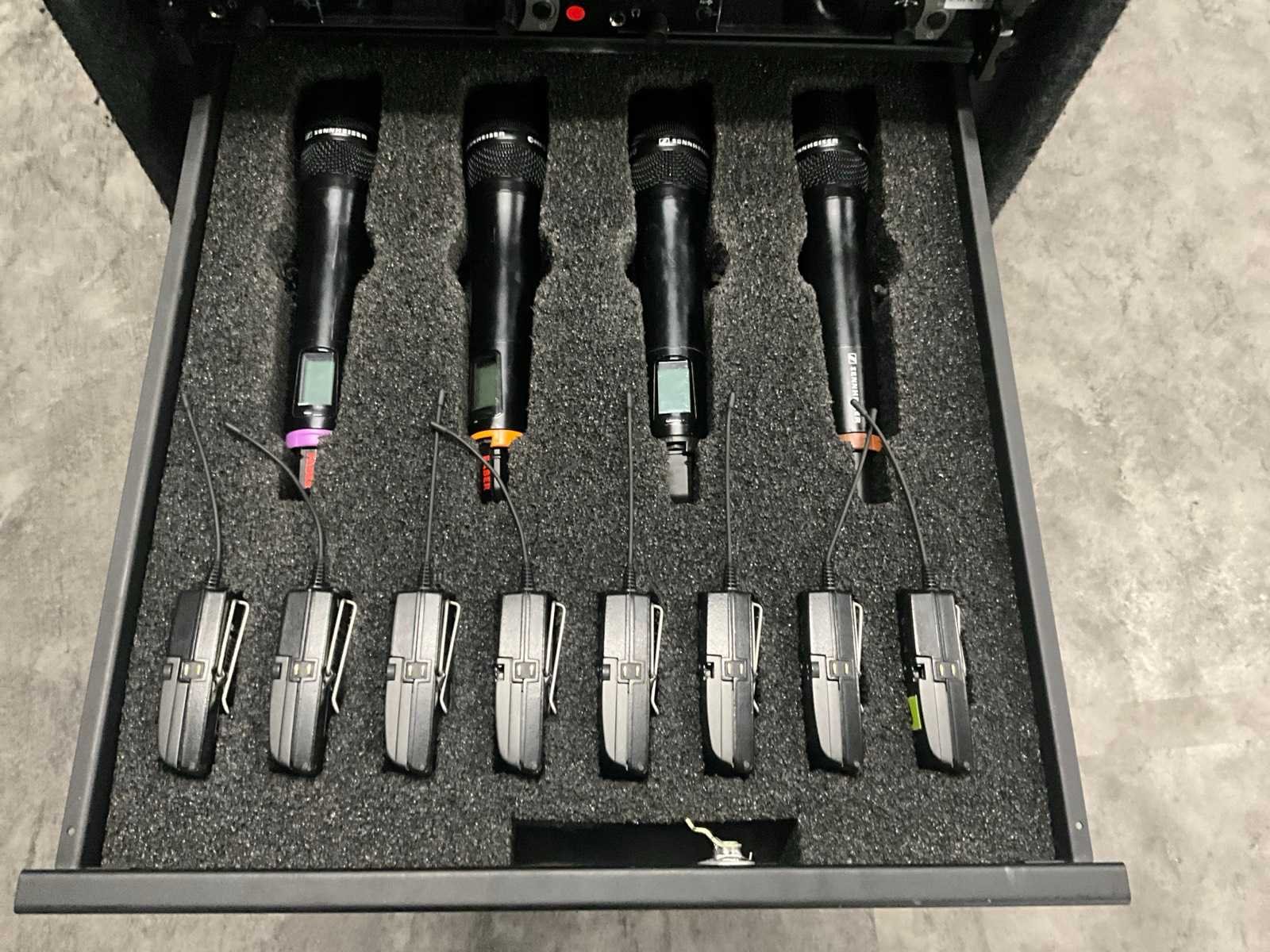 Voorzien van: 4x true diversity receiver EM-2050, 8x draadloze microfoons, 8x transmitter, 8x microfoon houder, kabels, flightcase. Merk: Sennheiser Microfoon model: true